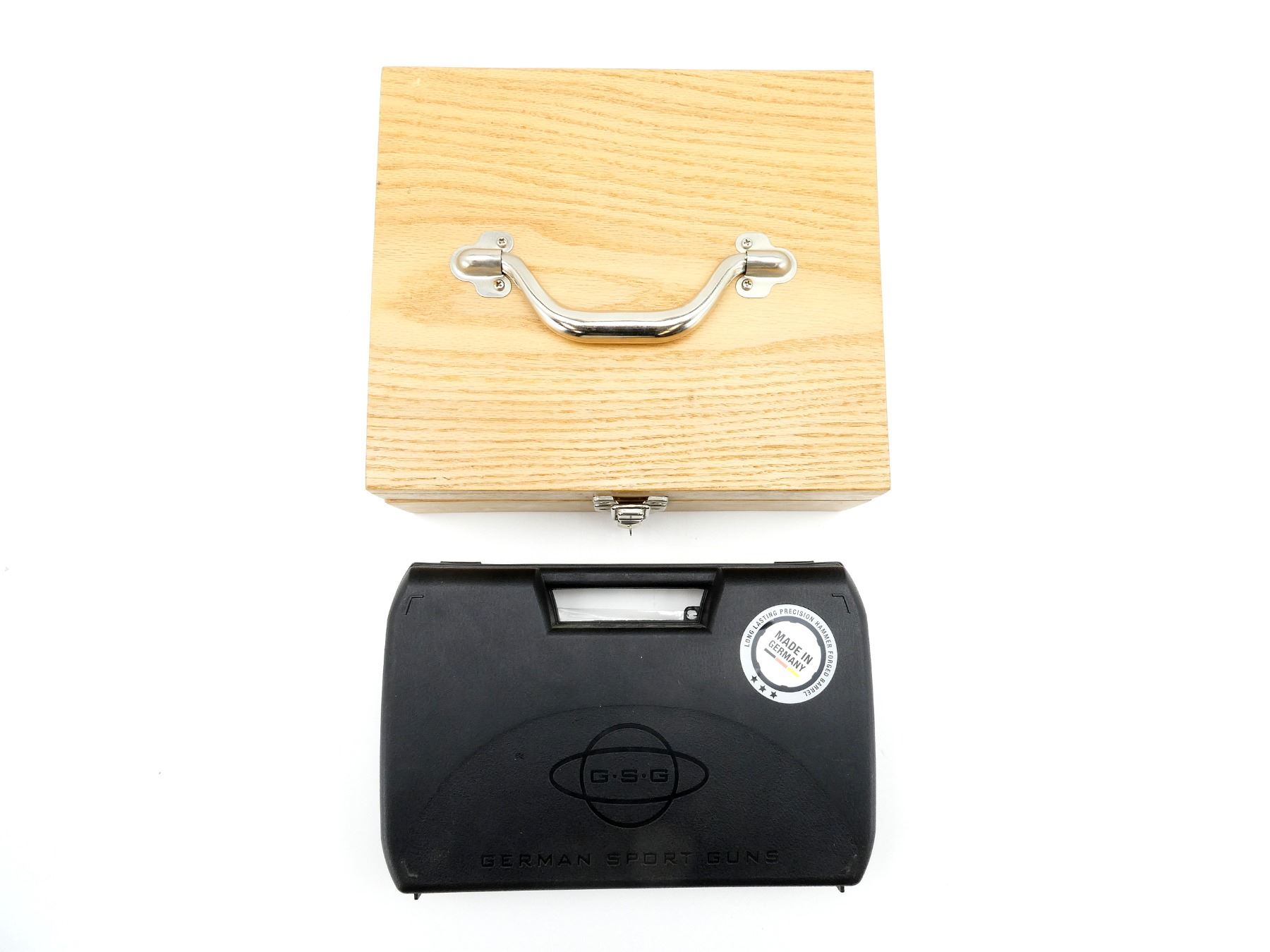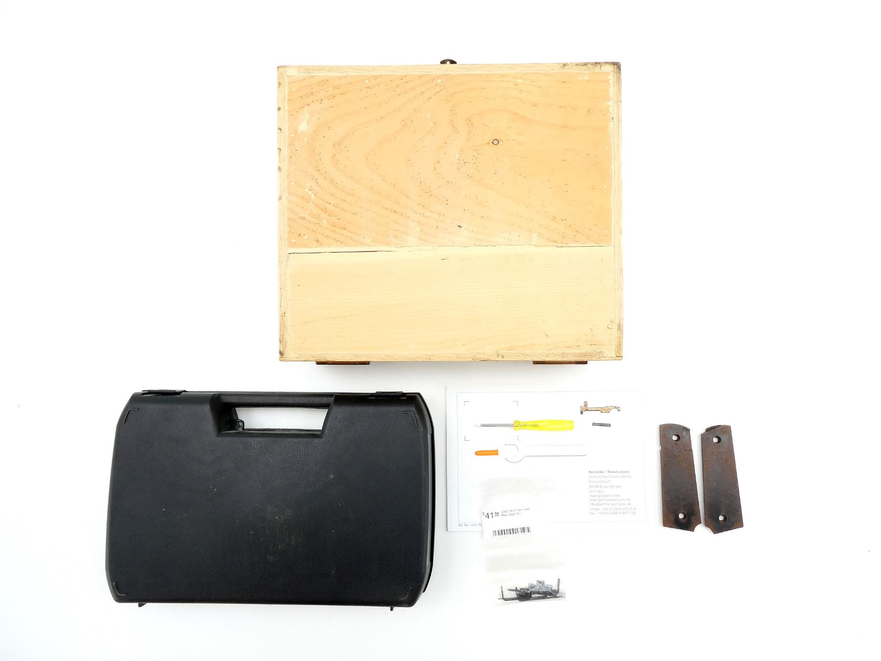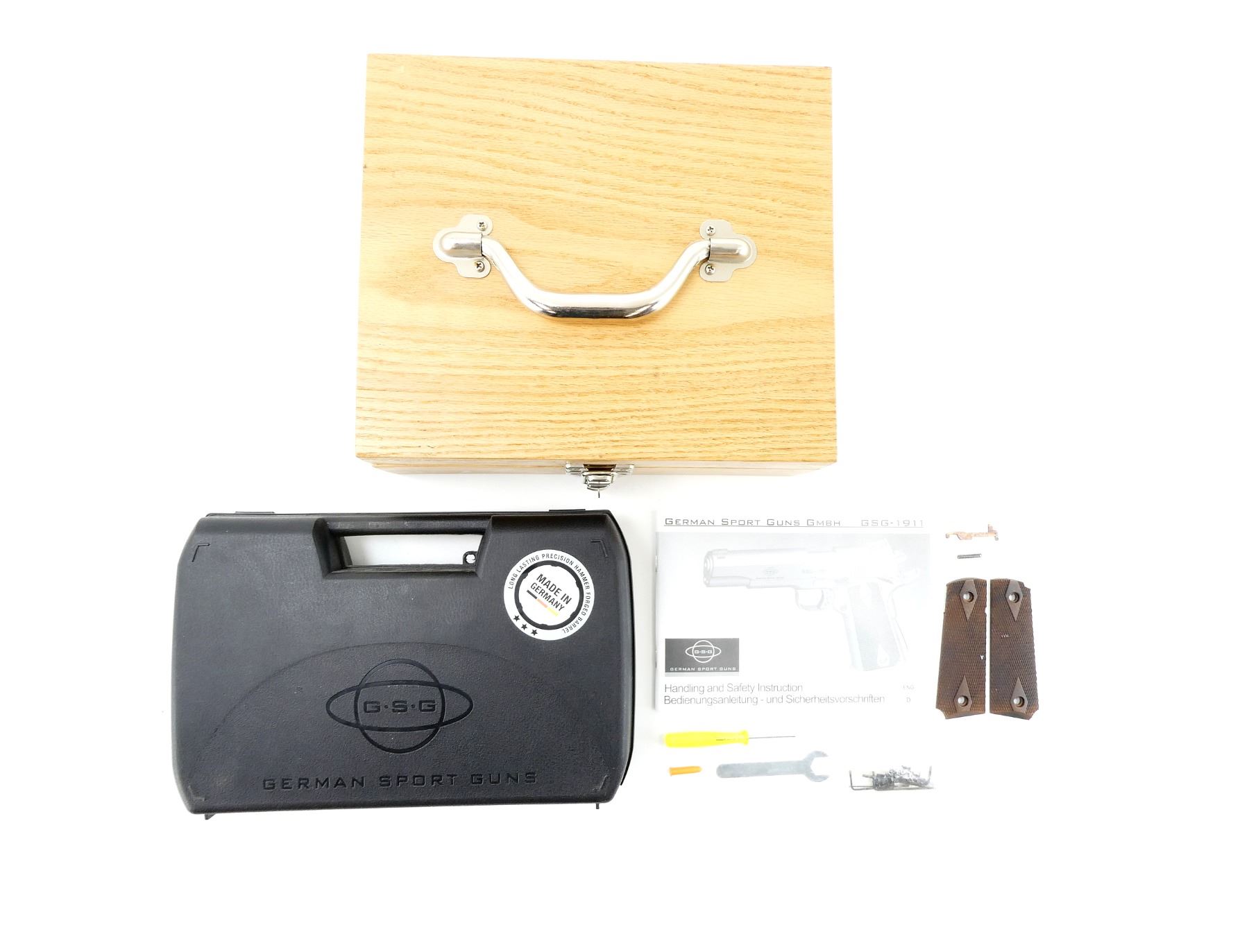 LOT INCLUDES; (1) GSG-1911 HARD PADDED HANDGUN CASE, CARRY HANDLE, (2) LATCHES, (1) GSG-1911 INSTRUCTION BOOK, (1) MAG SAFETY, (1) GSG 1911 FRONT AND REAR SIGHT KIT, (2) GRIPS, (1) SCREW DRIVER, (1) WRENCH, (1) WOODEN PADDED HANDGUN CASE, CARRY HANDLE, (1) LATCH, APPROX. OAL 11"-11 3/4", SHOWS WEAR AND TEAR FROM USAGE, SEE PHOTOS