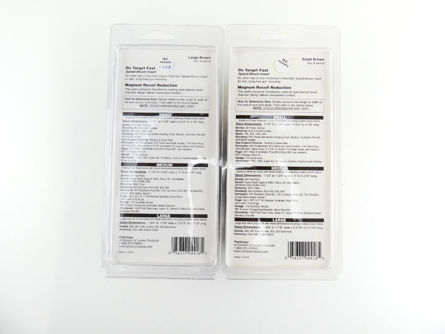 LOT INCLUDES; (2) SPEED-MOUNT INSERT RECOIL PADS, BROWN RUBBER, ONE LARGE / ONE SMALL, PART #: 04416 & 04418, NOS IN ORIGINAL SEALED PACKAGING. MAY REQUIRE FITTING. SEE PHOTOS.