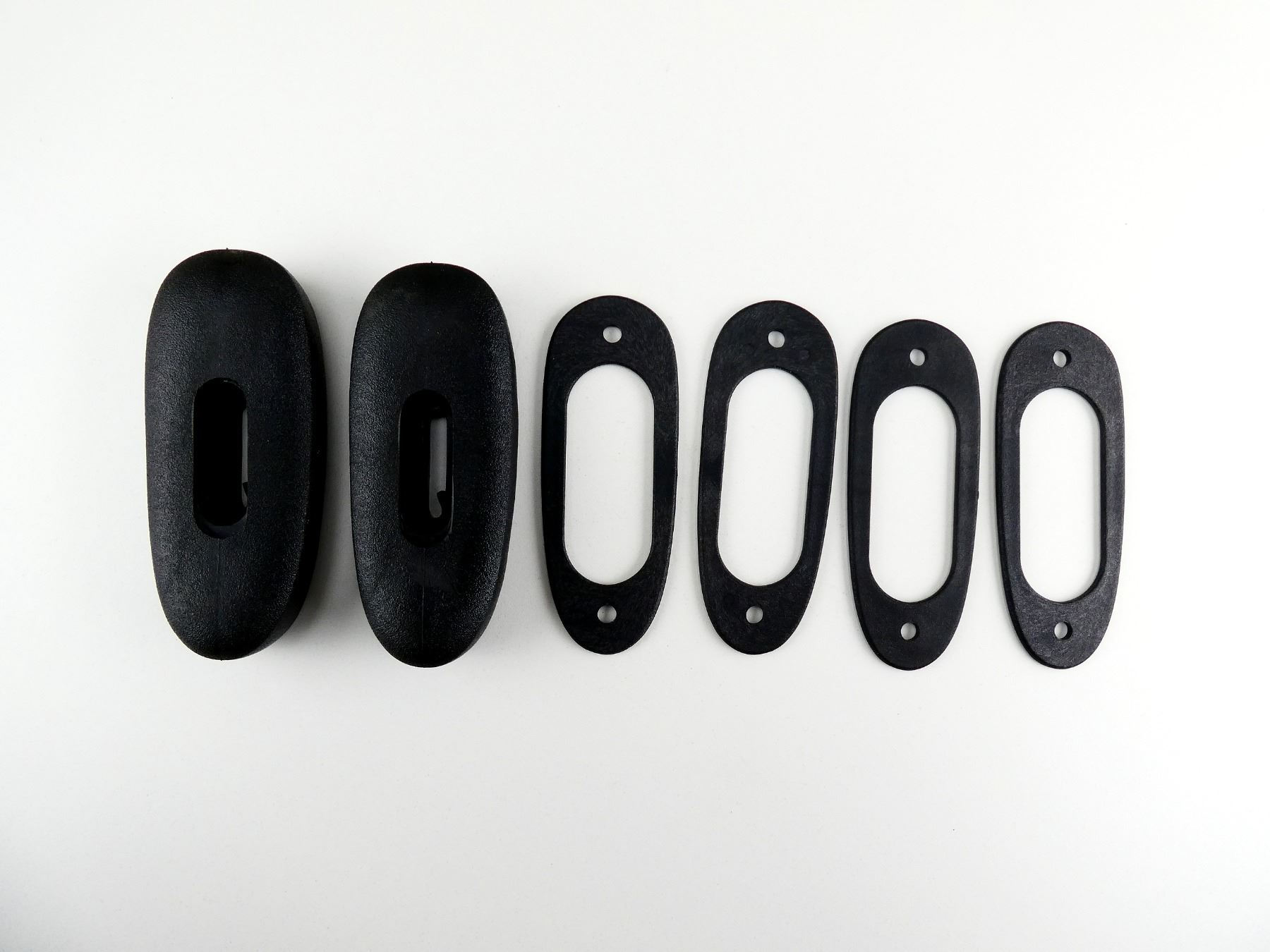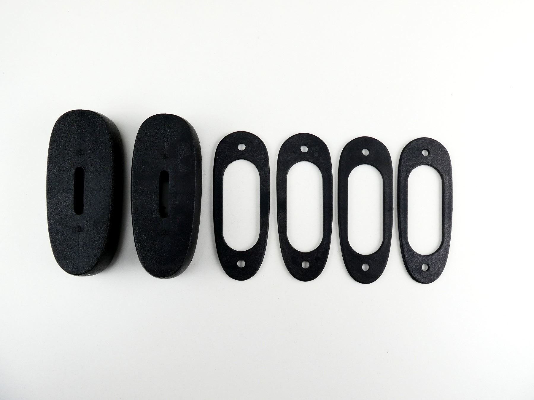 LOT INCLUDES; (2) UNKNOWN BLACK POLYMER BUTT PLATES, UNMARKED & (4) BLACK POLYMER SPACERS. MAY REQUIRE FITTING. SEE PHOTOS.