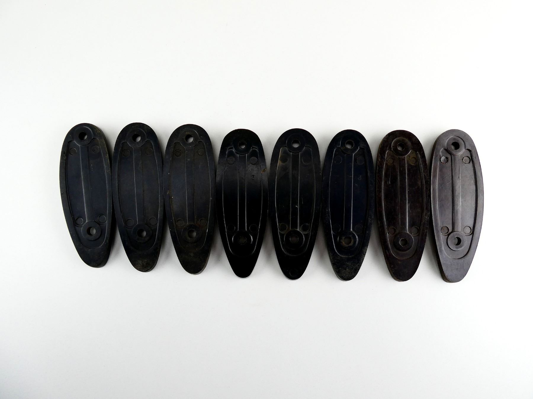 LOT INCLUDES; (8) EARLY STYLE BLACK POLYMER BUTT PLATES. MAY REQUIRE FITTING. SEE PHOTOS.