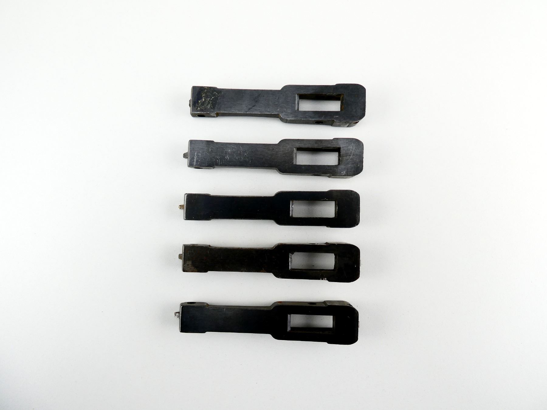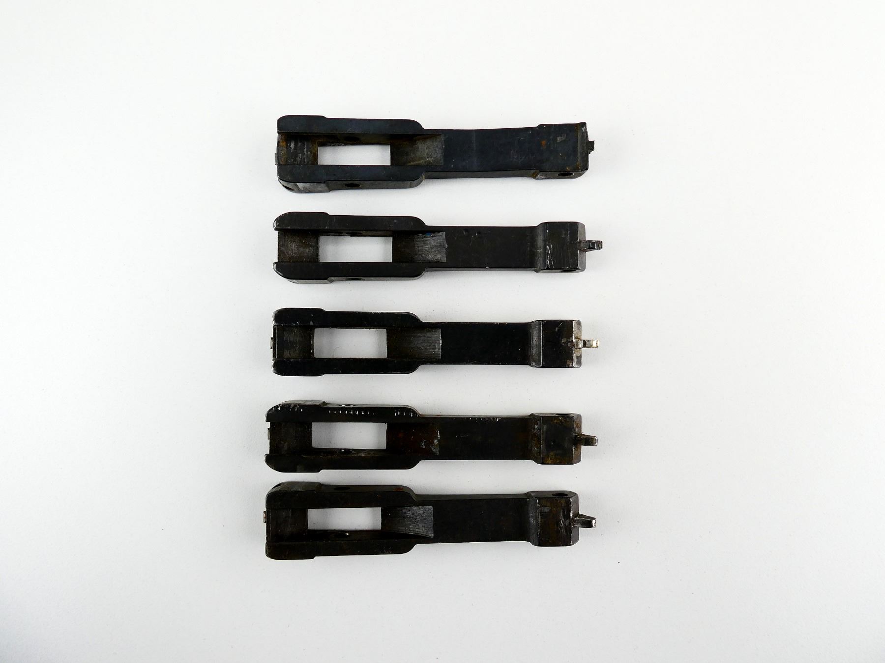 LOT INCLUDES; (5) BLUED STEEL LINKS, UNMARKED, OAL APPROX. 4". MAY REQUIRE FITTING AND / OR REPAIR. SEE PHOTOS.