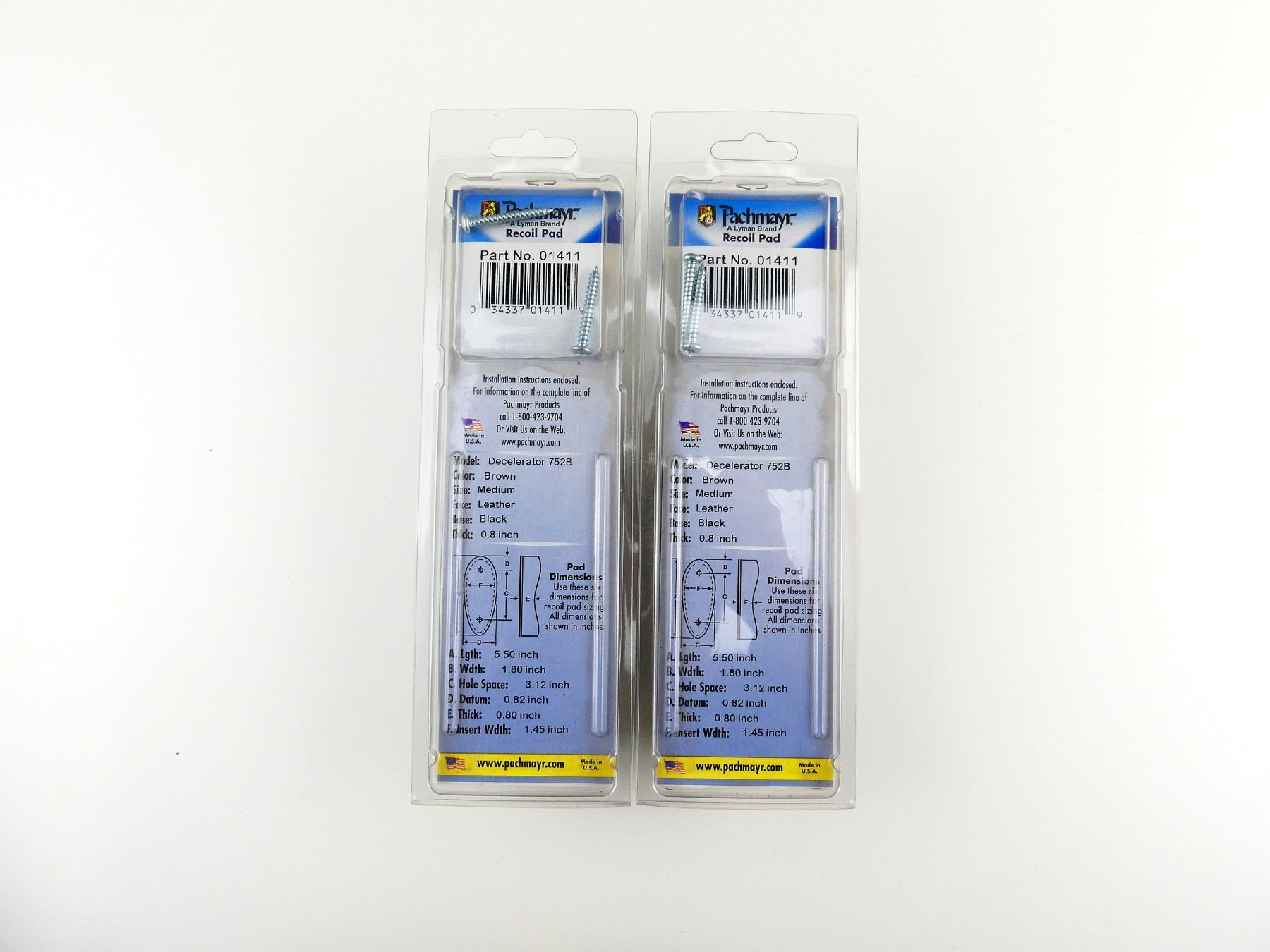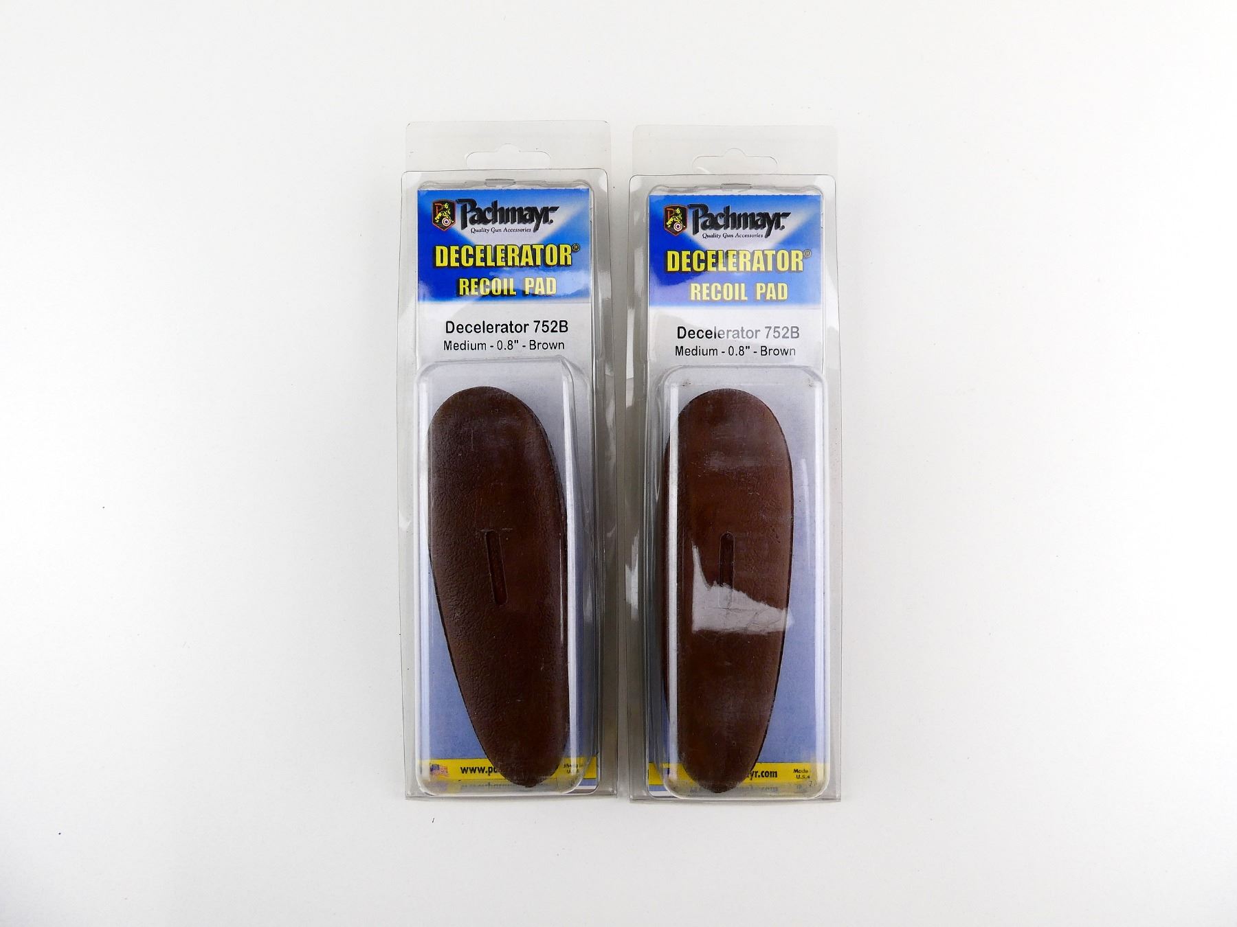 LOT INCLUDES; (2) BROWN LEATHER RECOIL PADS, MEDIUM 0.8", PART #: 01411, NOS IN ORIGINAL PACKAGING. MAY REQUIRE FITTING. SEE PHOTOS.
