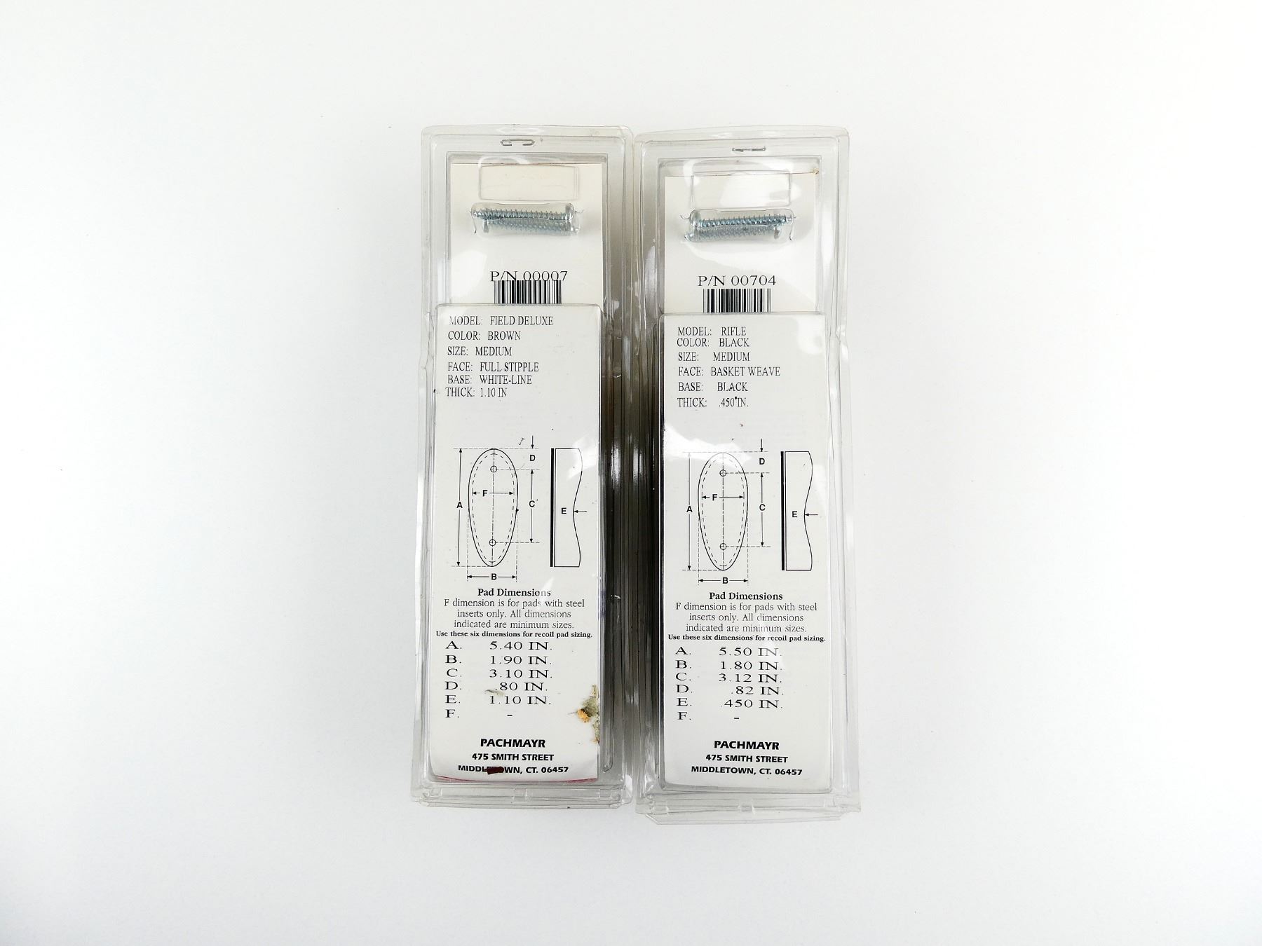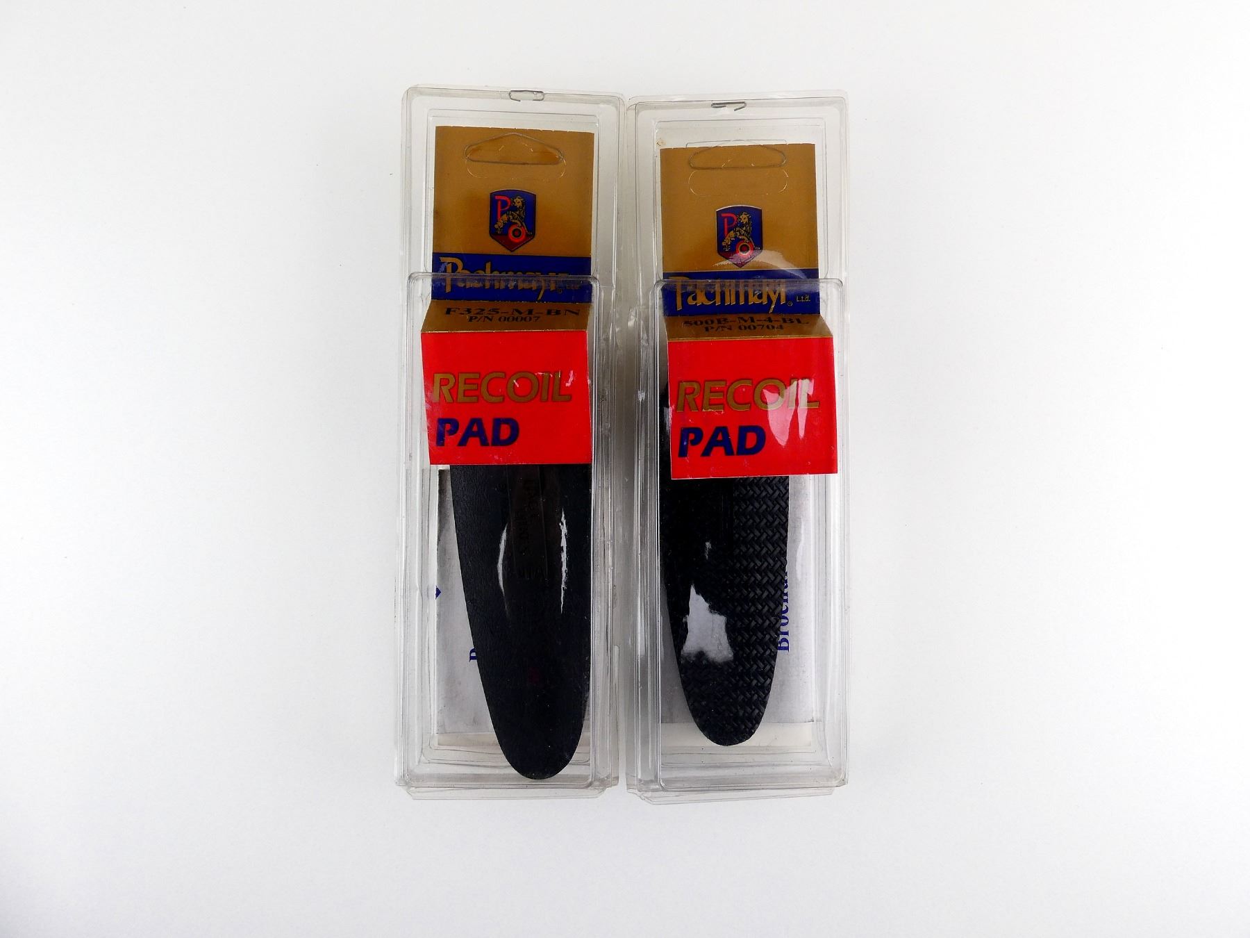 LOT INCLUDES; (1) BLACK LEATHER RECOIL PAD, PART #: F325-M-BN #00007, NOS IN ORIGINAL PACKAGING. MAY REQUIRE FITTING & (1) BLACK LEATHER RECOIL PAD, PART #: 500B-M-4-BL #00704, NOS IN ORIGINAL PACKAGING. MAY REQUIRE FITTING. SEE PHOTOS.