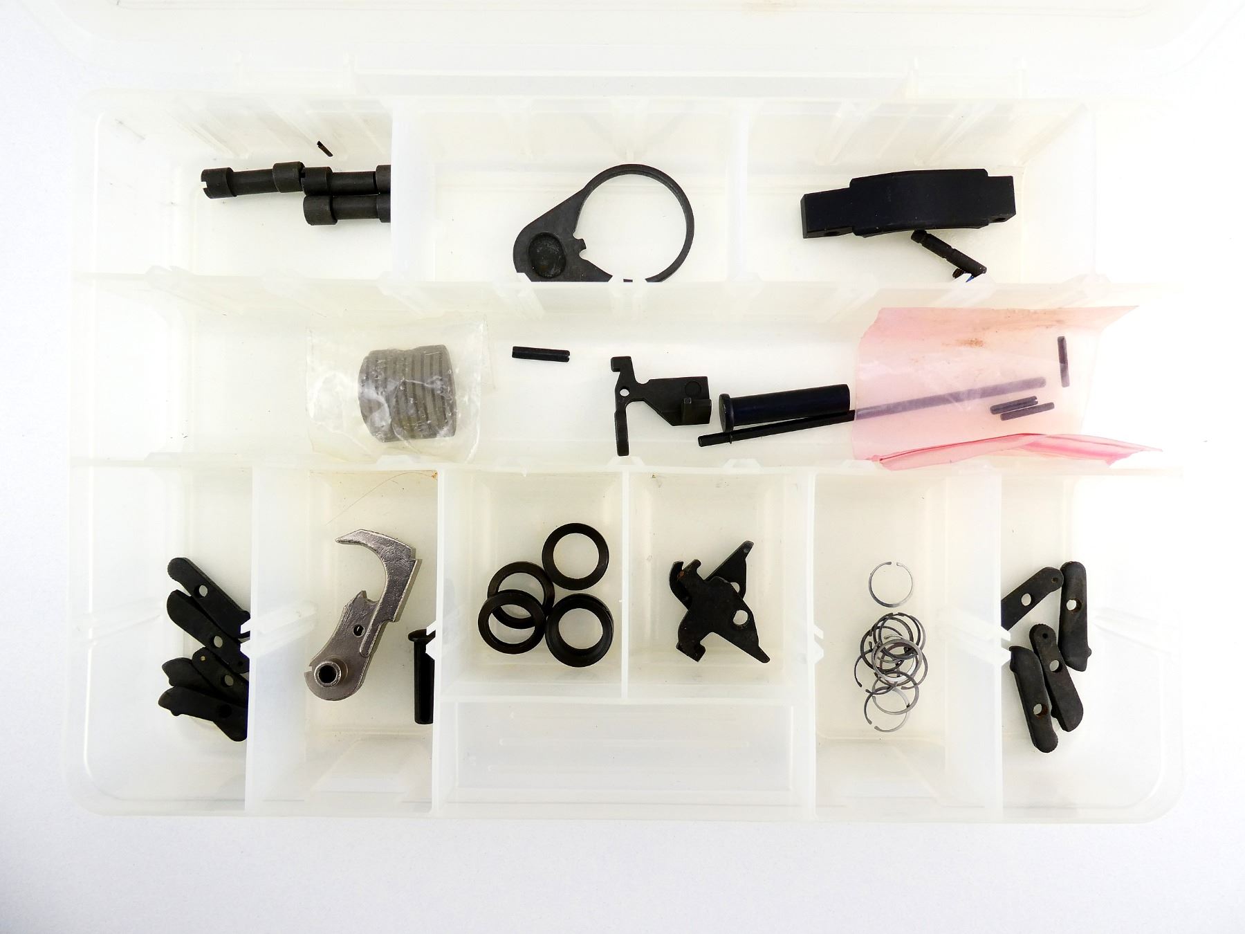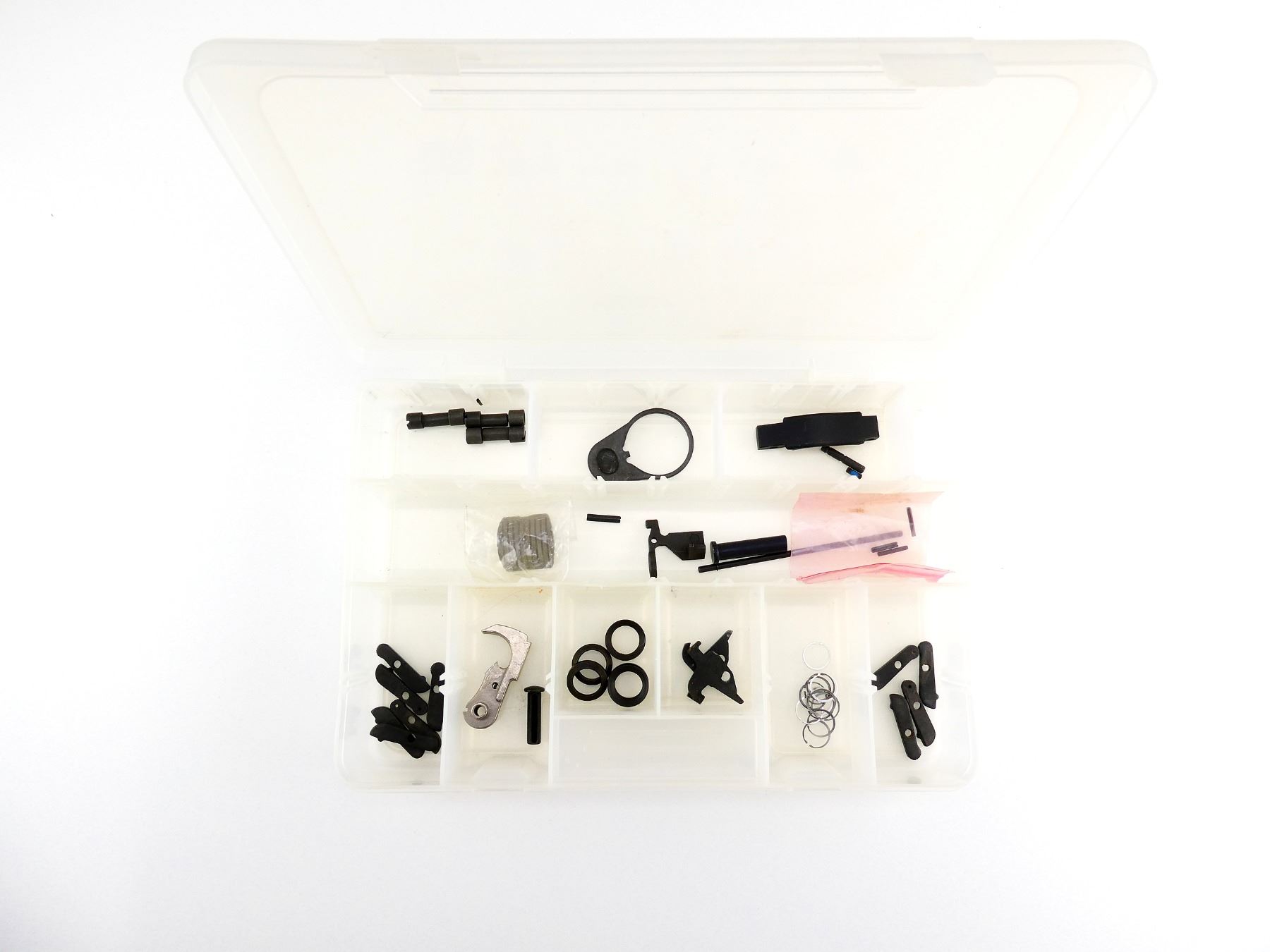 LOT INCLUDES; TRIGGER GUARD, BOLT STOP, M4 STOCK PLATE, BAYONET CATCHES, HAMMER, DISCONNECTORS, CRUSH WASHERS, GAS RINGS, PINS, ETC. MAY REQUIRE FITTING. SEE PHOTOS.