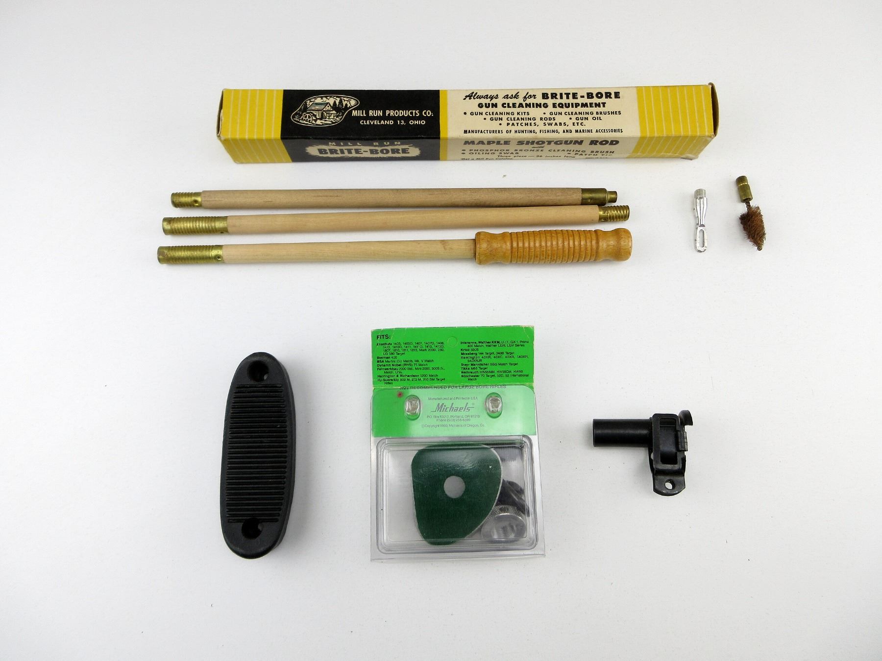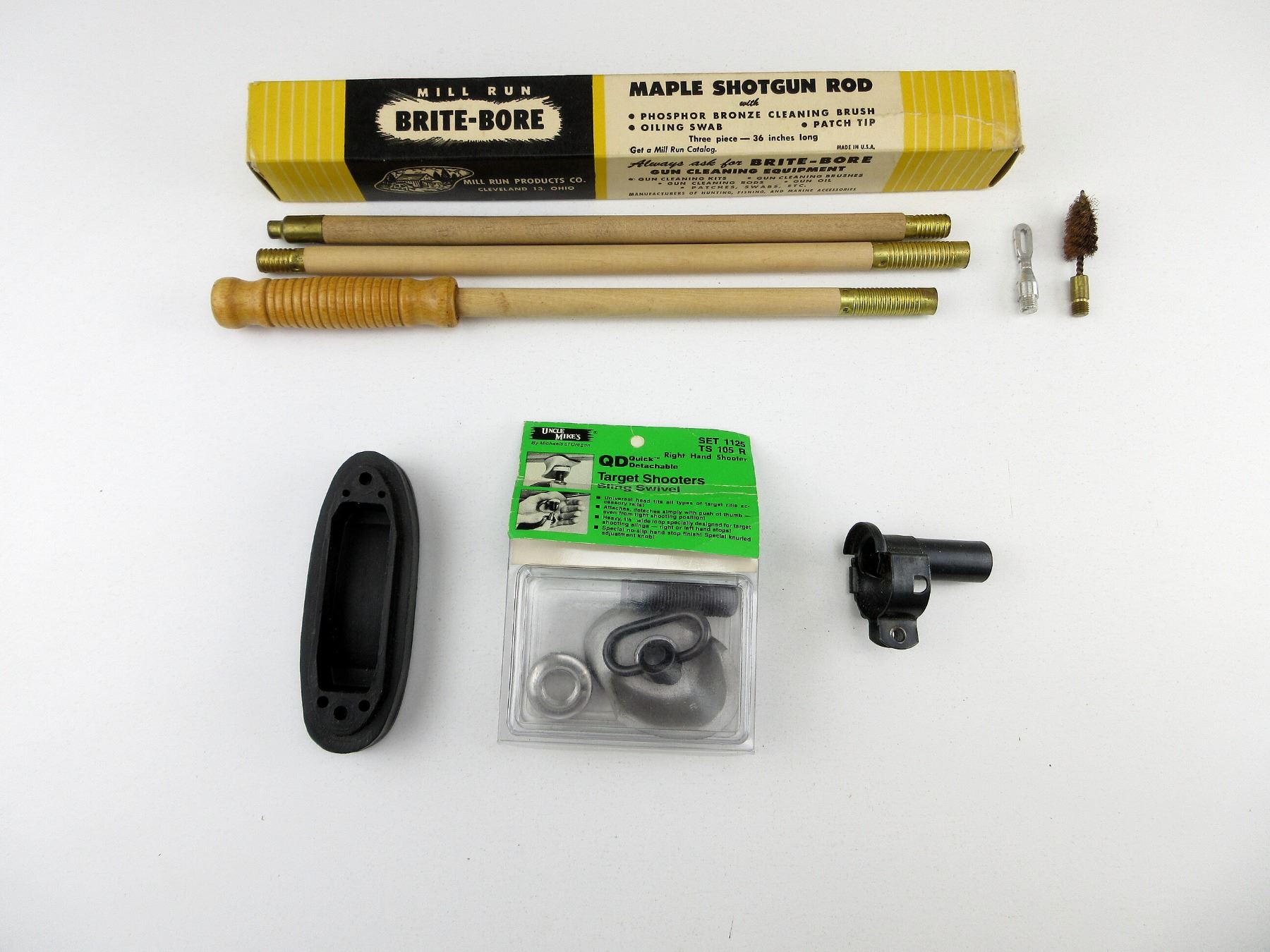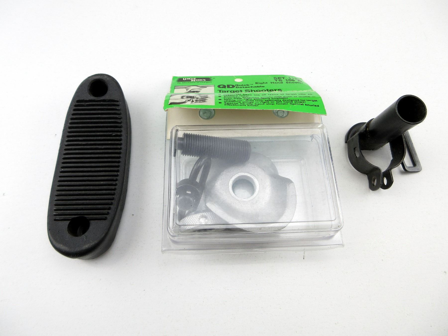 LOT INCLUDES; UNKNOWN BLACK POLYMER BUTT PLATE, WIDTH APPROX. 1.75", OAL APPROX. 5", UNCLE MIKE'S QD TARGET SHOOTERS SING SWIVEL, RIGHT-HAND SHOOTER, APPEARS NOS, BRITE-BORE MAPLE SHOTGUN CLEANING ROD, ETC. MAY REQUIRE FITTING. SEE PHOTOS.