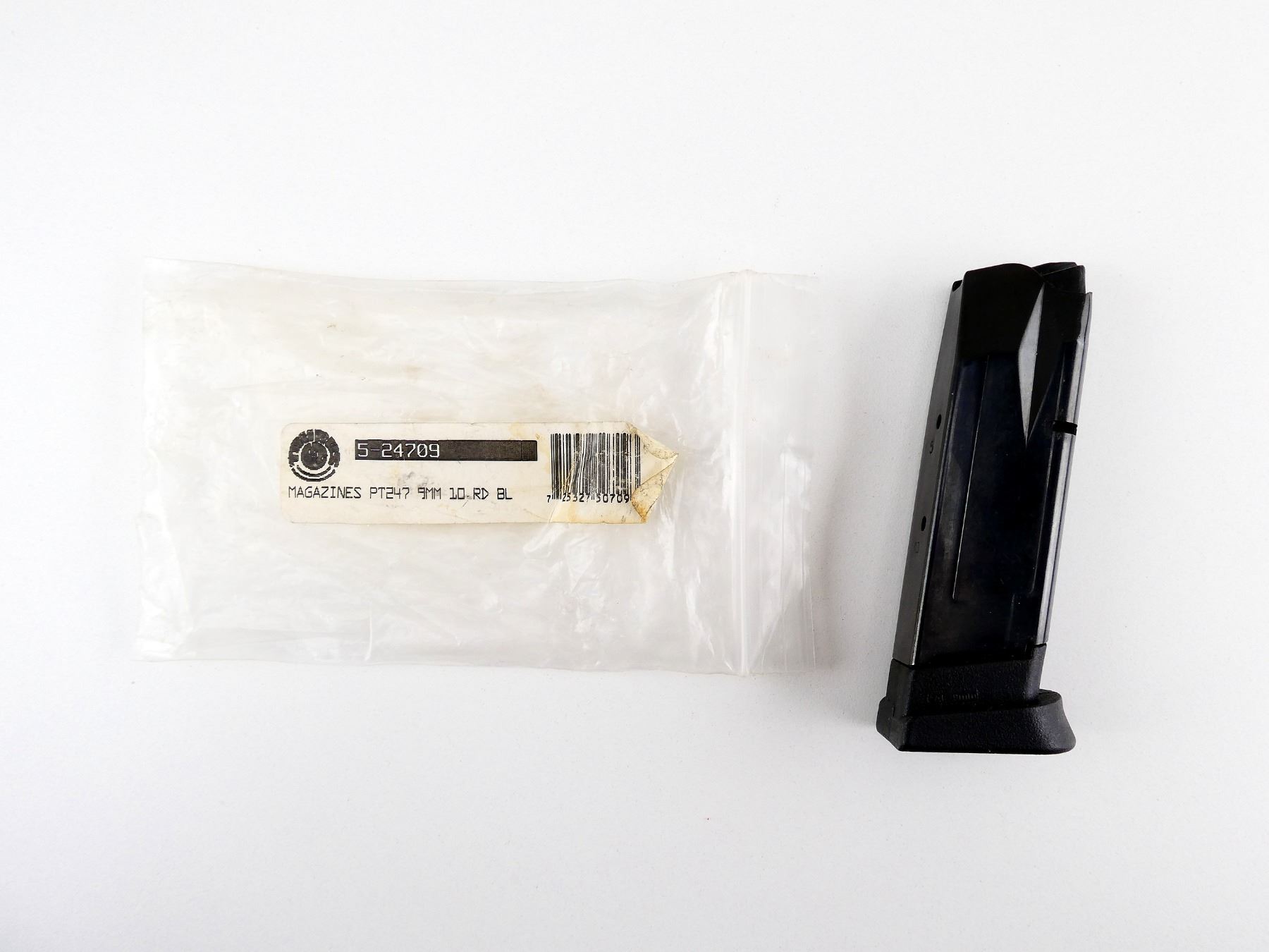 (1) 9MM PARABELLUM MAG, 10 RNDS, BLUED STEEL CONSTRUCTION, MARKED: "CAL. 9 PARA MADE IN BRAZIL", BASE MARKED: "PT 24/7" & TAURUS LOGO, APPEARS NOS WITH ORIGINAL PACKAGING. SEE PHOTOS. PAL REQUIRED.