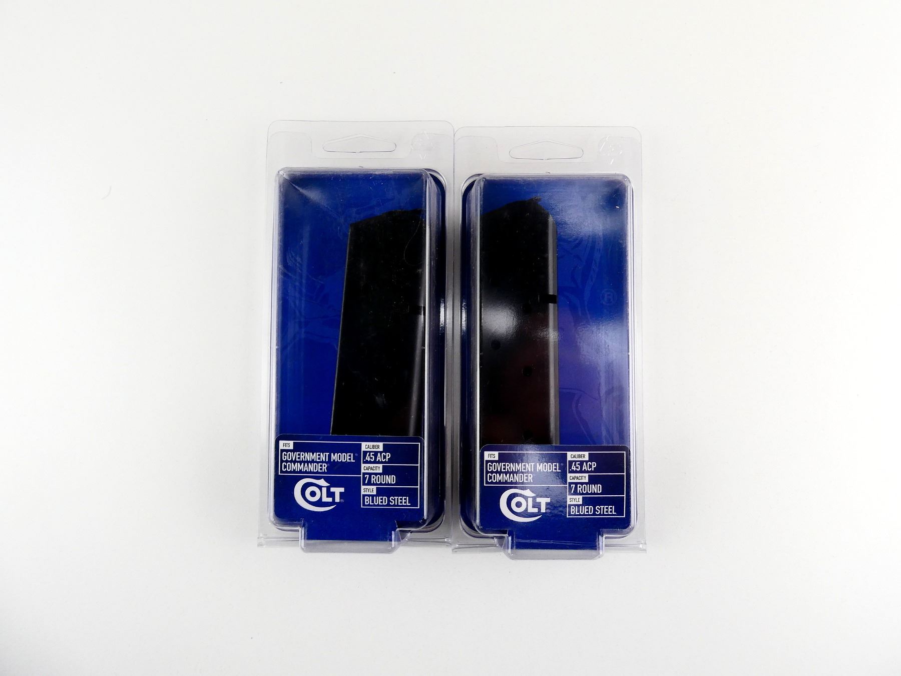 LOT INCLUDES; (2) 1911 .45 ACP MAGS, 7 RNDS, BLUED STEEL CONSTRUCTION, MARKED: "45 ACP", "COLT, 45 AUTO", ETC., APPEARS NOS IN ORIGINAL PACKAGING, COLT PART #: SP53355B-RP. SEE PHOTOS. PAL REQUIRED.