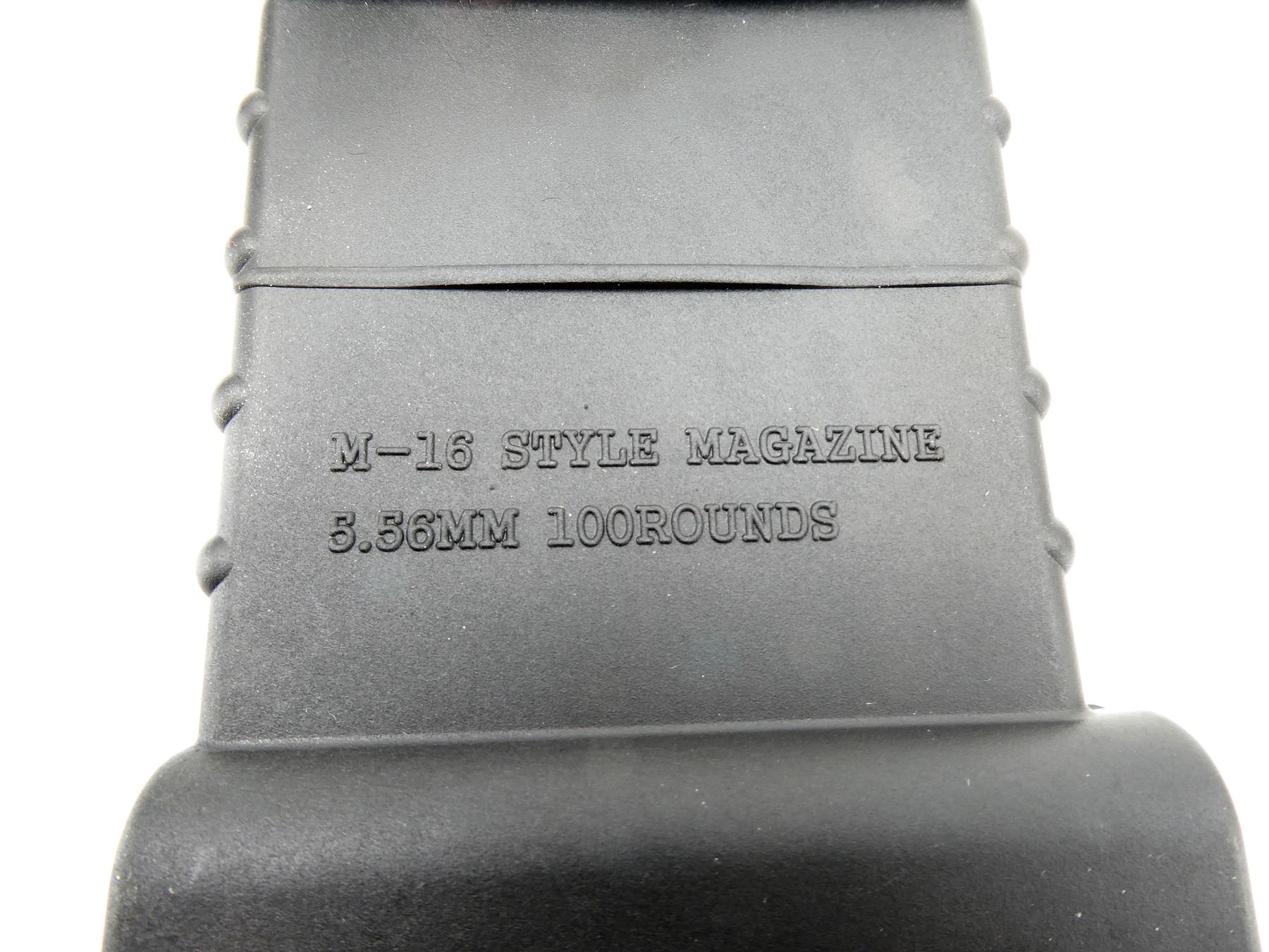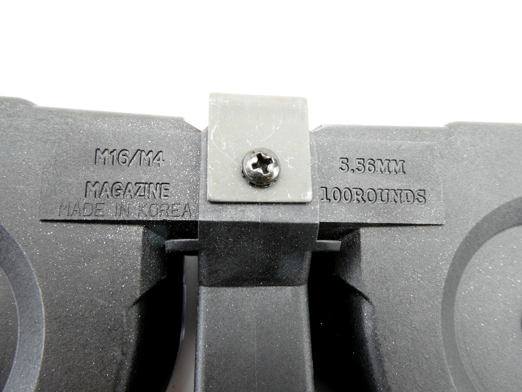 (1) 5.56MM, 5/100 ROUND PINNED MAG, BLACK POLYMER CONSTRUCTION, MARKED: "M16 / M4 MAGAZINE, 5.56MM, 100 ROUNDS MADE IN KOREA", WITH BLACK POLYMER MAG LOADER, BLACK NYLON CARRY CASE, INSTRUCTION & ORIGINAL PACKAGING (PACKAGING OPENED FOR PHOTOS). SEE PHOTOS. PAL REQUIRED.