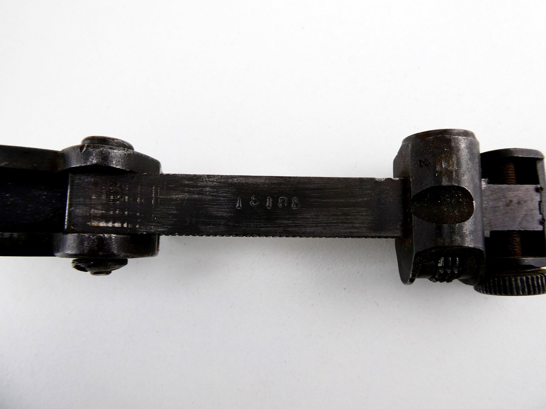 (1) REAR SIGHT & BASE, BLUED STEEL, MARKED: "18185". MAY REQUIRE FITTING. SEE PHOTOS.