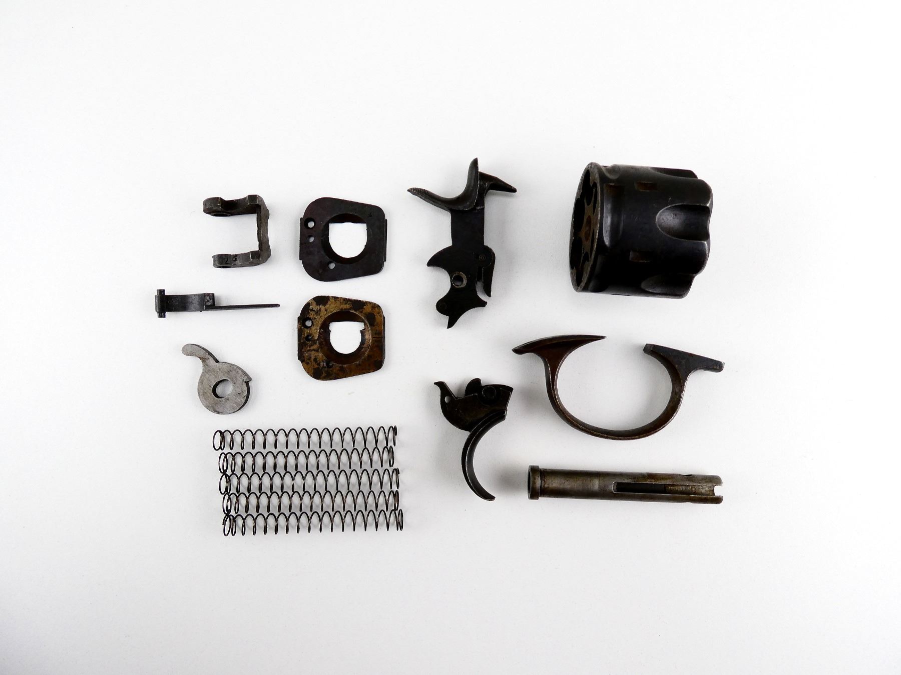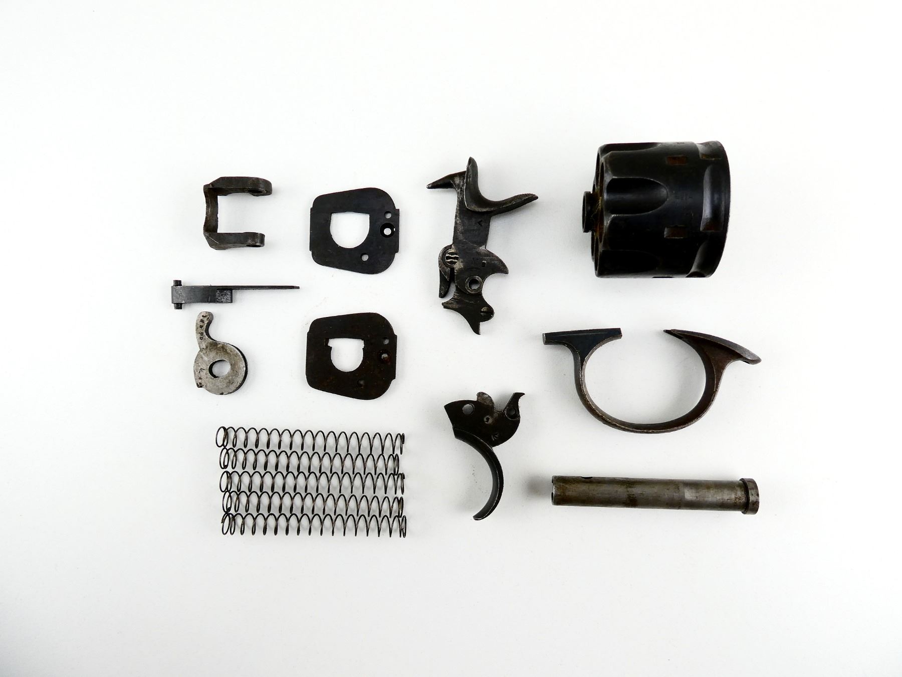 FITS .455 WEBLEY LARGE FRAME, LOT INCLUDES; HAMMER ASSEMBLY, TRIGGER, TRIGGER GUARD, (2) RECOIL PLATES, EXTRACTOR LEVER, CYLINDER CAM, AUXILIARY MAINSPRING, CYLINDER AXIS PIN, (4) EXTRACTOR SPRINGS, (1) .455 CYLINDER, ETC. MAY REQUIRE FITTING. SEE PHOTOS.