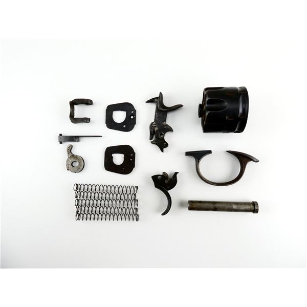 FITS .455 WEBLEY LARGE FRAME, LOT INCLUDES; HAMMER ASSEMBLY, TRIGGER, TRIGGER GUARD, (2) RECOIL PLATES, EXTRACTOR LEVER, CYLINDER CAM, AUXILIARY MAINSPRING, CYLINDER AXIS PIN, (4) EXTRACTOR SPRINGS, (1) .455 CYLINDER, ETC. MAY REQUIRE FITTING. SEE PHOTOS.