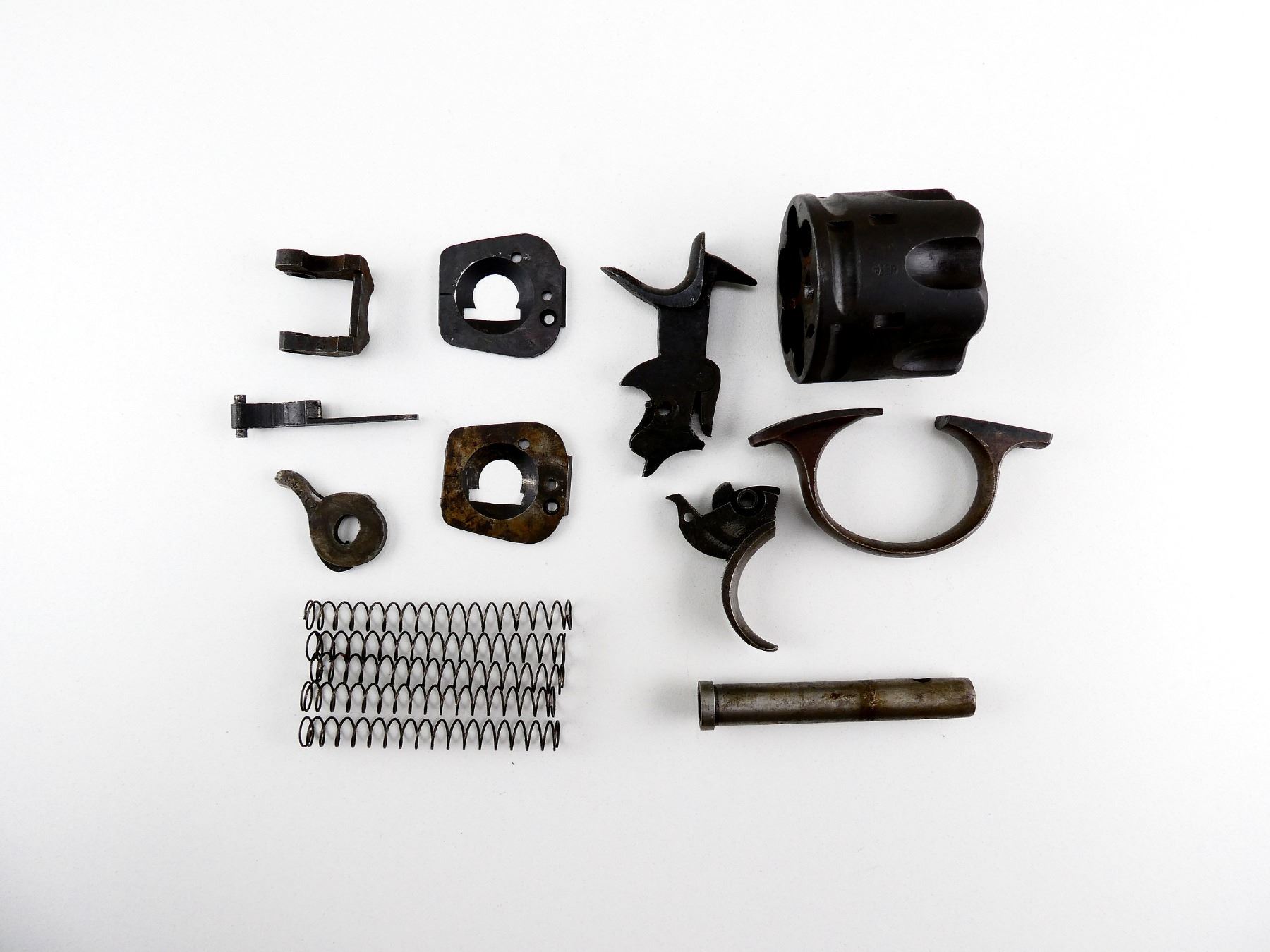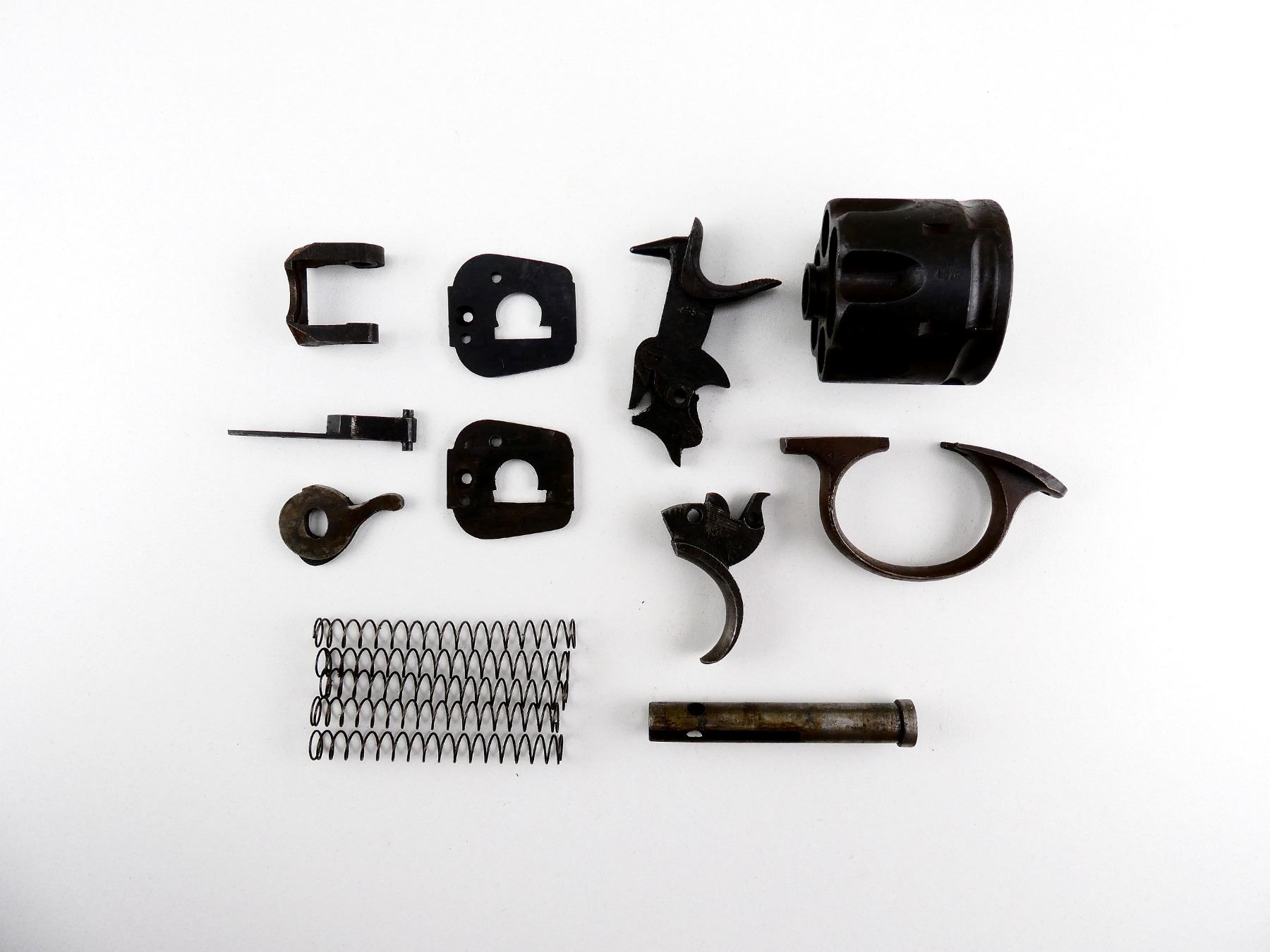 FITS .455 WEBLEY LARGE FRAME, LOT INCLUDES; HAMMER ASSEMBLY, TRIGGER, TRIGGER GUARD, (2) RECOIL PLATES, EXTRACTOR LEVER, CYLINDER CAM, AUXILIARY MAINSPRING, CYLINDER AXIS PIN, (4) EXTRACTOR SPRINGS, (1) .455 CYLINDER, ETC. MAY REQUIRE FITTING. SEE PHOTOS.