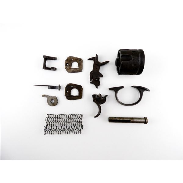FITS .455 WEBLEY LARGE FRAME, LOT INCLUDES; HAMMER ASSEMBLY, TRIGGER, TRIGGER GUARD, (2) RECOIL PLATES, EXTRACTOR LEVER, CYLINDER CAM, AUXILIARY MAINSPRING, CYLINDER AXIS PIN, (4) EXTRACTOR SPRINGS, (1) .455 CYLINDER, ETC. MAY REQUIRE FITTING. SEE PHOTOS.