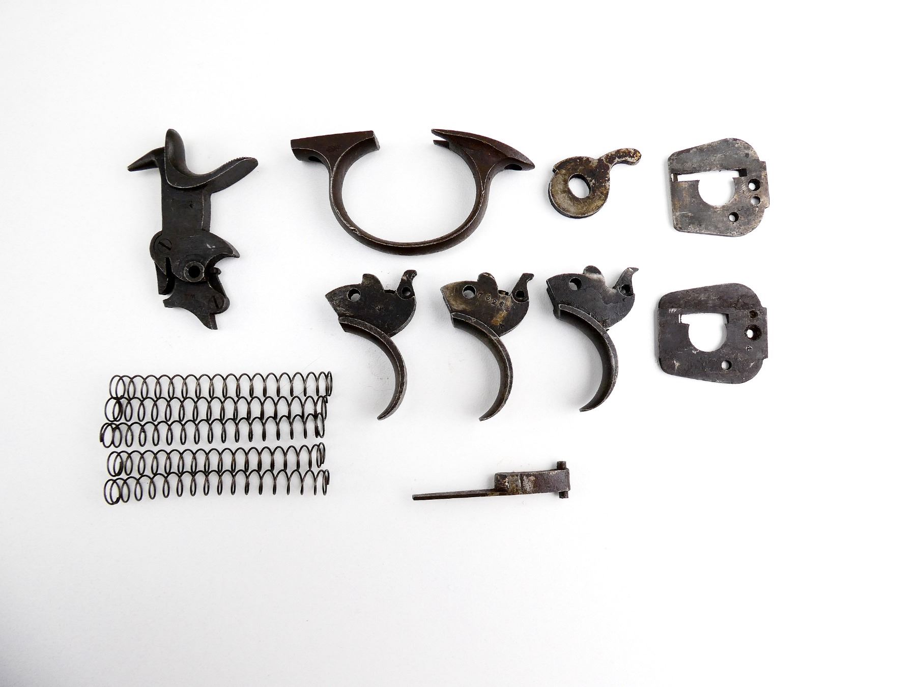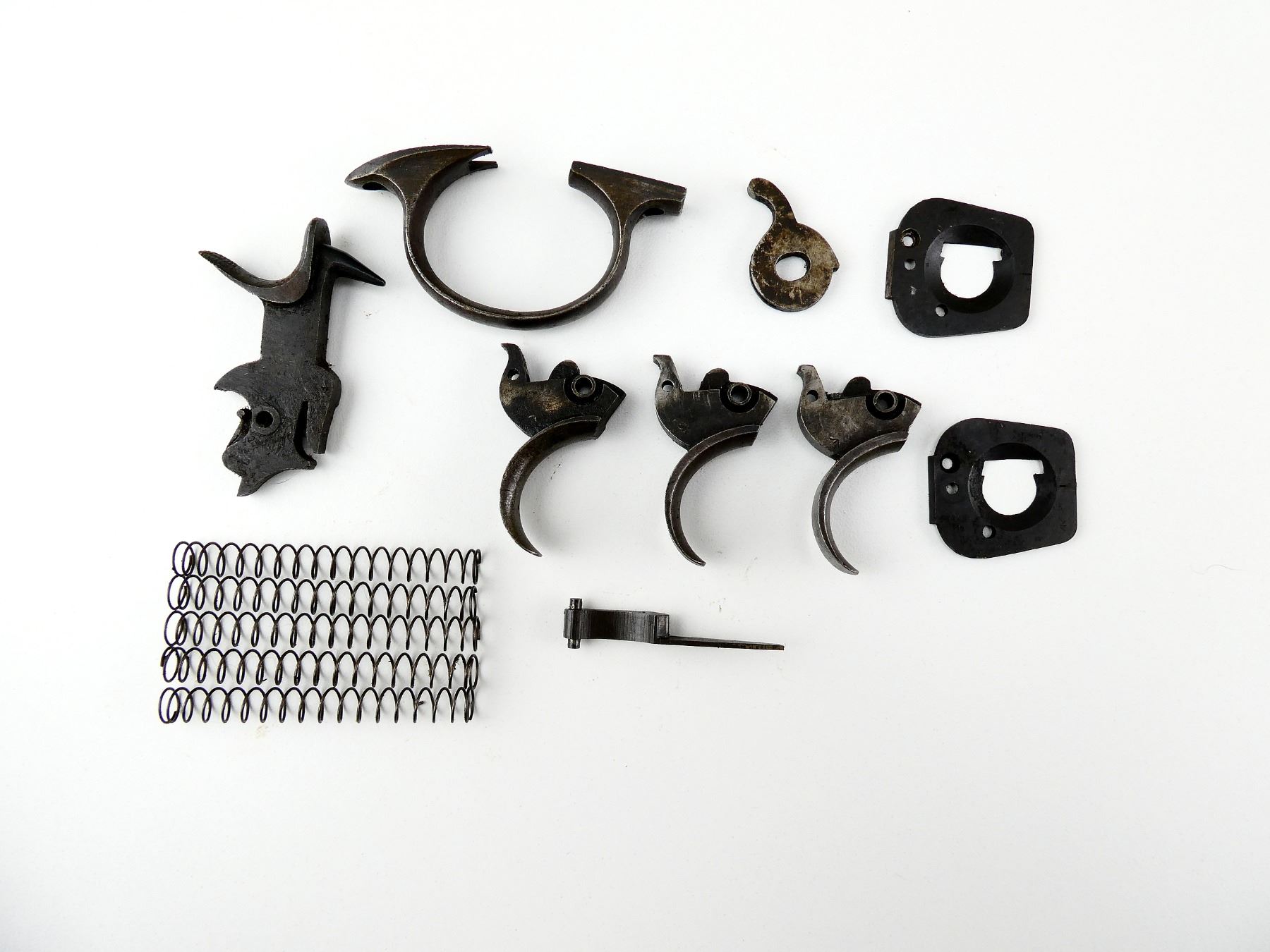 FITS .455 WEBLEY LARGE FRAME, LOT INCLUDES; HAMMER ASSEMBLY, HAND, (3) TRIGGERS, TRIGGER GUARD, (2) RECOIL PLATES, EXTRACTOR LEVER, (5) EXTRACTOR SPRINGS, ETC. MAY REQUIRE FITTING. SEE PHOTOS.