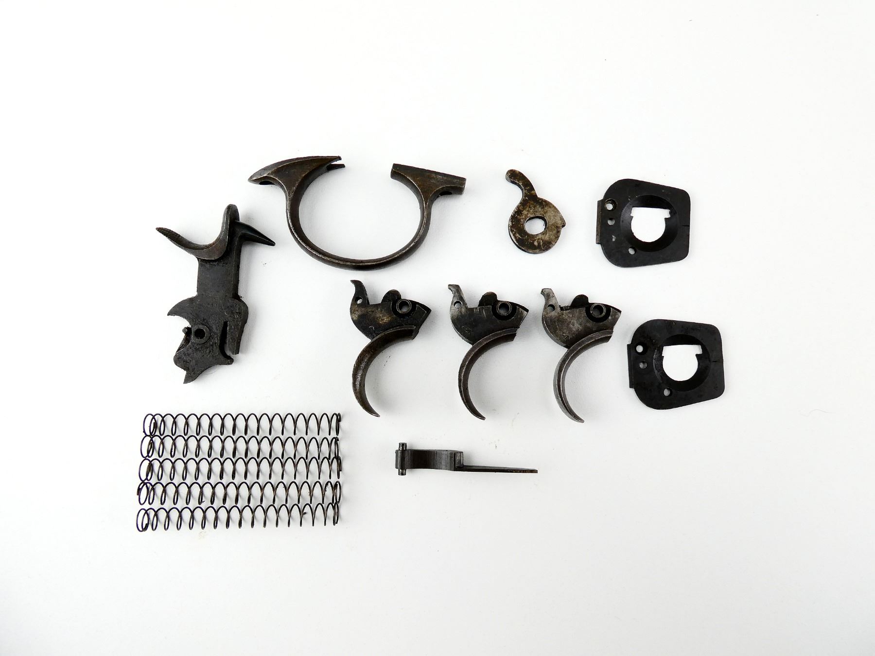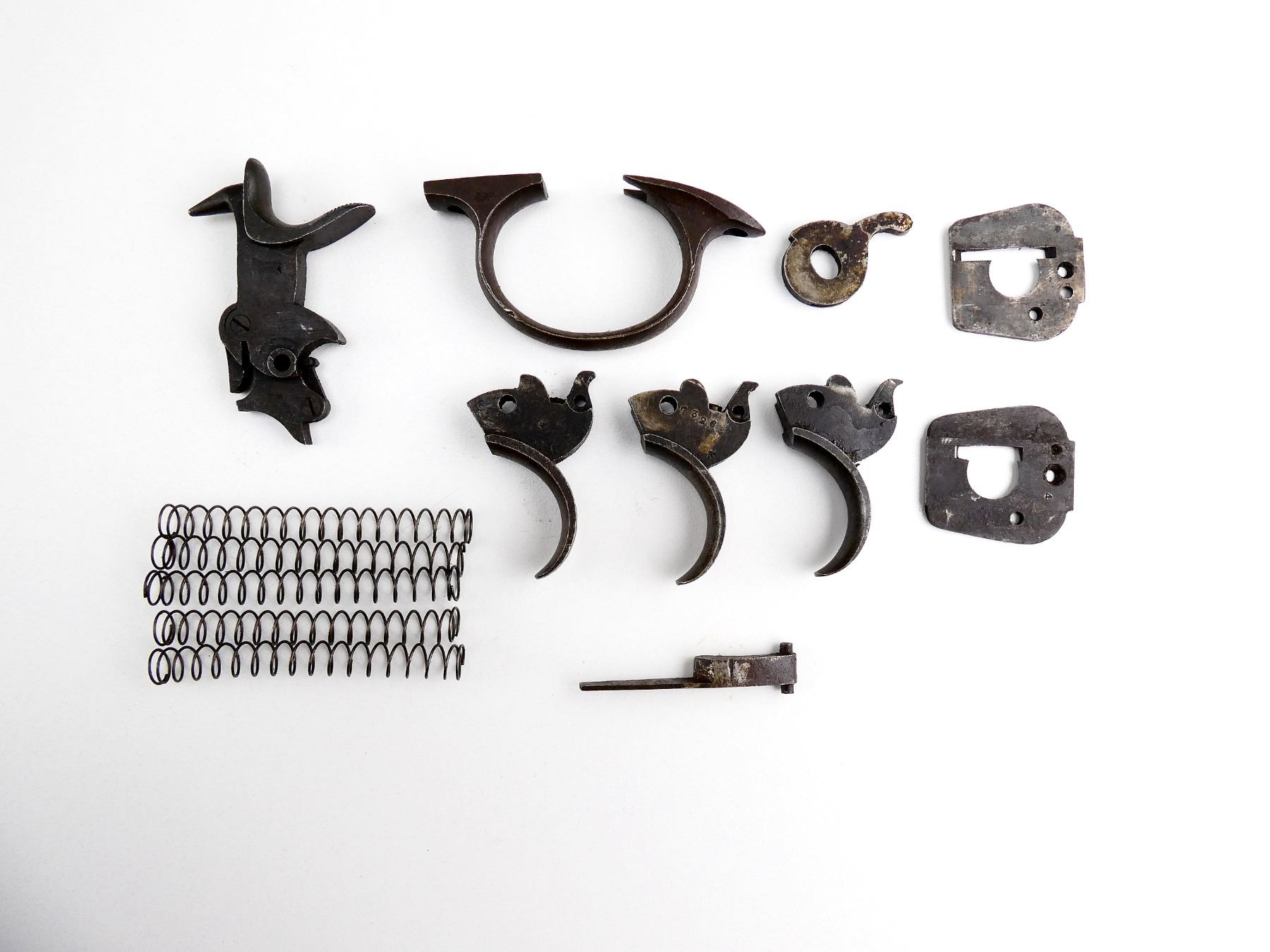 FITS .455 WEBLEY LARGE FRAME, LOT INCLUDES; HAMMER ASSEMBLY, HAND, (3) TRIGGERS, TRIGGER GUARD, (2) RECOIL PLATES, EXTRACTOR LEVER, (5) EXTRACTOR SPRINGS, ETC. MAY REQUIRE FITTING. SEE PHOTOS.