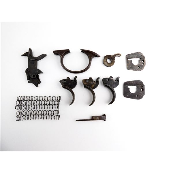 FITS .455 WEBLEY LARGE FRAME, LOT INCLUDES; HAMMER ASSEMBLY, HAND, (3) TRIGGERS, TRIGGER GUARD, (2) RECOIL PLATES, EXTRACTOR LEVER, (5) EXTRACTOR SPRINGS, ETC. MAY REQUIRE FITTING. SEE PHOTOS.