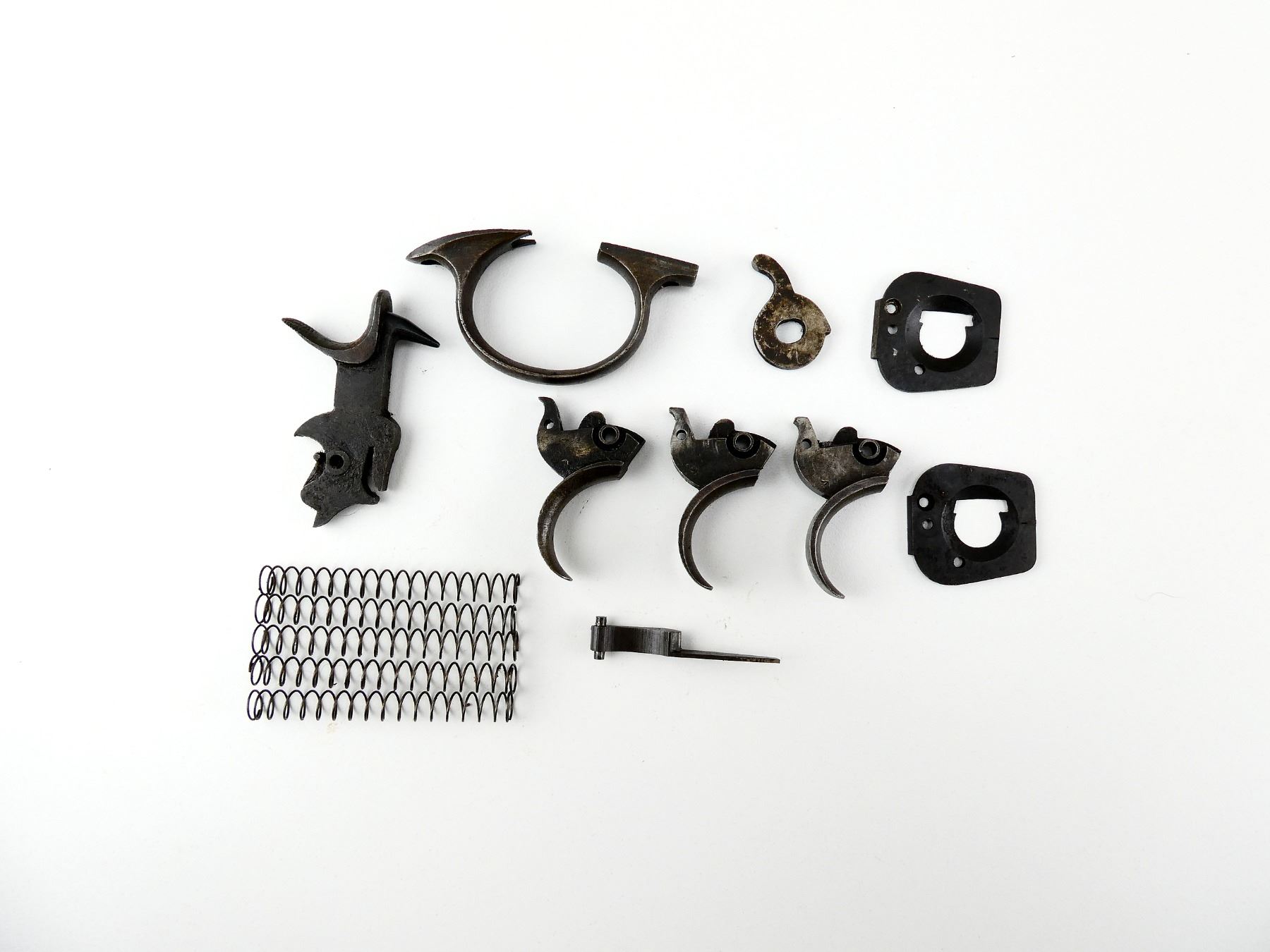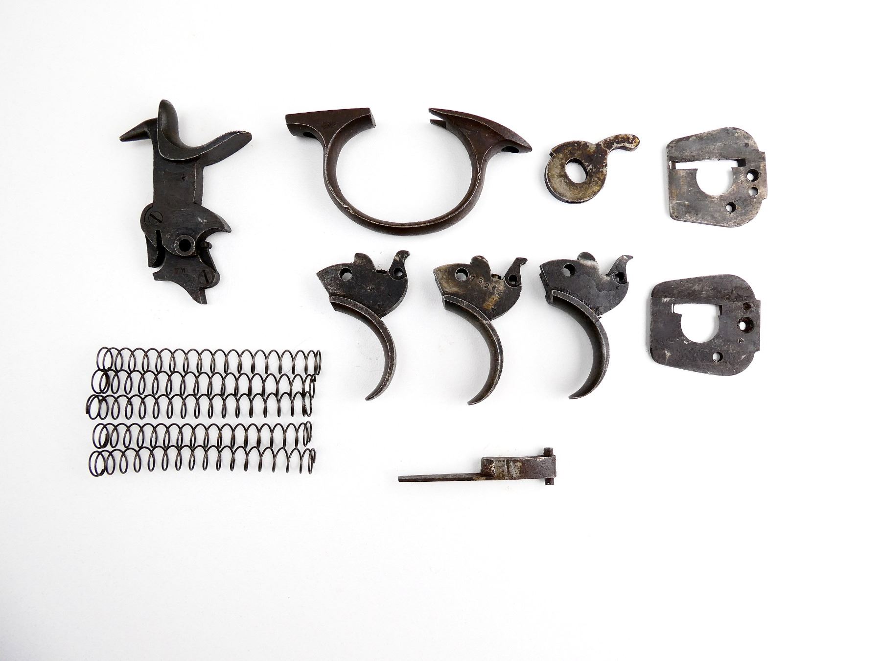 FITS .455 WEBLEY LARGE FRAME, LOT INCLUDES; HAMMER ASSEMBLY, HAND, (3) TRIGGERS, TRIGGER GUARD, (2) RECOIL PLATES, EXTRACTOR LEVER, (5) EXTRACTOR SPRINGS, ETC. MAY REQUIRE FITTING. SEE PHOTOS.