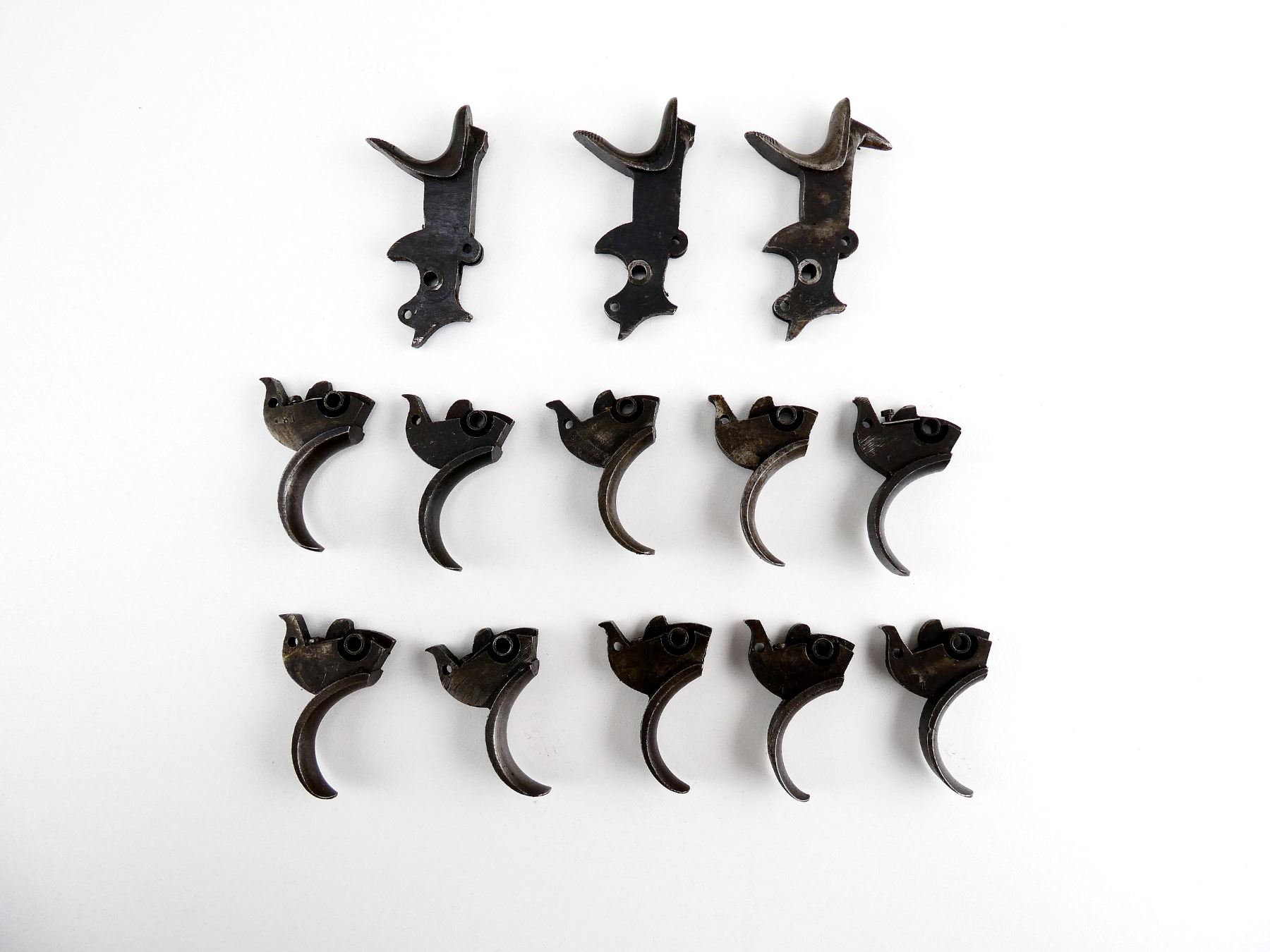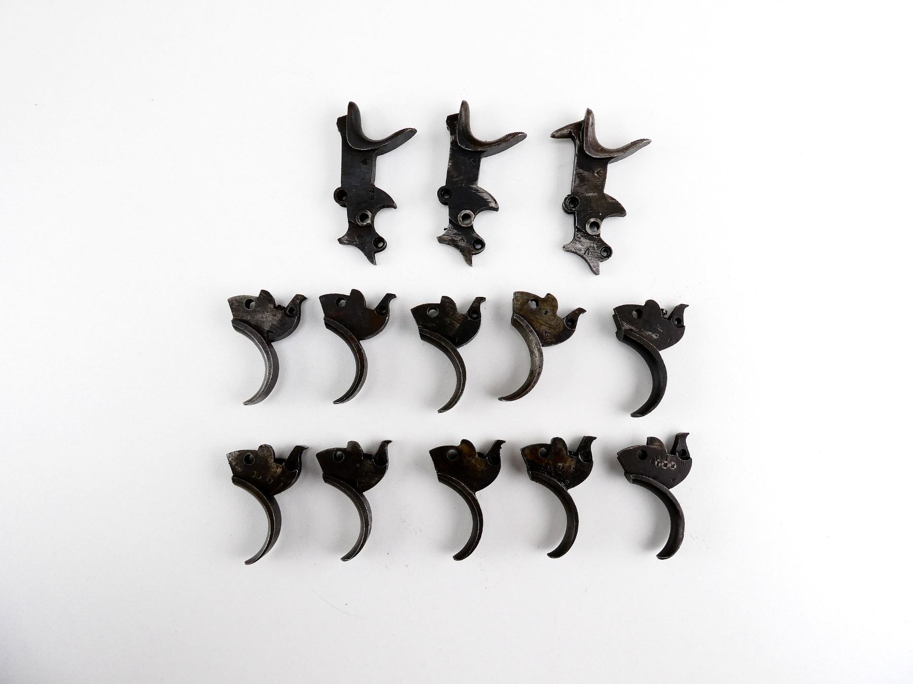 FITS .455 WEBLEY LARGE FRAME, LOT INCLUDES; (10) TRIGGERS, TRIGGER GUARD, (3) STRIPPED HAMMERS (FIRING PINS BROKEN / DAMAGED), ETC., MAY CONTAIN A FEW SMALL PARTS. MAY REQUIRE FITTING. SEE PHOTOS.