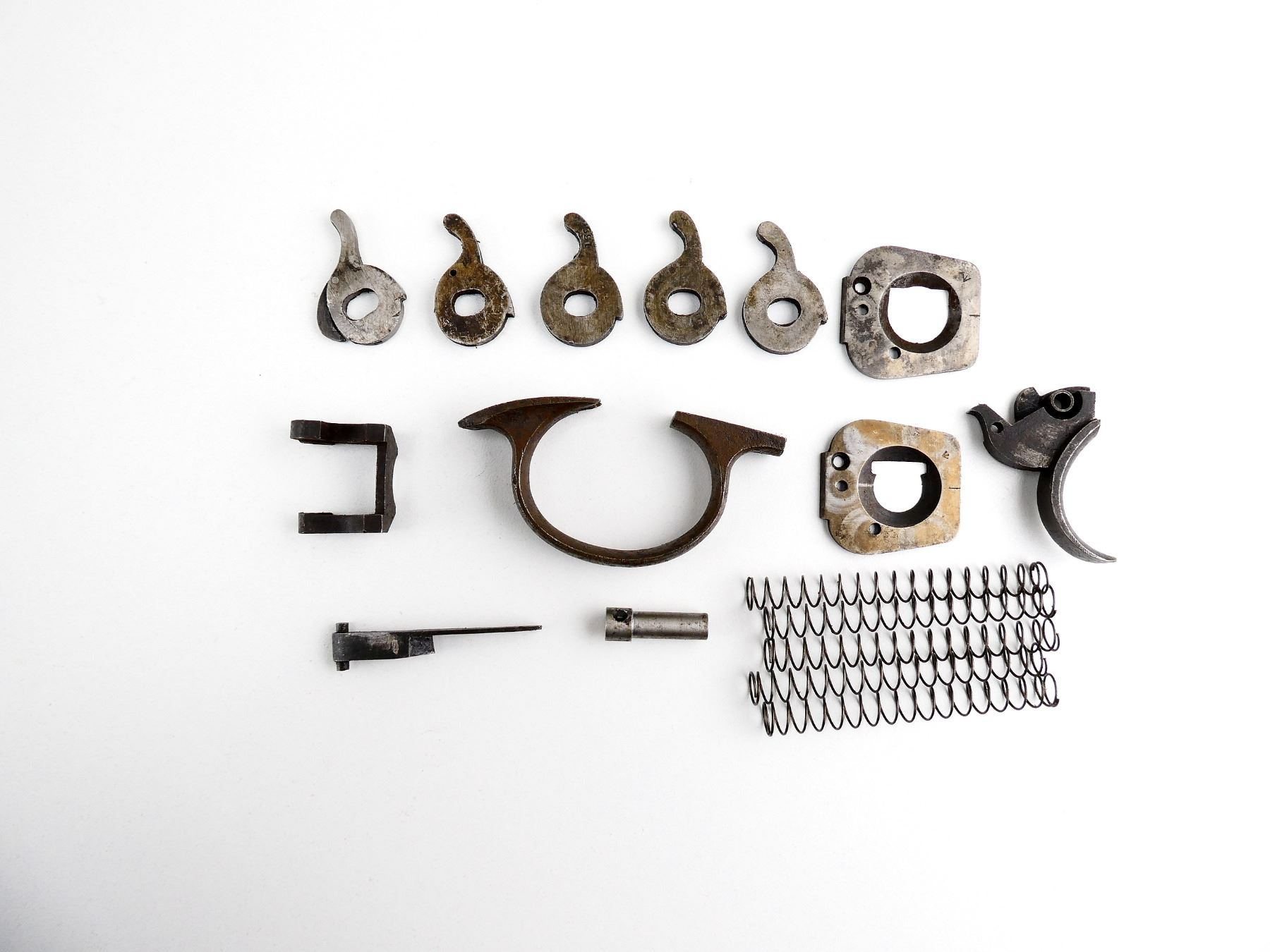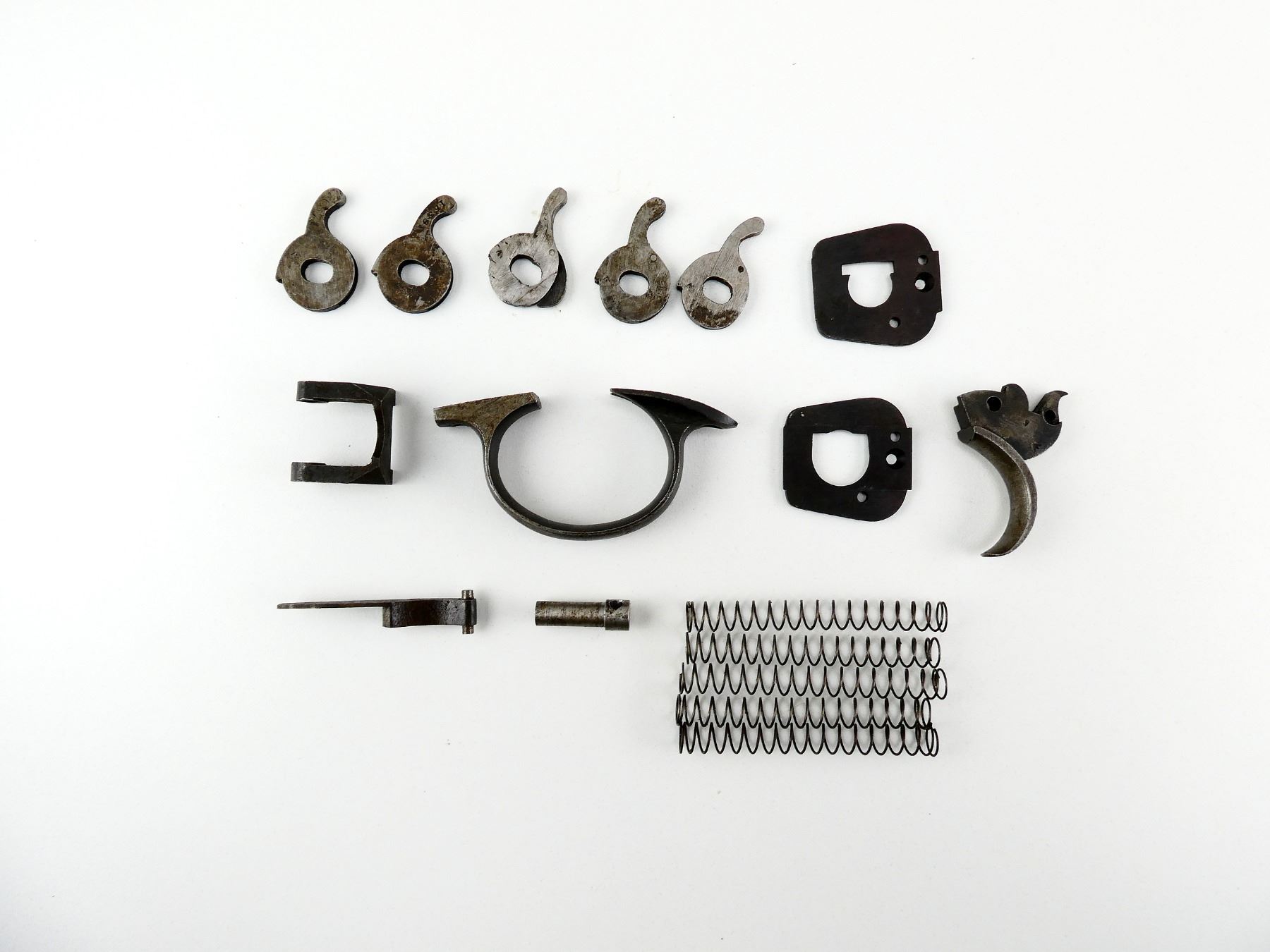 FITS .455 WEBLEY LARGE FRAME, LOT INCLUDES; TRIGGER, TRIGGER GUARD, (2) RECOIL PLATES, (5) EXTRACTOR LEVERS, HAND, ETC. MAY REQUIRE FITTING. SEE PHOTOS.