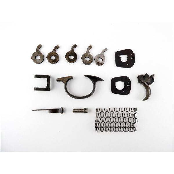 FITS .455 WEBLEY LARGE FRAME, LOT INCLUDES; TRIGGER, TRIGGER GUARD, (2) RECOIL PLATES, (5) EXTRACTOR LEVERS, HAND, ETC. MAY REQUIRE FITTING. SEE PHOTOS.
