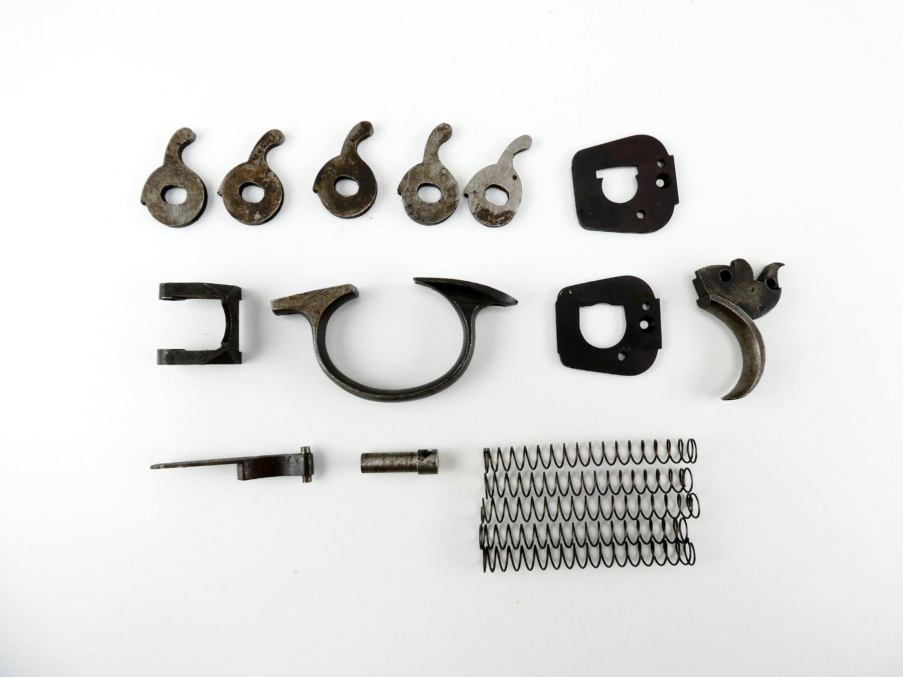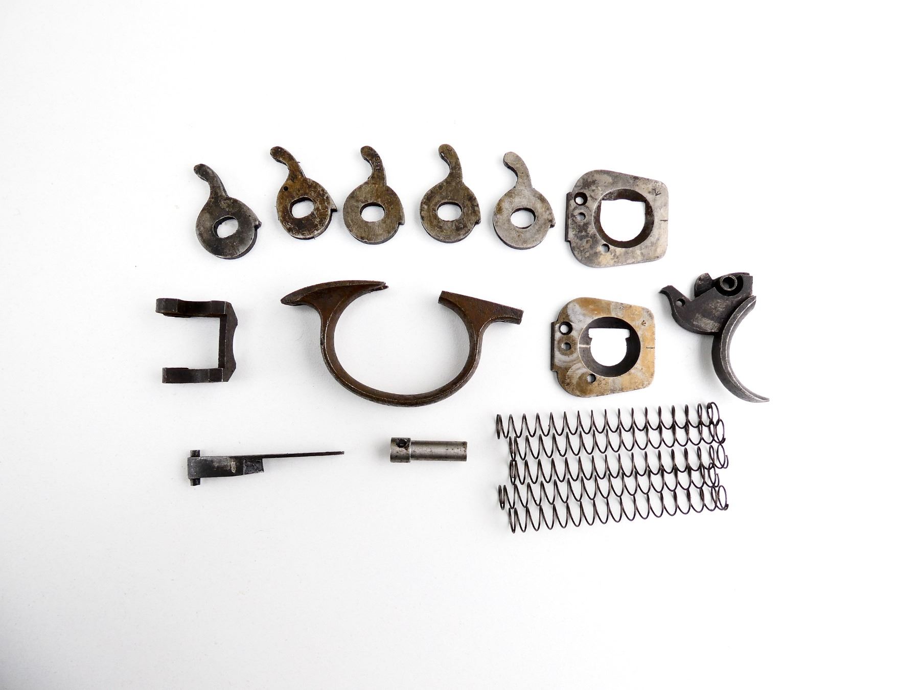FITS .455 WEBLEY LARGE FRAME, LOT INCLUDES; TRIGGER, TRIGGER GUARD, (2) RECOIL PLATES, (5) EXTRACTOR LEVERS, HAND, ETC. MAY REQUIRE FITTING. SEE PHOTOS.