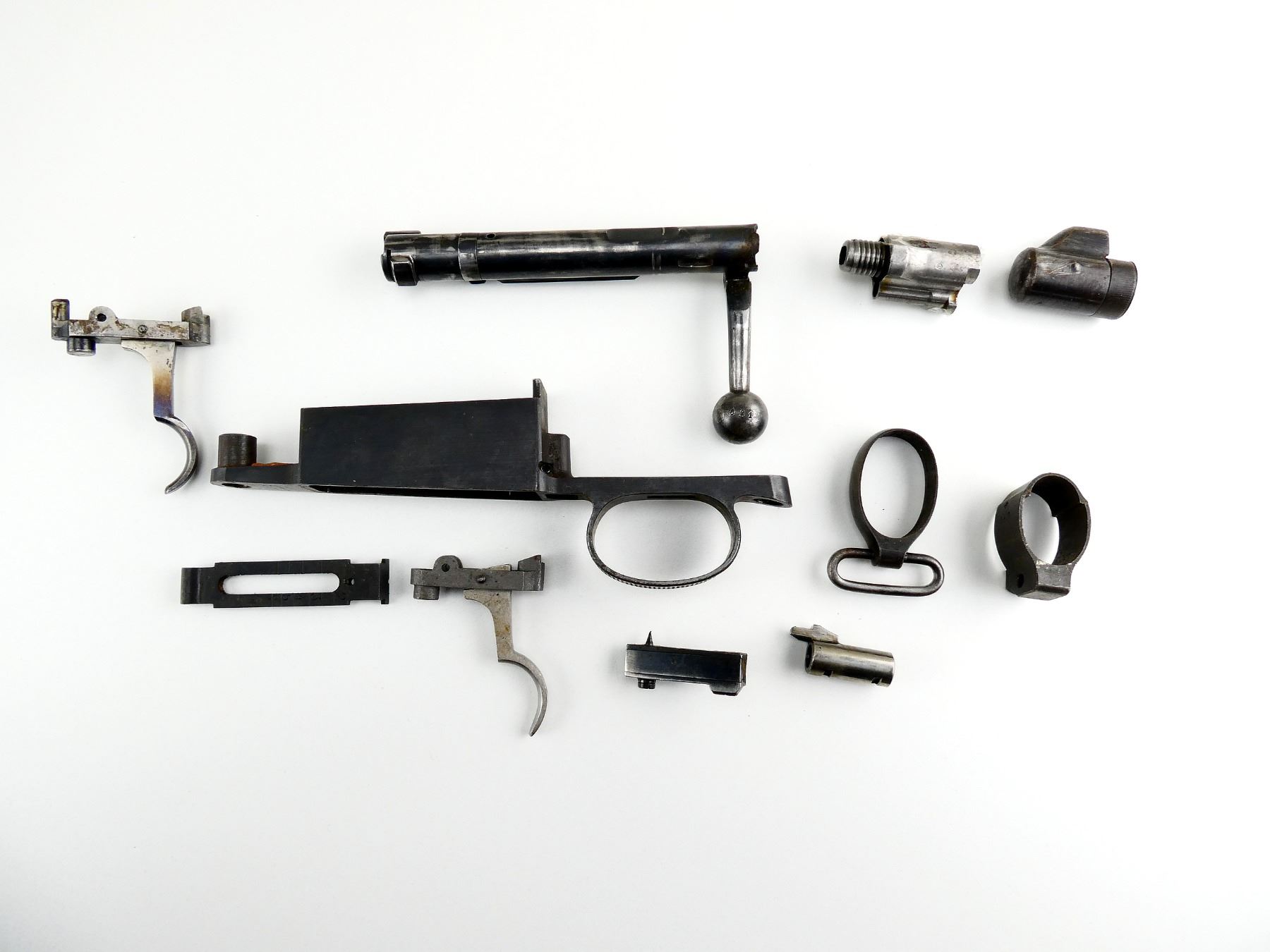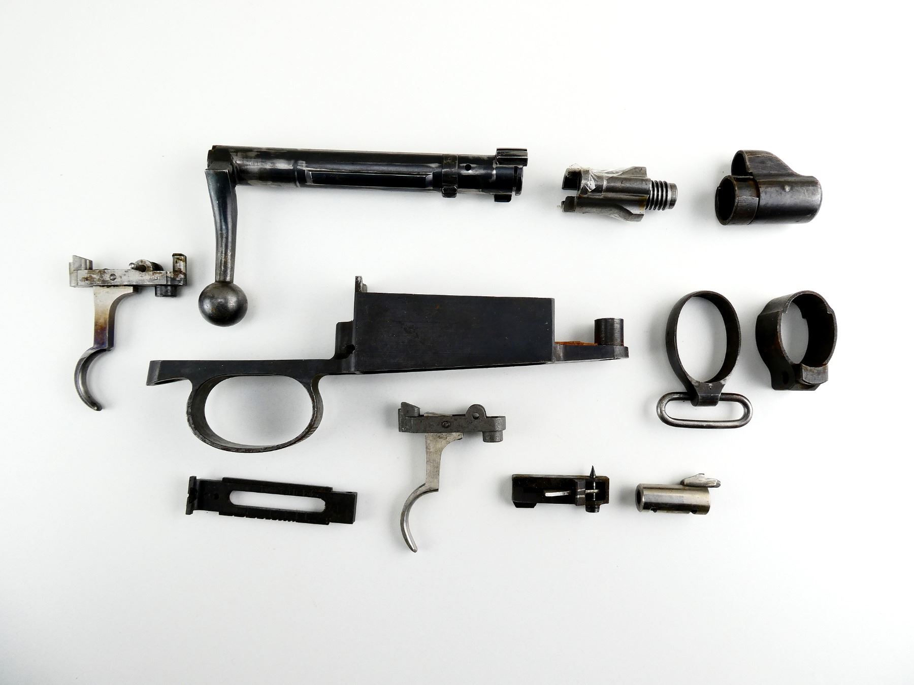 LOT INCLUDES; TRIGGER GUARD, BOLT WITH MODIFIED HANDLE, TRIGGERS WITH SEARS, REAR SIGHT, BOLT STOP, BARREL BANDS, BOLT SHROUD, MUZZLE COVER, ETC. MAY REQUIRE FITTING. SEE PHOTOS.