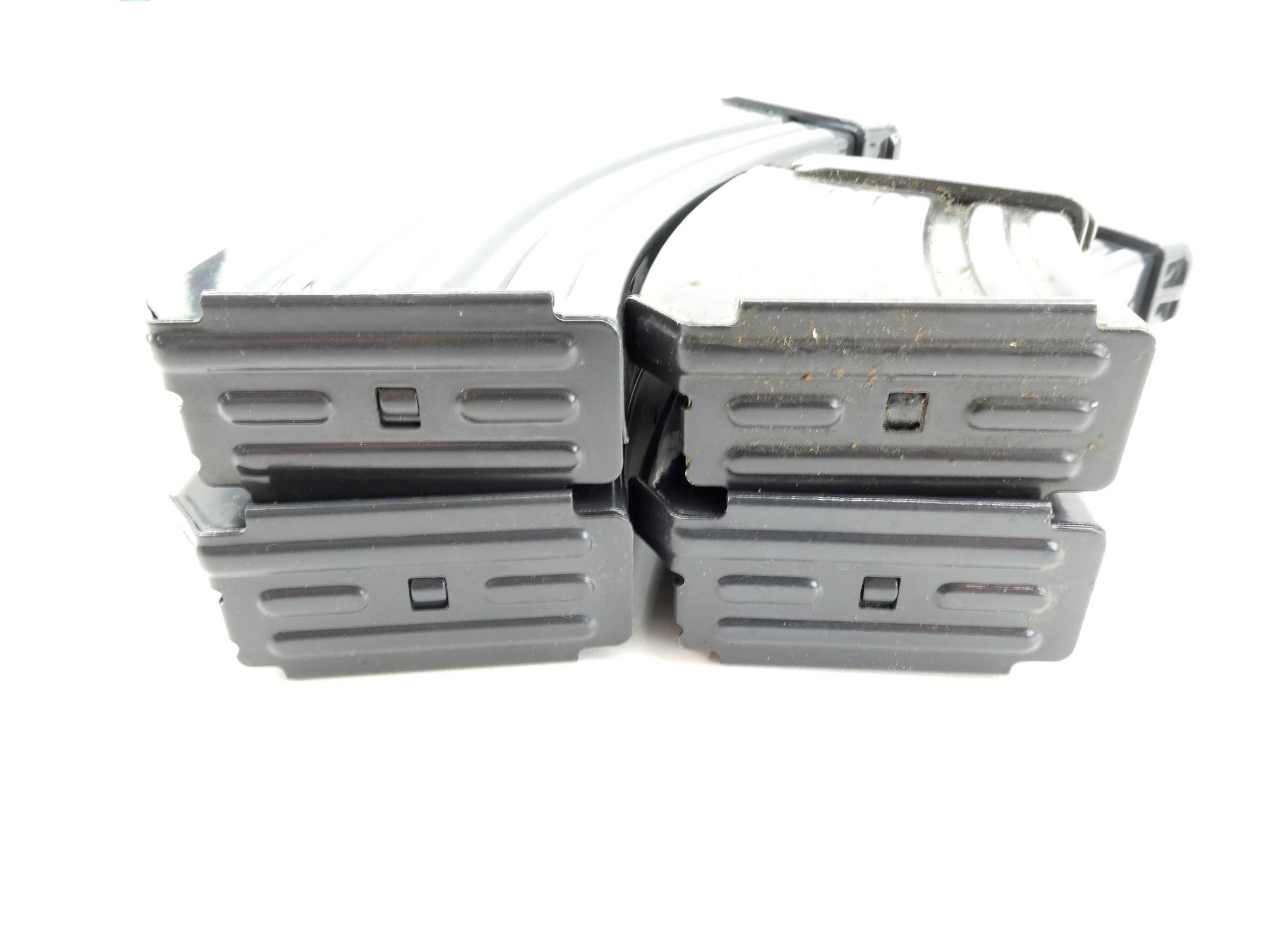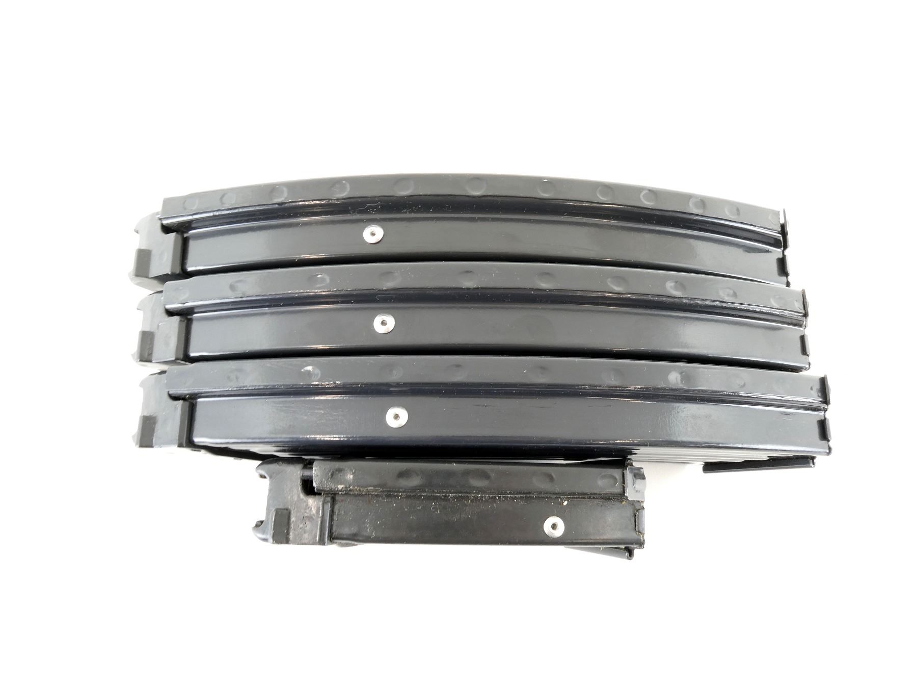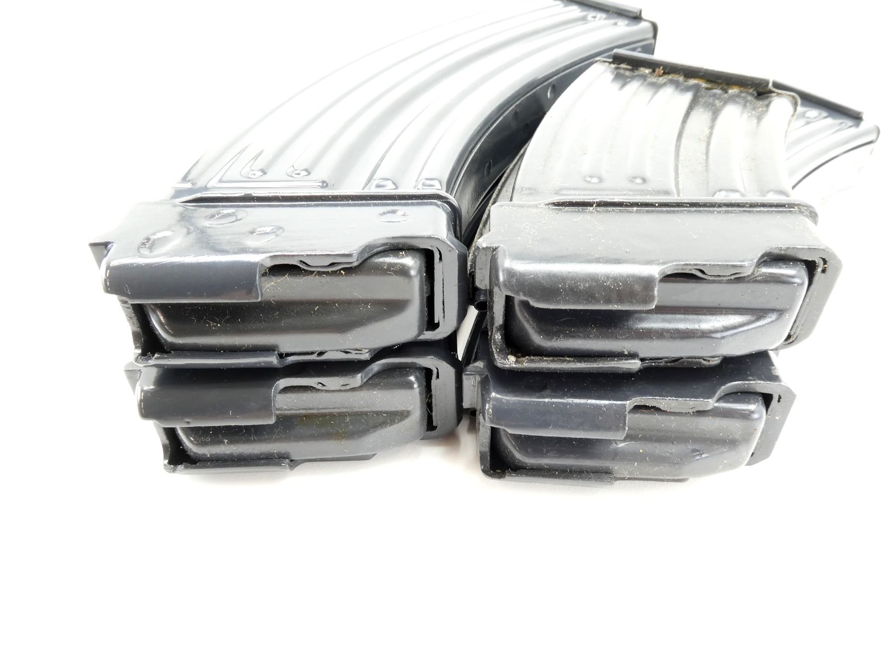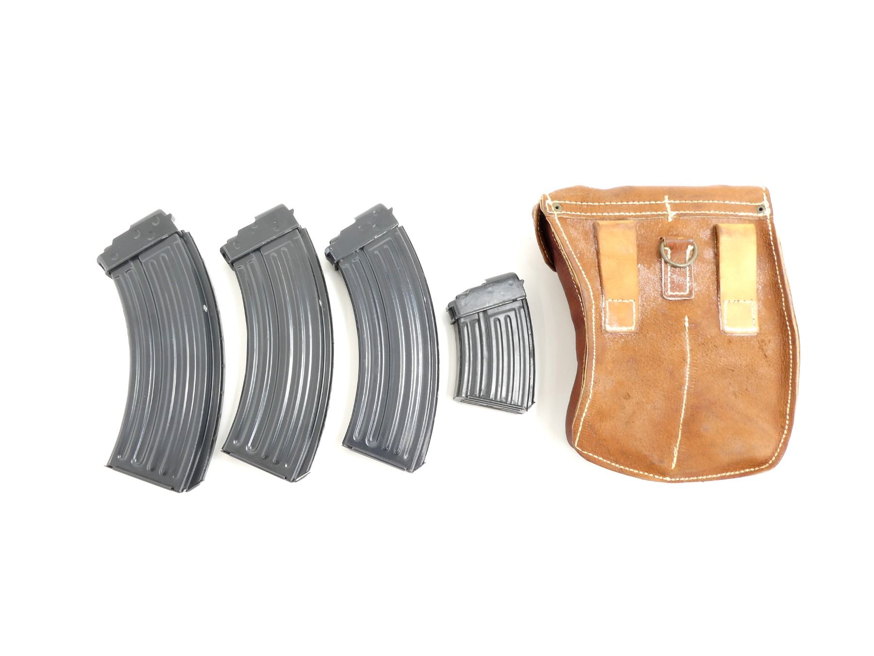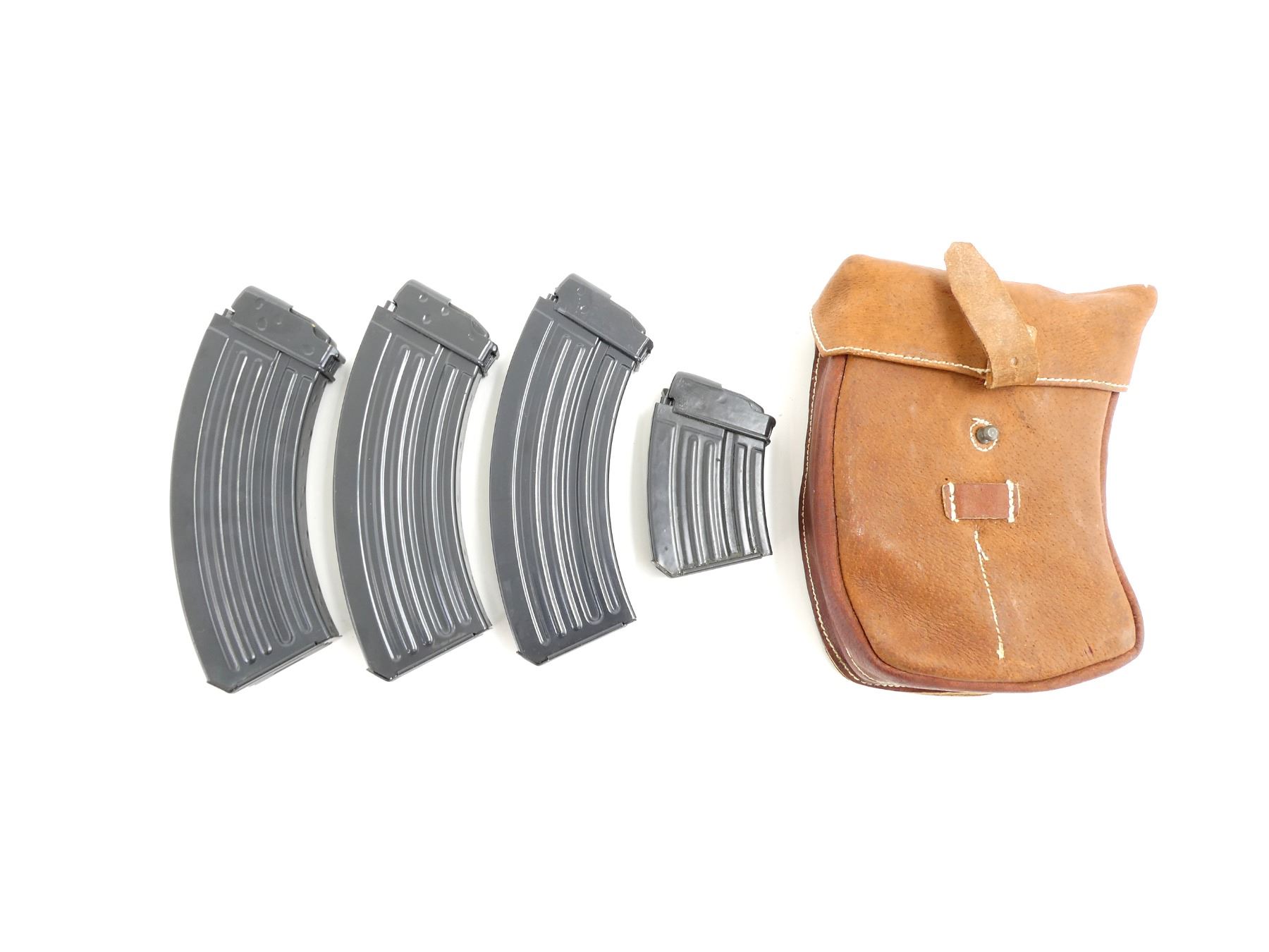 LOT INCLUDES; (3) 7.62X39MM, 5/30 ROUND PINNED MAGS & (1) 7.62X39MM, 5/10 ROUND PINNED MAG, BLUED ALUMINIUM CONSTRUCTION, UNMARKED & (1) BROWN LEATHER MAG POUCH WITH BELT LOOPS, FOUR INTERIOR POCKETS, VARIOUS MARKINGS. SEE PHOTOS. PAL REQUIRED.