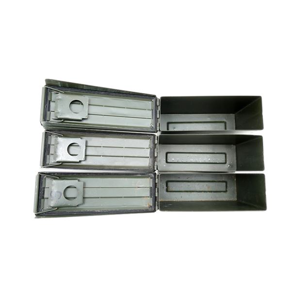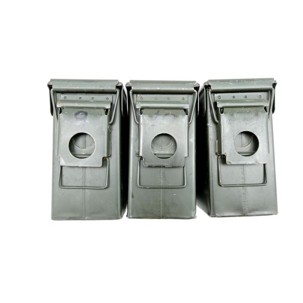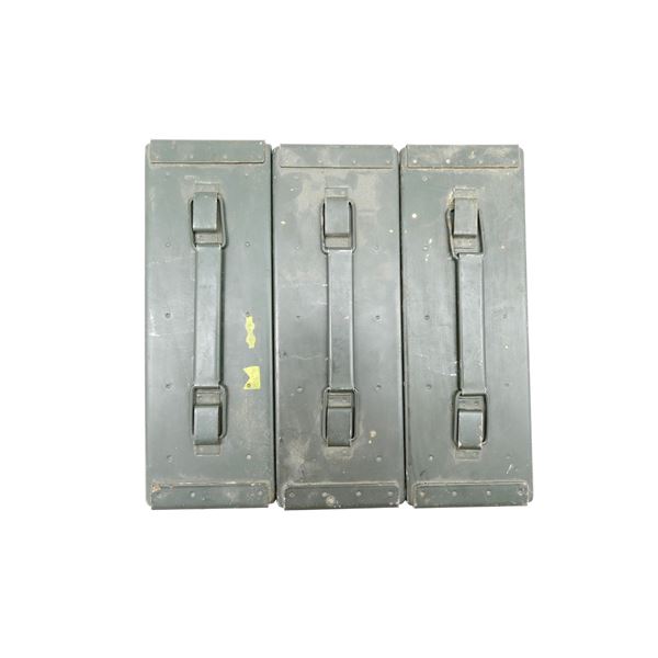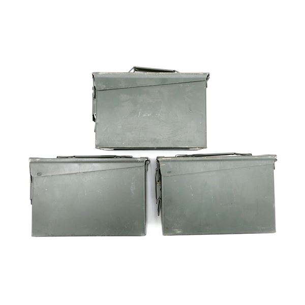LOT INCLUDES; (3) GREEN PAINTED METAL AMMO TINS, VARIOUS MARKINGS, APPROX. 11" X 4" X 7". SEE PHOTOS.