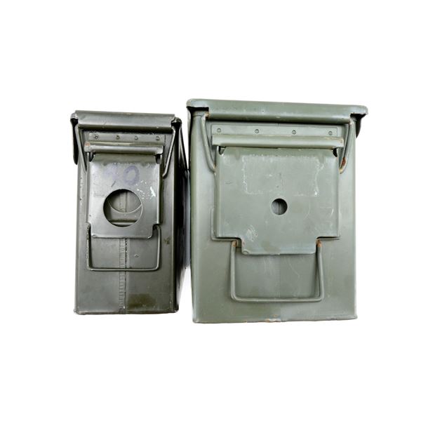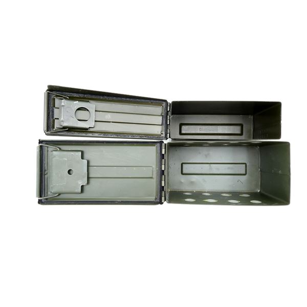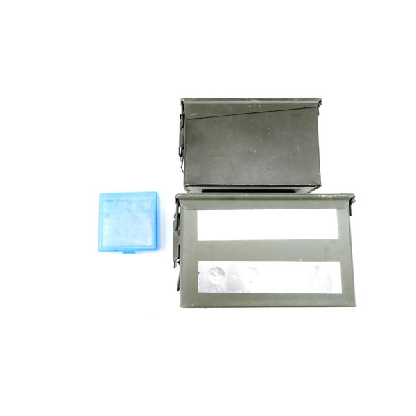 LOT INCLUDES; (1) GREEN PAINTED METAL AMMO TIN, VARIOUS MARKINGS, APPROX. 11" X 4" X 7", (1) GREEN PAINTED METAL AMMO TIN, VARIOUS MARKINGS, APPROX. 12" X 6" X 7.25" & (1) BLUE PLASTIC PISTOL AMMO CONTAINER, FITS .38 / .38 SPCL / 9MM LUGER ETC., HOLDS 100-RNDS, VARIOUS MARKINGS. SEE PHOTOS.