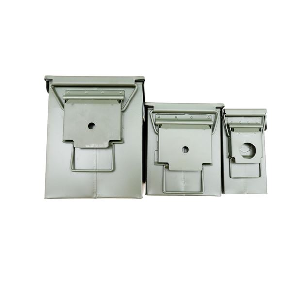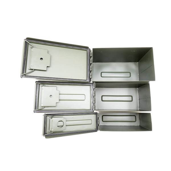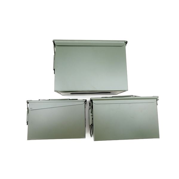 ALL NOS, LOT INCLUDES; (1) GREEN PAINTED METAL AMMO TIN, VARIOUS MARKINGS, APPROX. 13" X 7.25" X 8.75", (1) GREEN PAINTED METAL AMMO TIN, VARIOUS MARKINGS, APPROX. 11.75" X 6" X 7.5" & (1) GREEN PAINTED METAL AMMO TIN, VARIOUS MARKINGS, APPROX. 11" X 3.75" X 6 7/8". SEE PHOTOS.