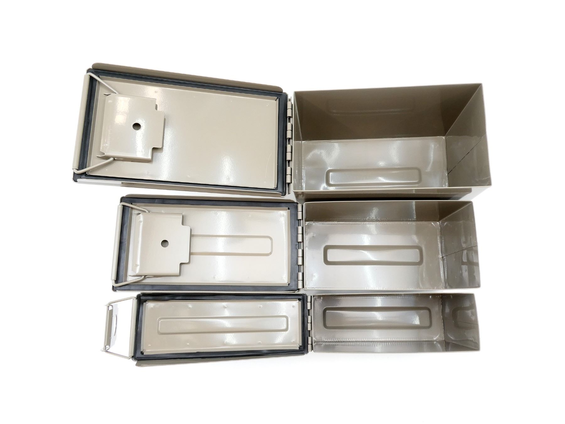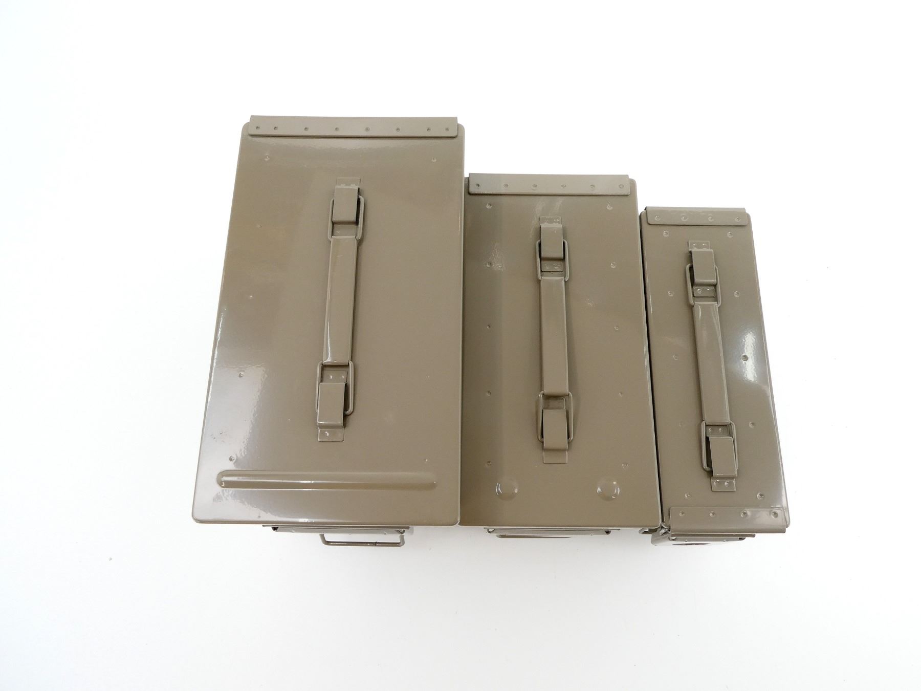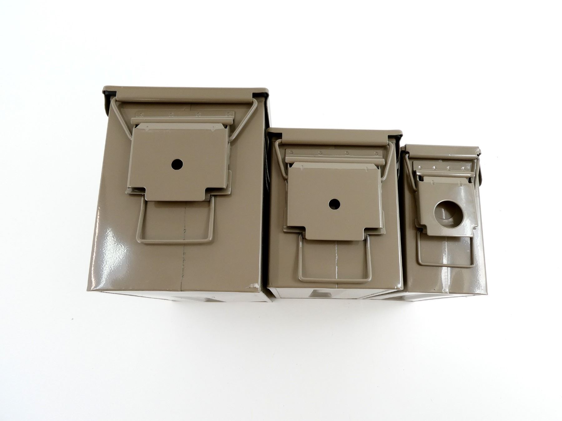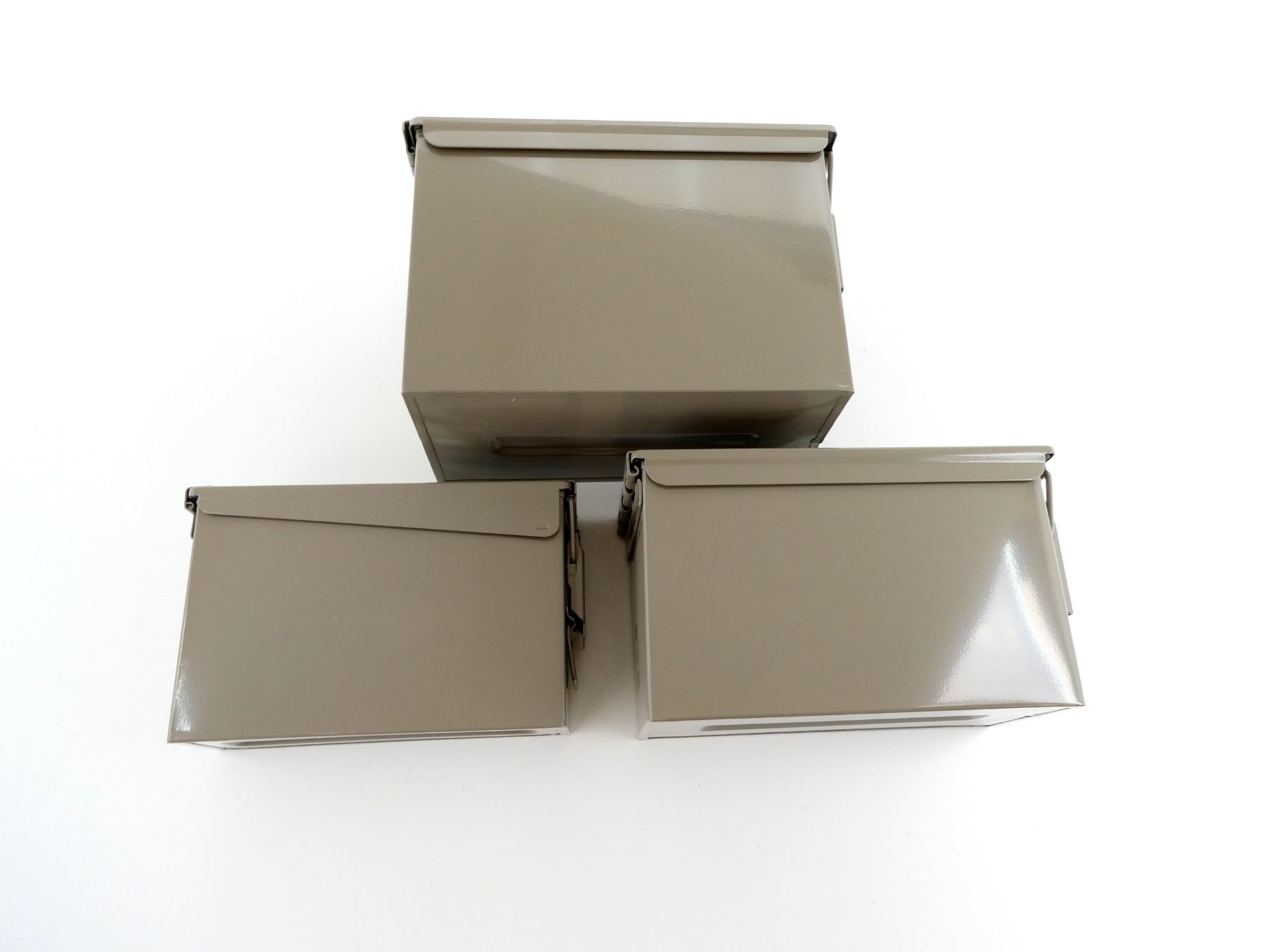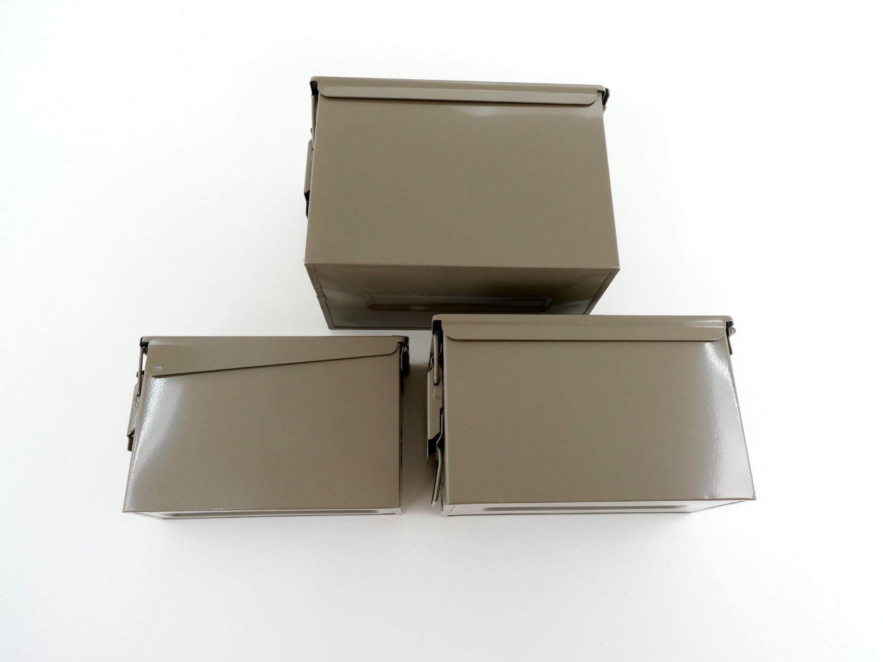 ALL NOS, LOT INCLUDES; (1) GREY PAINTED METAL AMMO TIN, VARIOUS MARKINGS, APPROX. 13" X 7.25" X 8.75", (1) GREY PAINTED METAL AMMO TIN, VARIOUS MARKINGS, APPROX. 11.75" X 6" X 7.5" & (1) GREY PAINTED METAL AMMO TIN, VARIOUS MARKINGS, APPROX. 11" X 3.75" X 6 7/8". SEE PHOTOS.