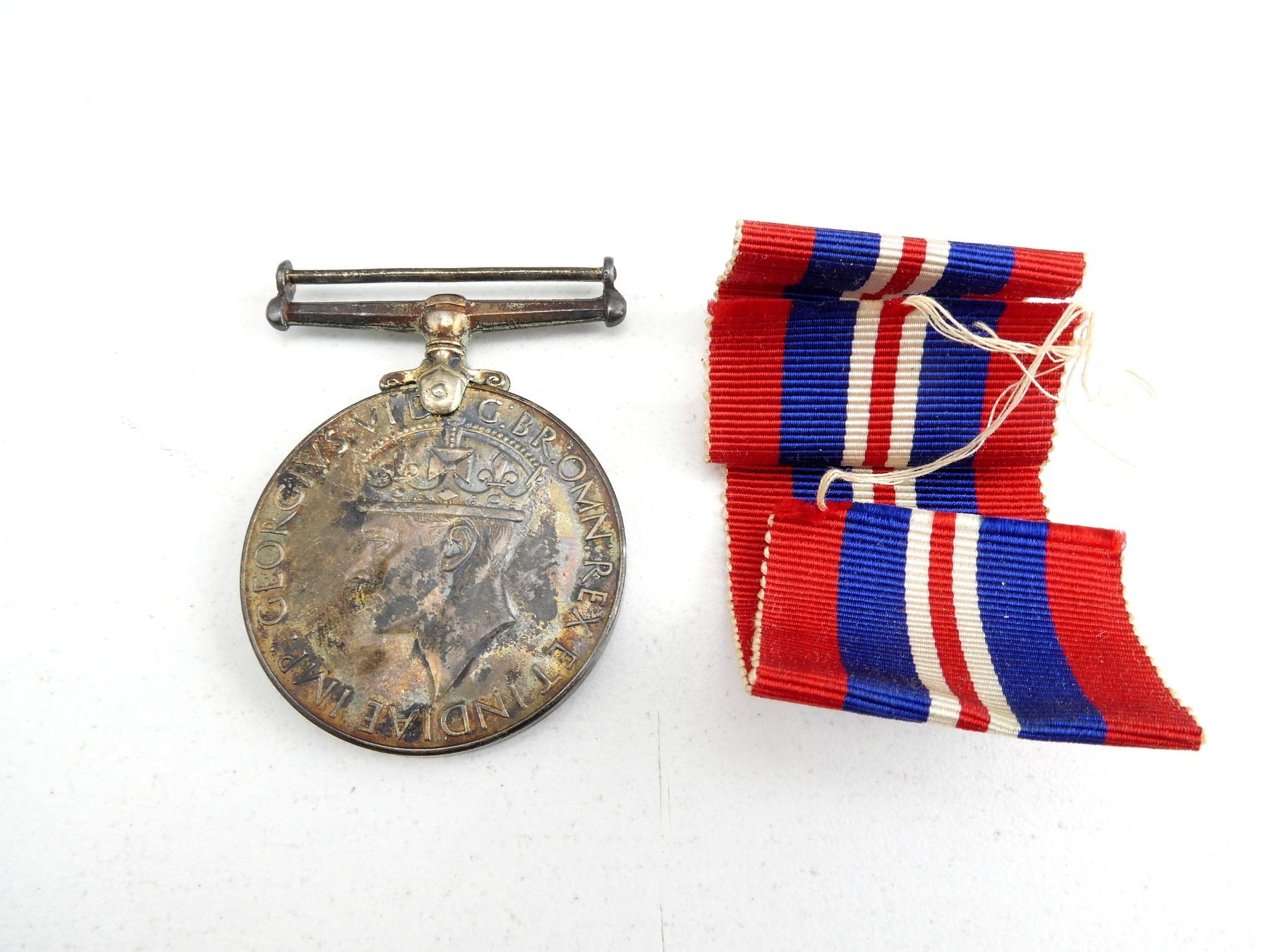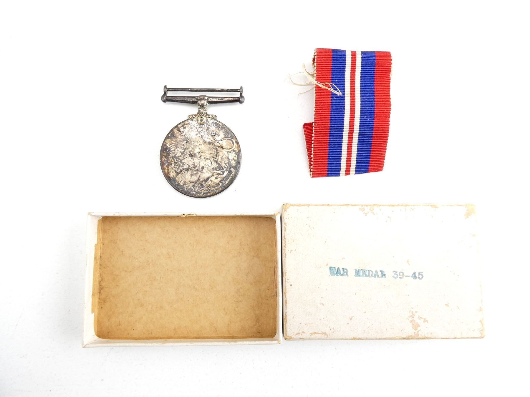 (1) UN-NAMED FULL SIZE 1939-1945 WAR MEDAL WITH RED / NAVY BLUE / WHITE RIBBON & ORIGINAL BOX. SEE PHOTOS.