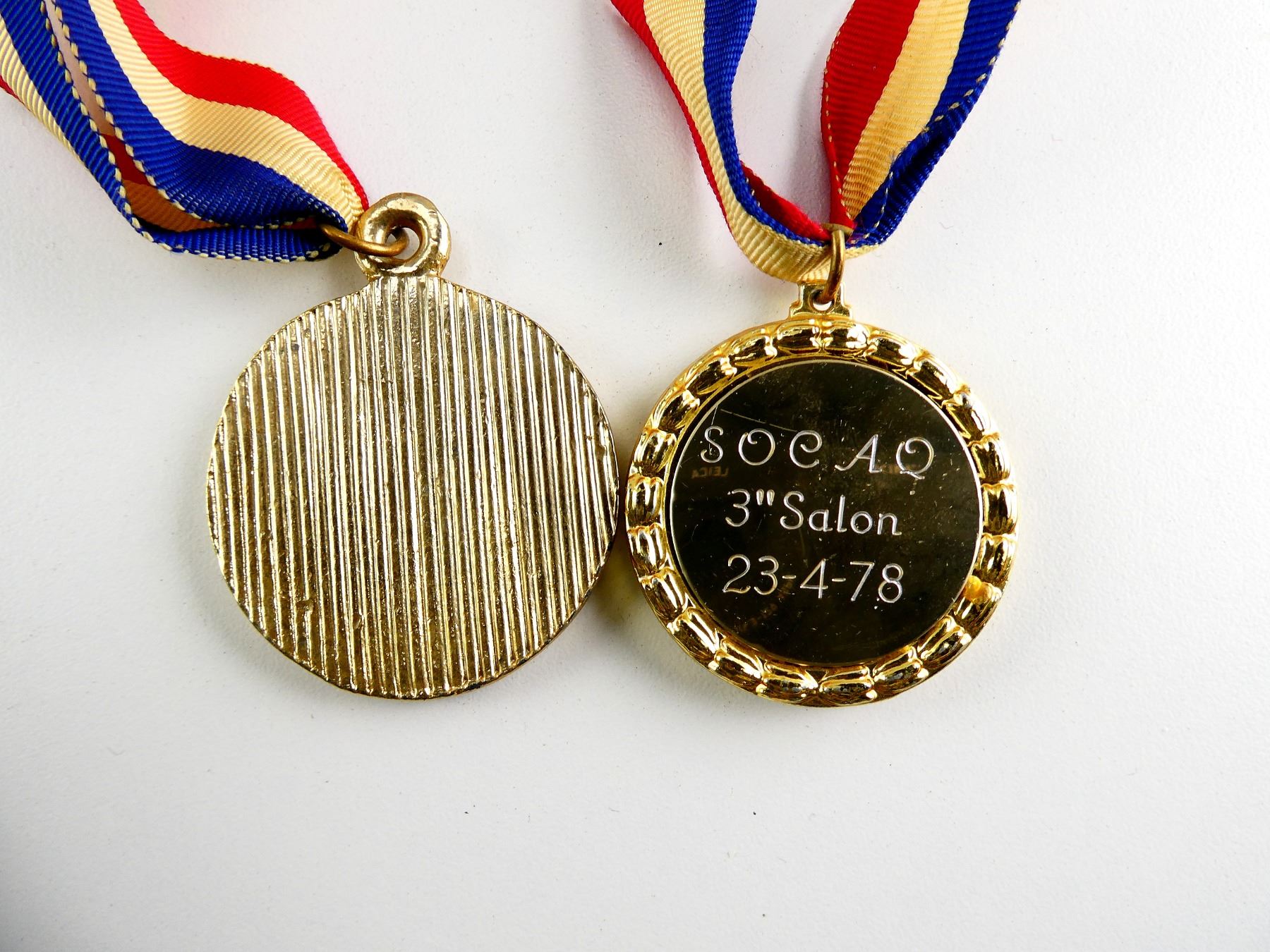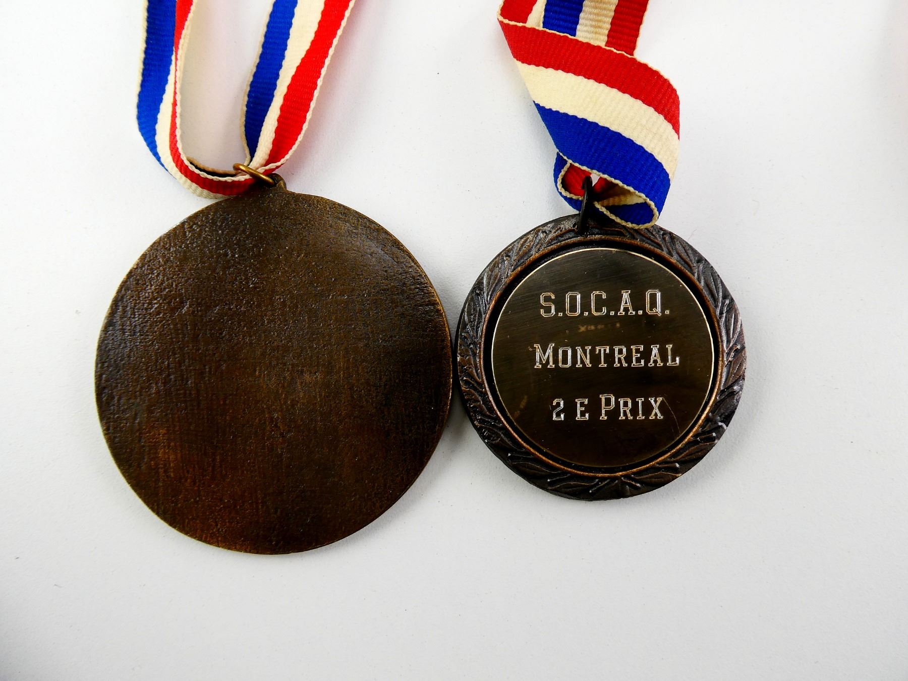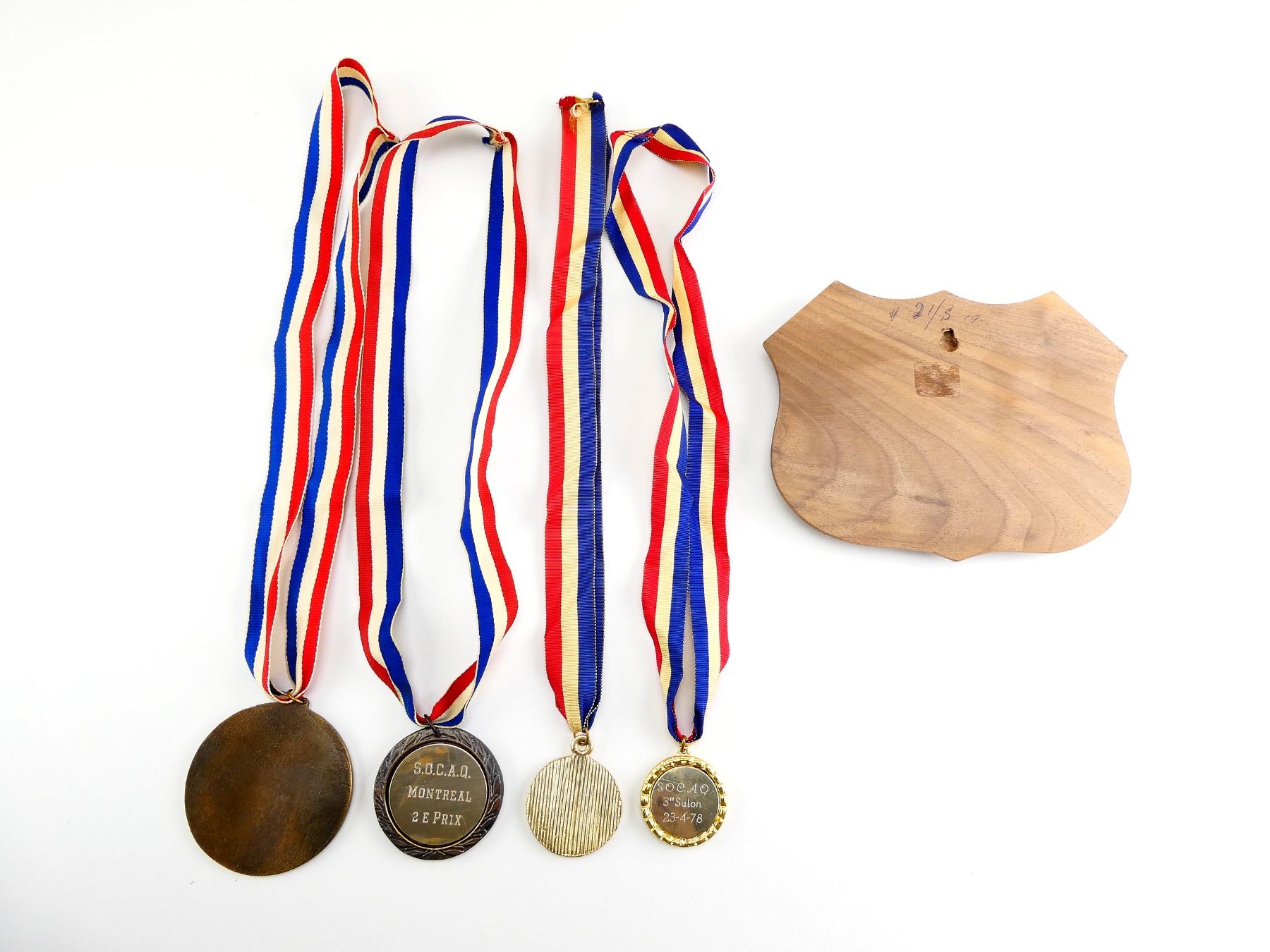 LOT INCLUDES; (4) S.O.C.A.Q. MEDALS WITH RIBBONS, SOCIETE DES ANCIENS COMBATTANTS ET AMIS DE LA LIBERTE (VETERANS & FRIENDS LIBERTY SOCIETY), BACK OF ONE MEDAL MARKED: "SOCAQ, 3" SALON 23-4-78", OTHER MARKED: "S.O.C.A.Q., MONTREAL, 2E PRIX" & (1) WOOD PLAQUE WITH BRASS PLATE MARKED: "S.O.C.A.Q., 1980", APPROX. 7 5/8" X 5 7/8". SEE PHOTOS.