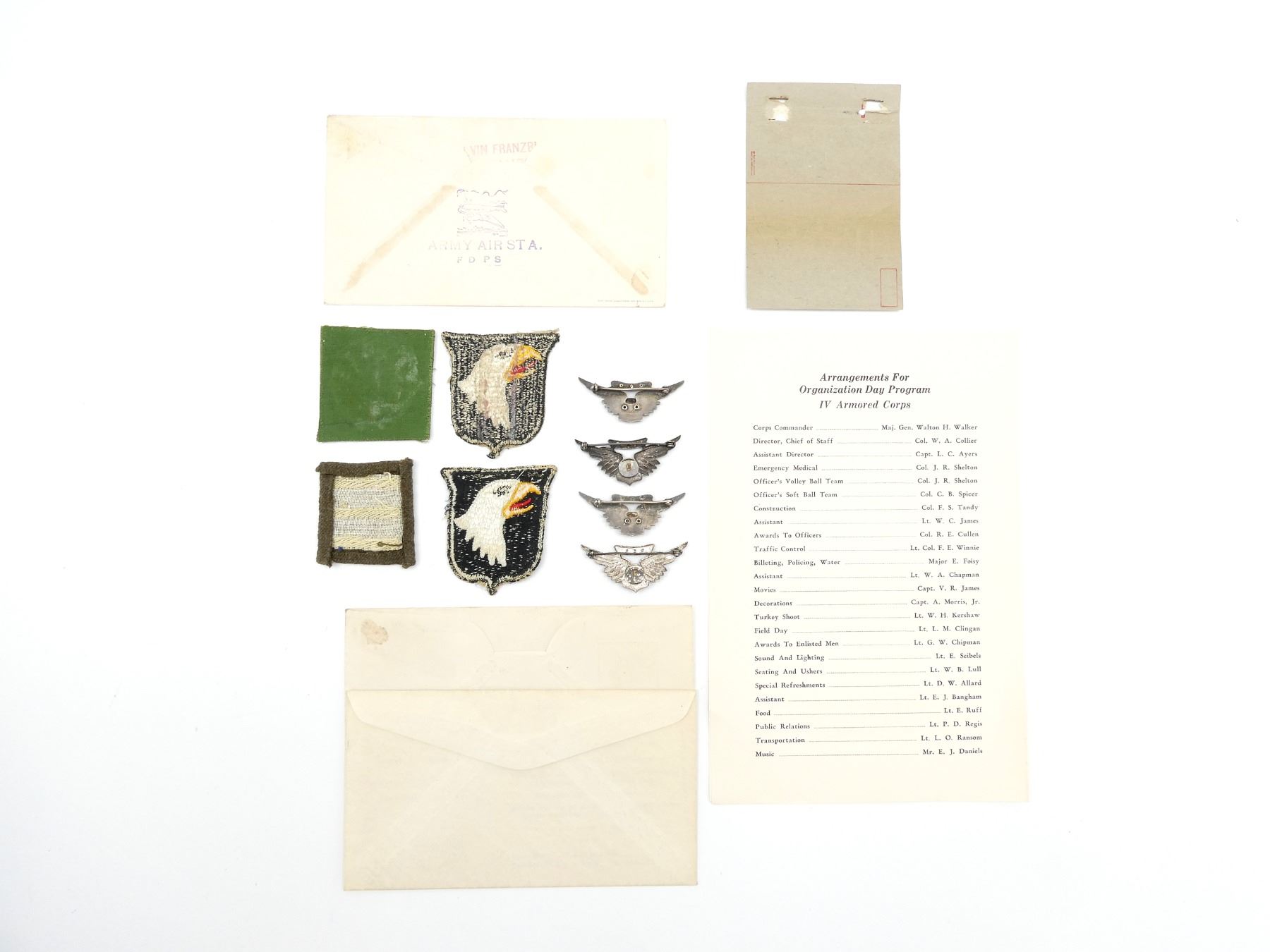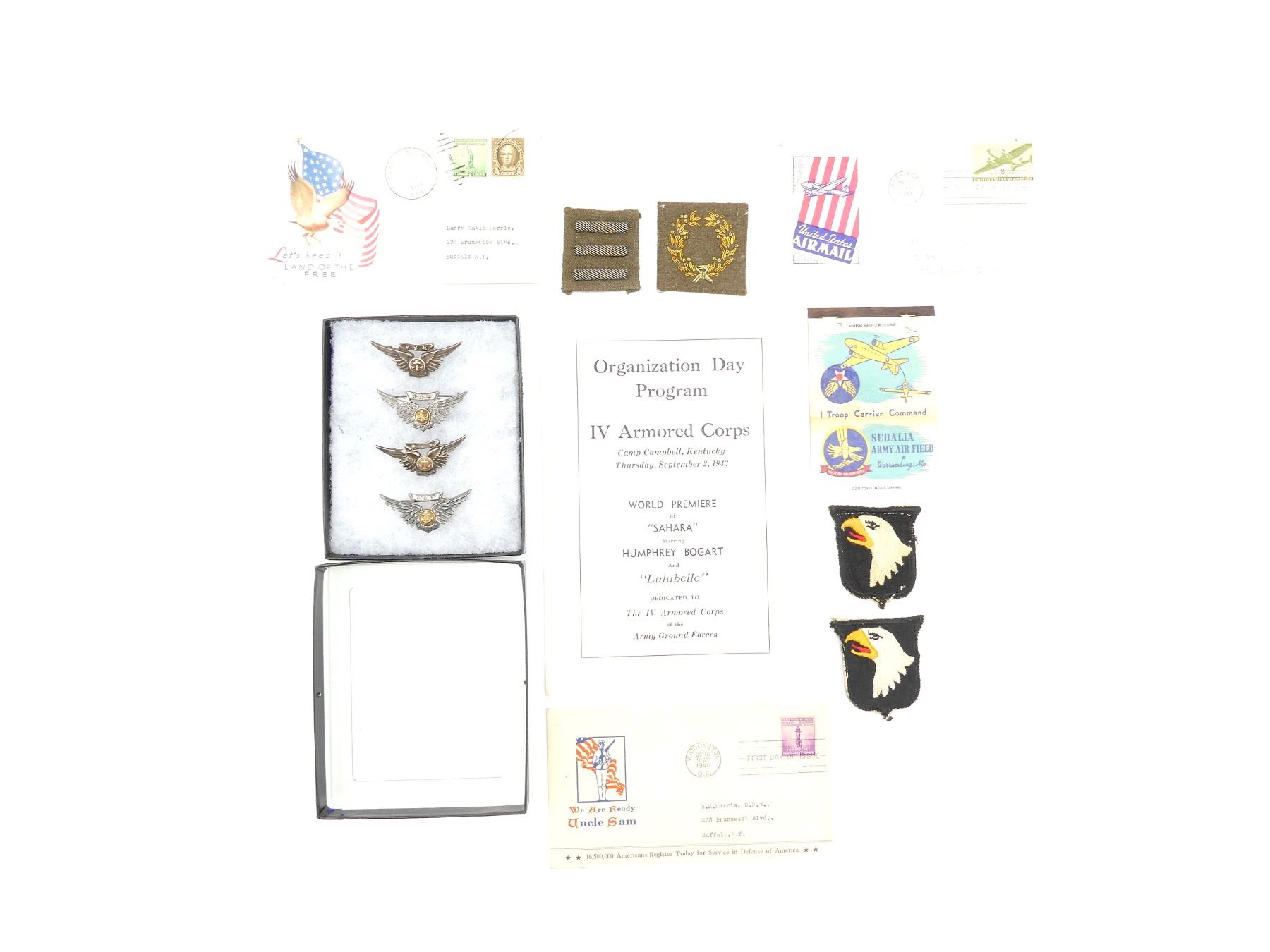 APPROX. (13) PIECES, INCLUDES; 101ST AIRBORNE BADGES, SEPT. 2ND, 1943 ORGANIZATION DAY PROGRAM PAMPHLET, TROOP CARRIER COMMAND MATCH PACKAGING, MERITORIOUS SERVICE BADGE, OVERSEAS BARS BADGE, AIRCREW BADGES IN MINI DISPLAY BOX (UNDER GLASS), 1940 DATED U.S. ENVELOPE, 1941 DATED U.S. ENVELOPE & 1944 DATED U.S. ENVELOPE. SEE PHOTOS. *NO GUARANTEE ON GLASS FOR SHIPPING*