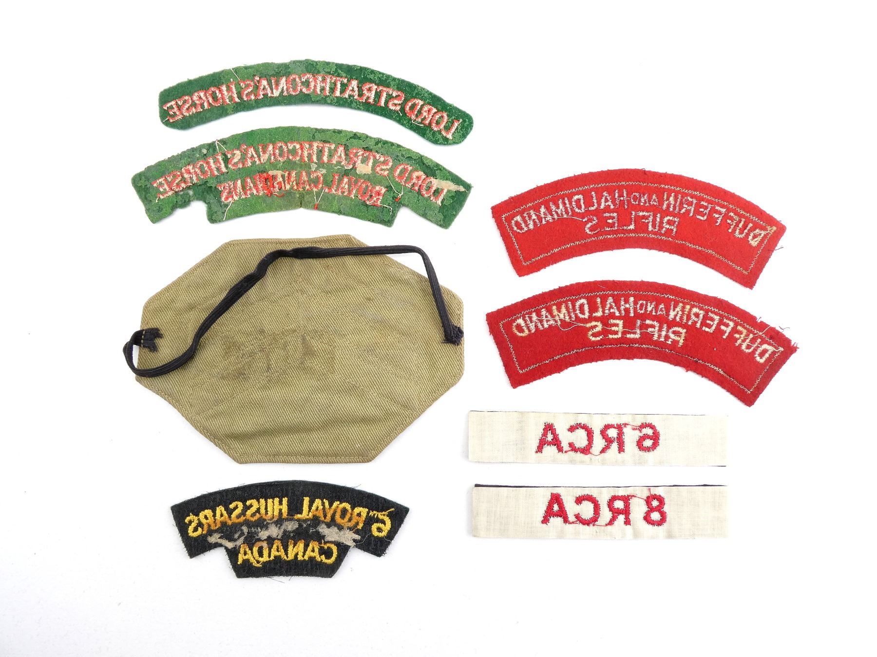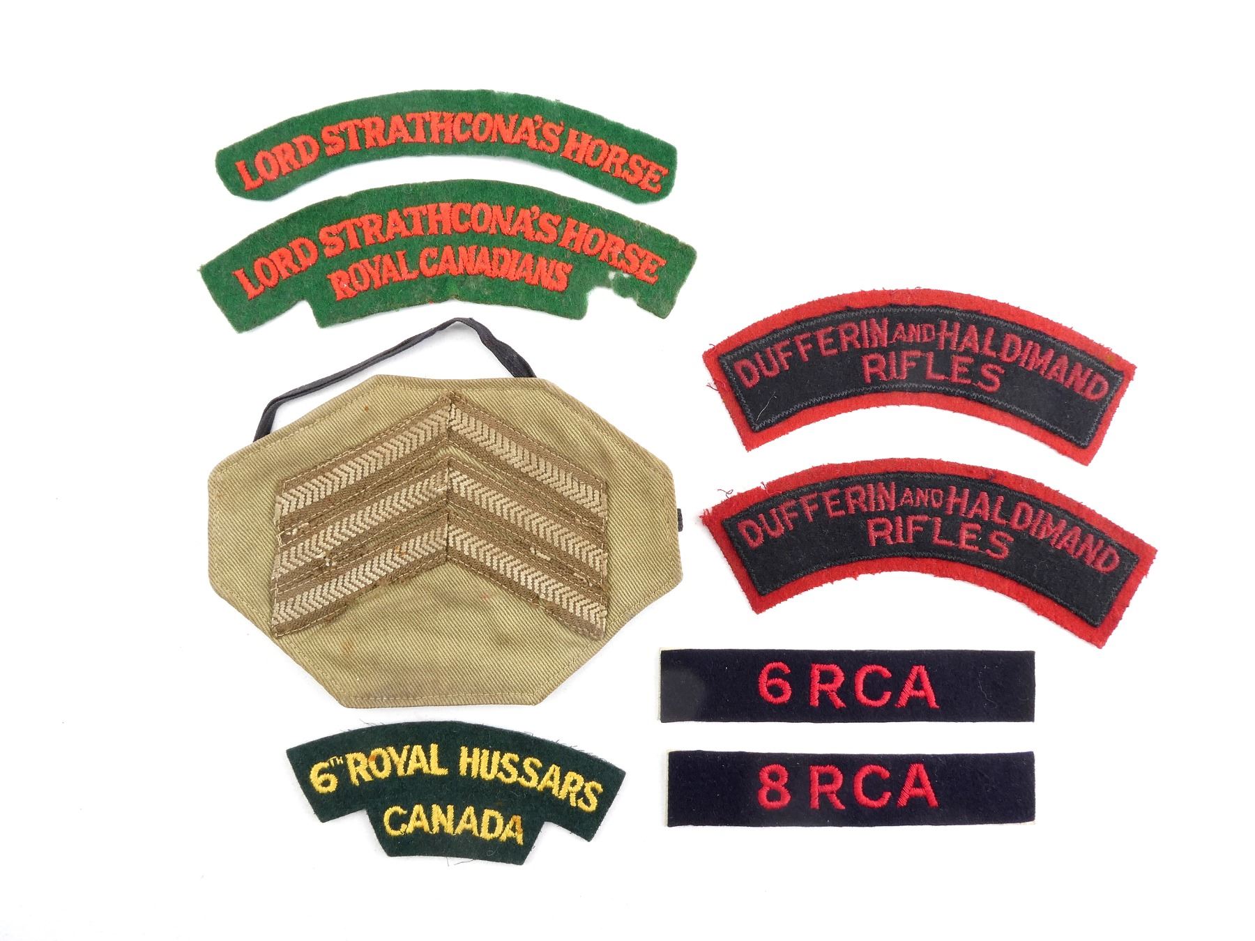 LOT INCLUDES; (2) DUFFERIN AND HALDIMAND RIFLES WOOL SHOULDER BADGES, (1) 6TH ROYAL CANADIAN ARTILLERY WOOL SHOULDER BADGE, (1) 8TH ROYAL CANADIAN ARTILLERY WOOL SHOULDER BADGE, (2) LORD STRATHCONA'S HORSE WOOL SHOULDER BADGES, CONSIGNOR STATES: "GENUINE WWII STARCHBACK SHOULDER TITLES MADE IN UK FOR LSH OF CANADA", (1) 6TH ROYAL HUSSARS CANADA WOOL BADGE & (1) SERGEANT ARMBAND, TAN CANVAS. SEE PHOTOS.