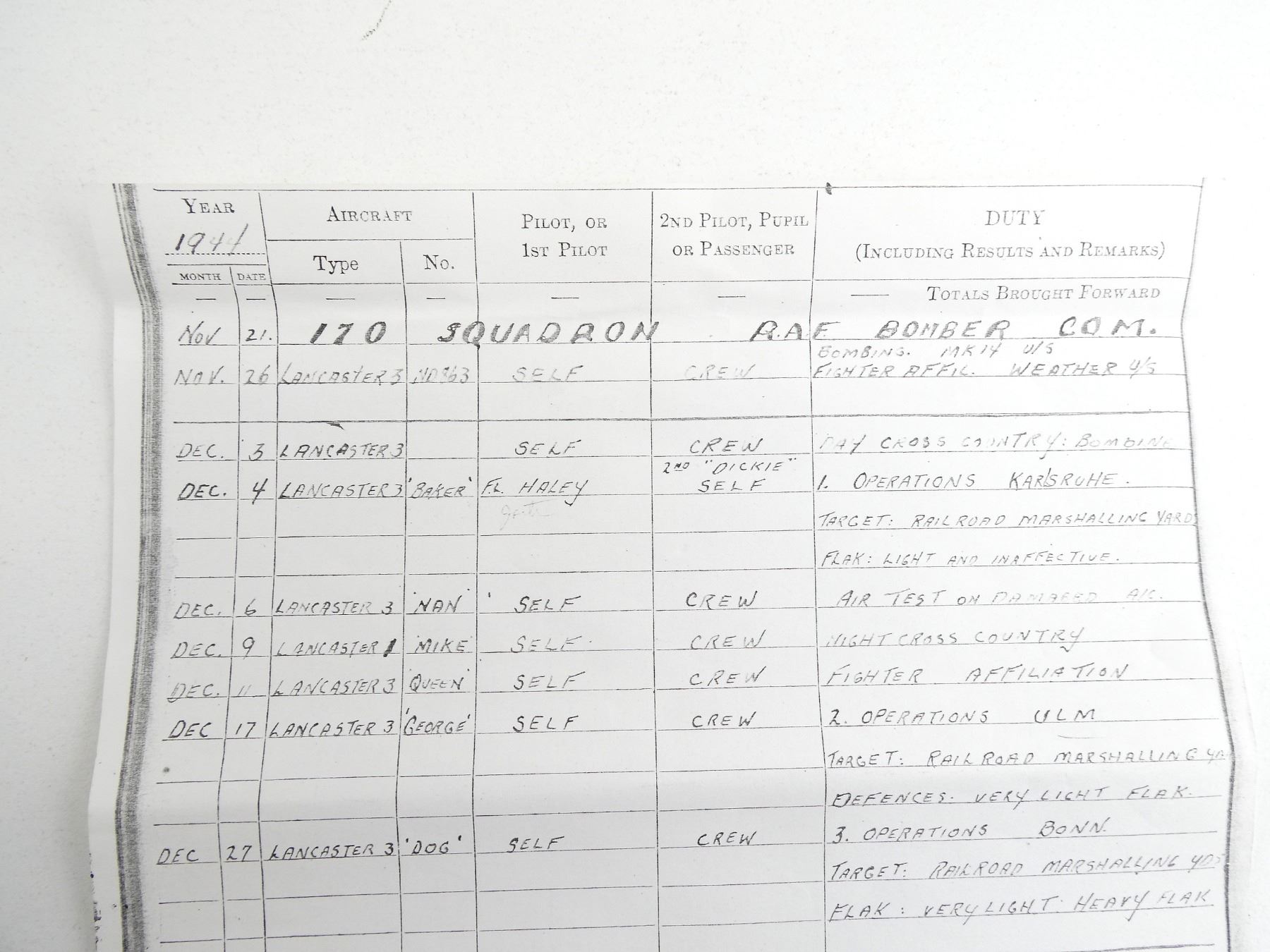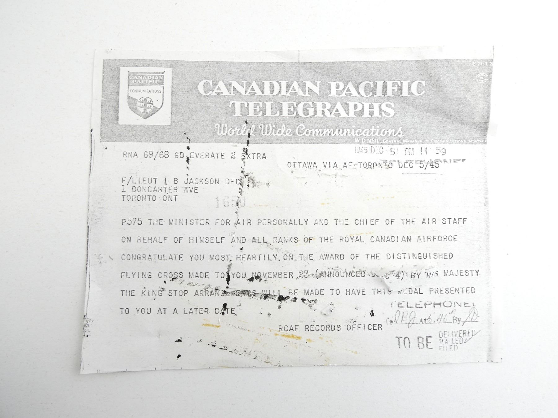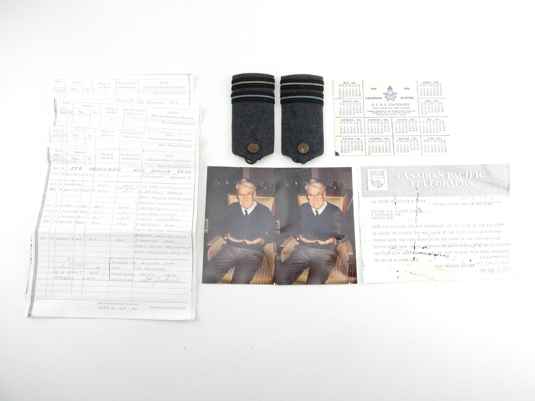 LOT INCLUDES; (2) RCAF FLIGHT LIEUTENANT SHOULDER BOARDS, WITH (2) PHOTOGRAPHS OF THE VETERAN FLIGHT LIEUTENANT HOLDING SAID SHOULDER BOARDS, (1) CANADIAN PACIFIC TELEGRAPH TO F/LIEUT. I.B. JACKSON INFORMING HIM OF BEING AWARDED THE DISTINGUISHED FLYING CROSS, (1) 1944-1945 CALENDAR BLOTTER RCAF STATIONERY & (7) SHEETS DETAILING F/LIEUT. I.B. JACKSONS' FLYING / OPERATIONAL HOURS. SEE PHOTOS.