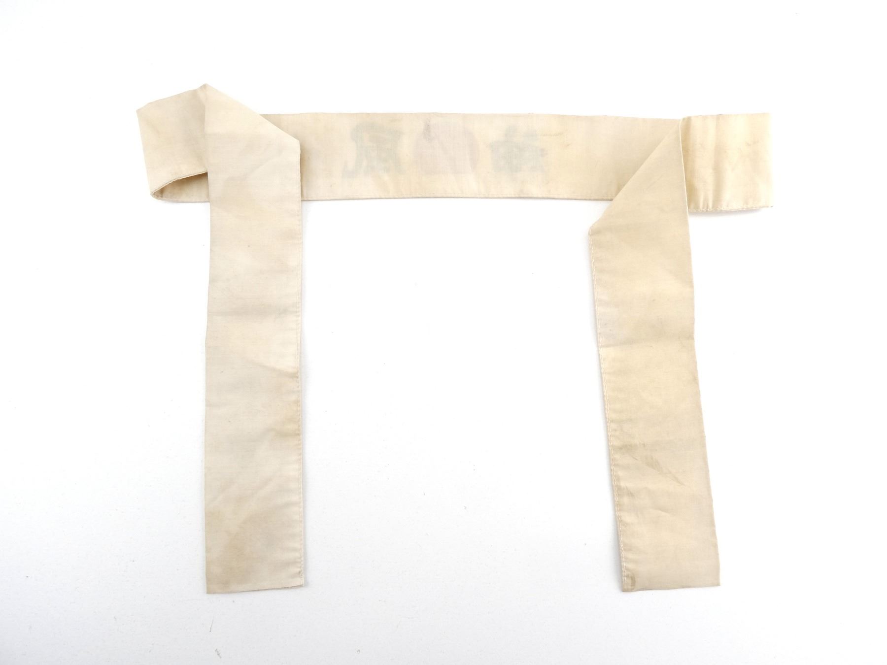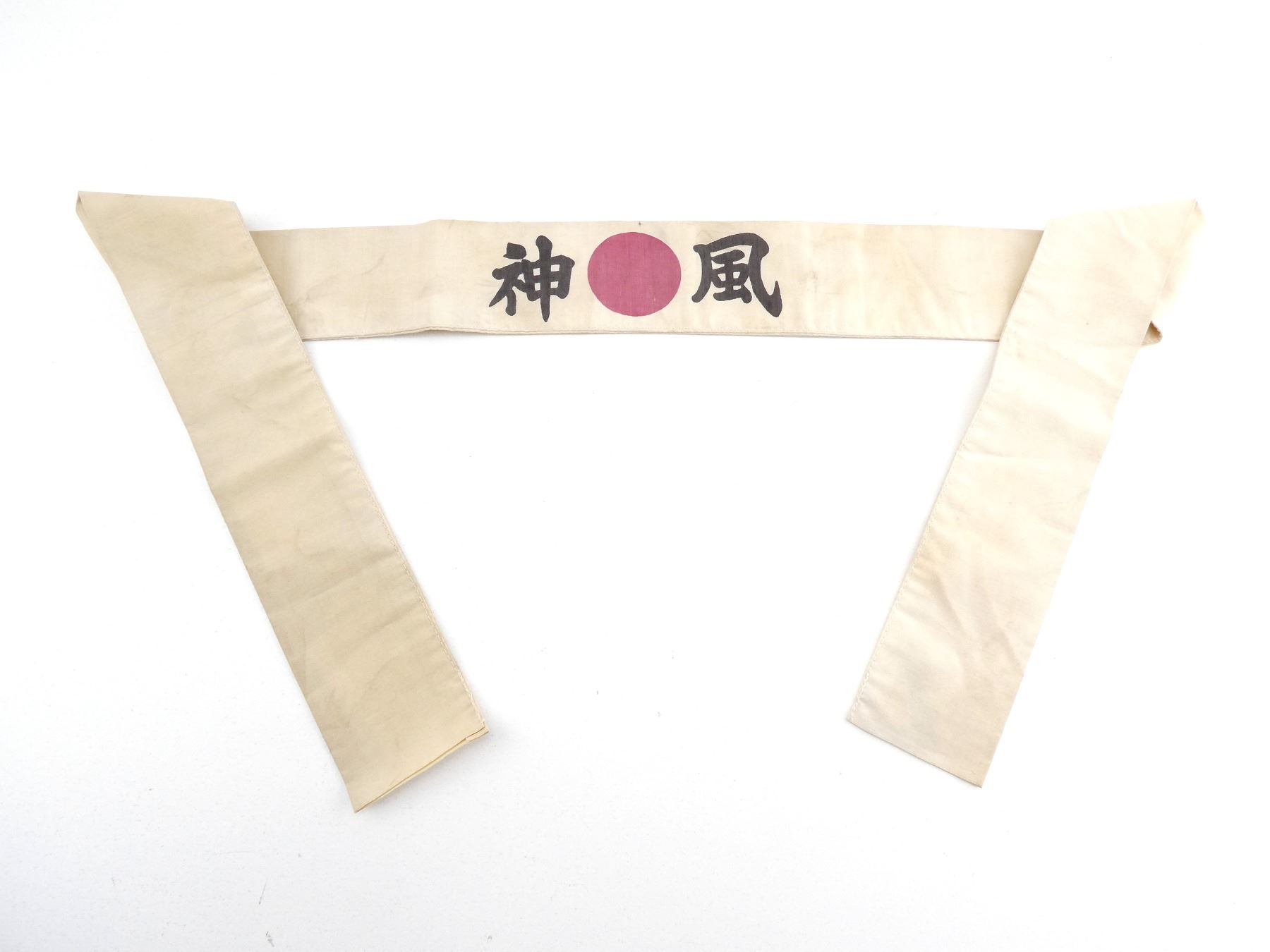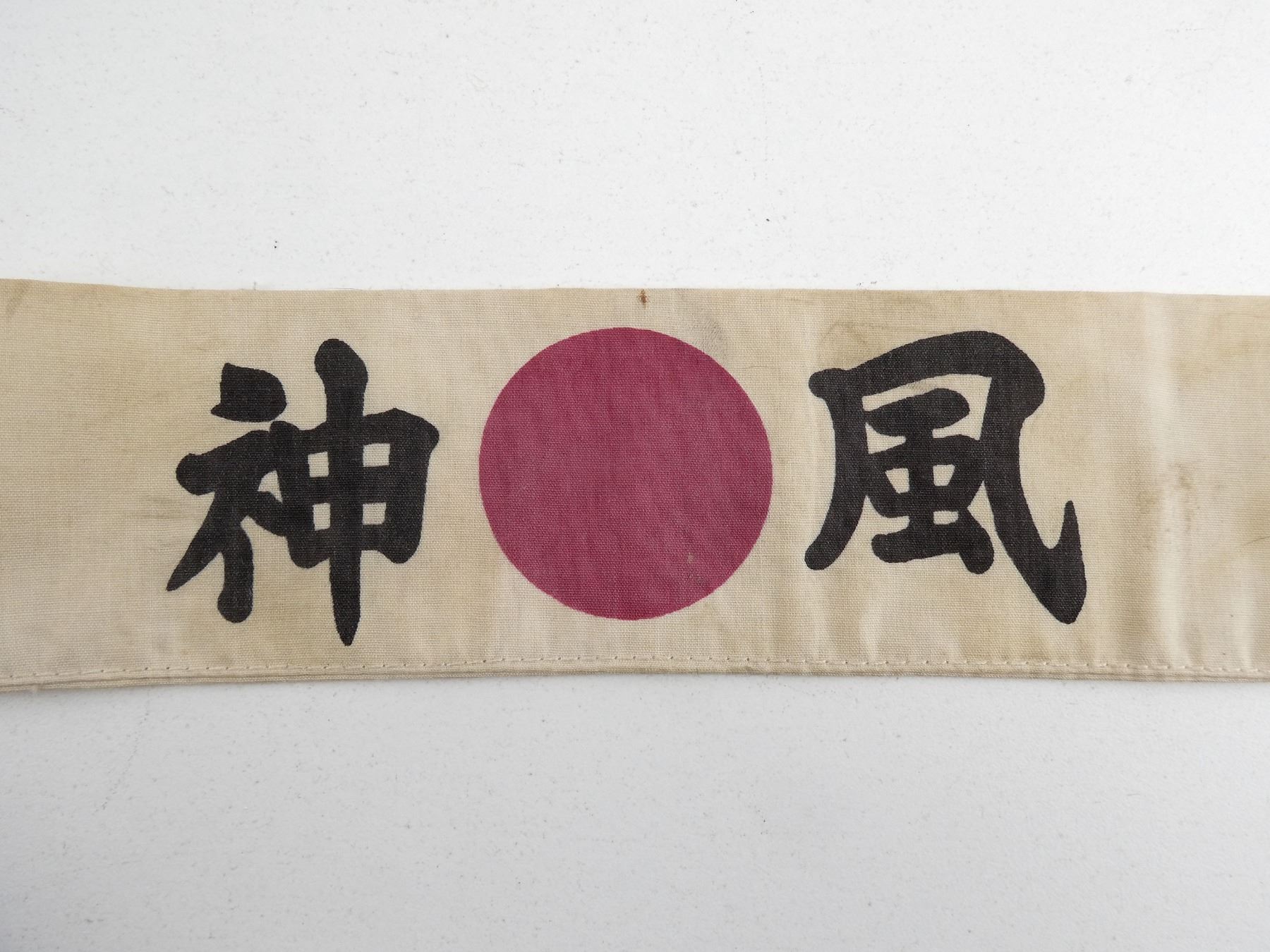 (1) WHITE LINEN / COTTON HEADBAND WITH RED CENTER CIRCLE & JAPANESE CHARACTERS, SHOWS AGE / WEAR, UNSURE OF AGE OR AUTHENTICITY, OAL APPROX. 45". SEE PHOTOS.