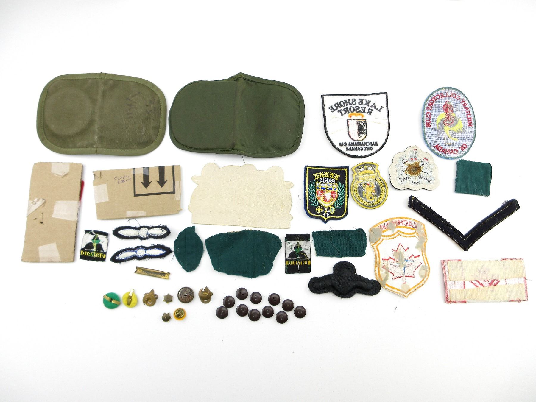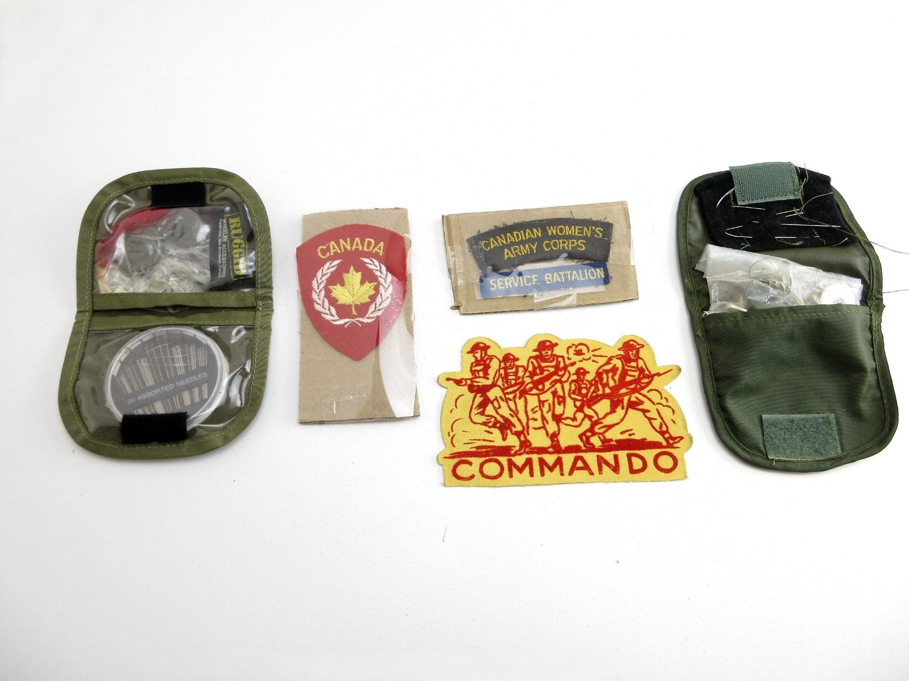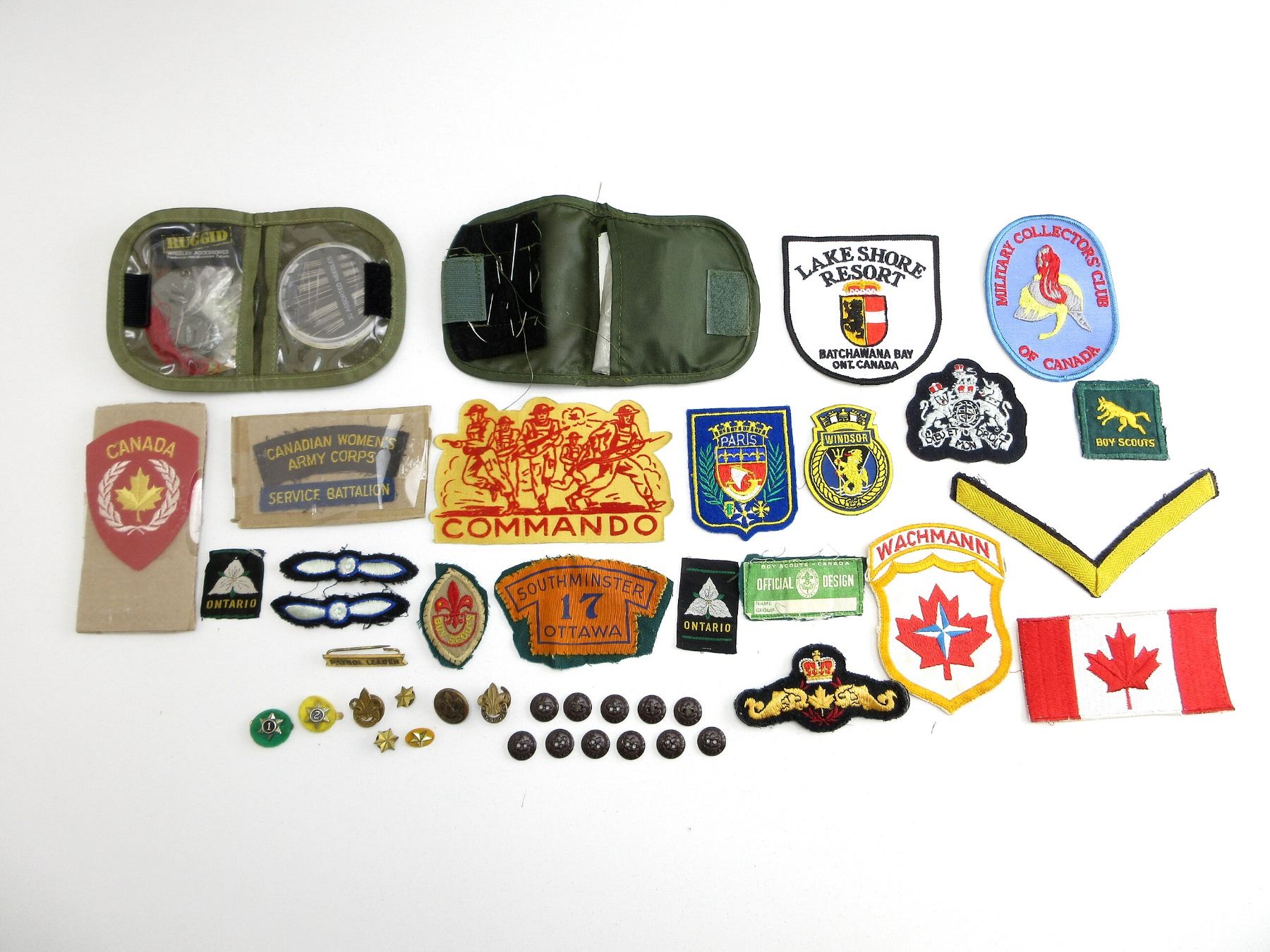 APPROX. (42) PIECES, INCLUDES; HMCS WINDSOR BADGE, SOUTHMINSTER 17 OTTAWA BADGE, RANK CHEVRON, WACHMANN BADGE, CANADIAN FLAG BADGE, VARIOUS BOY SCOUTS CANADA BUTTONS, CANADIAN WOMEN'S ARMY CORPS, SERVICE BATTALION, ONTARIO TRILLIUM LABELS, BOY SCOUT STARS, BOY SCOUTS PATROL LEADER BADGE, CANADIAN MILITARY SEWING KITS WITH VARIOUS NEEDLES, BUTTONS, THREADS, ETC. SEE PHOTOS.