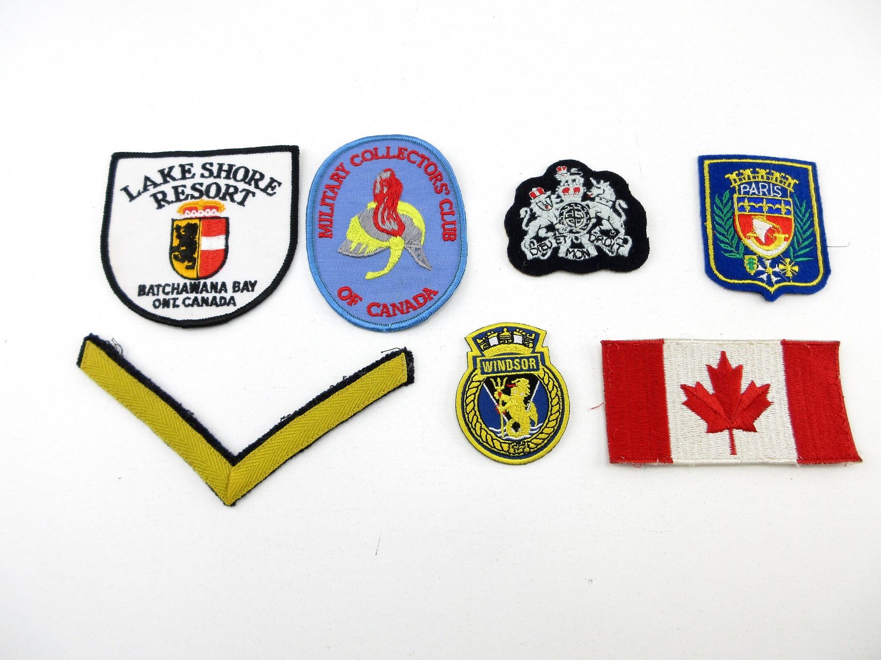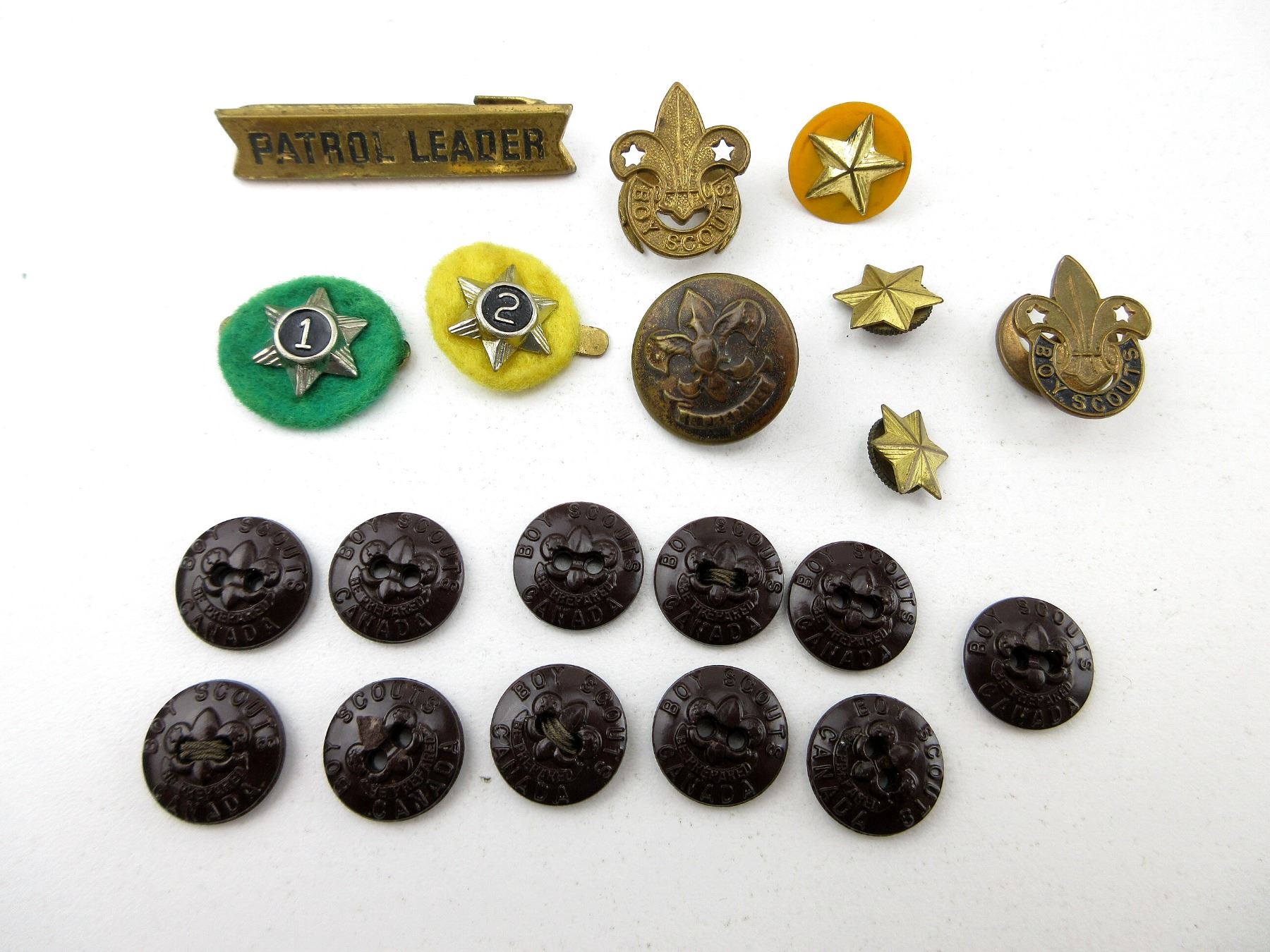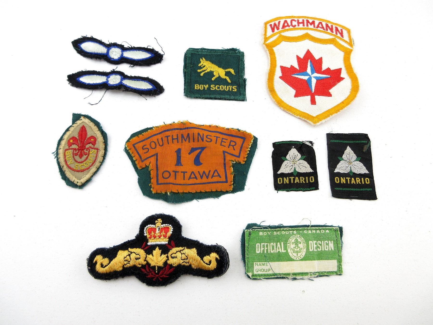 APPROX. (42) PIECES, INCLUDES; HMCS WINDSOR BADGE, SOUTHMINSTER 17 OTTAWA BADGE, RANK CHEVRON, WACHMANN BADGE, CANADIAN FLAG BADGE, VARIOUS BOY SCOUTS CANADA BUTTONS, CANADIAN WOMEN'S ARMY CORPS, SERVICE BATTALION, ONTARIO TRILLIUM LABELS, BOY SCOUT STARS, BOY SCOUTS PATROL LEADER BADGE, CANADIAN MILITARY SEWING KITS WITH VARIOUS NEEDLES, BUTTONS, THREADS, ETC. SEE PHOTOS.