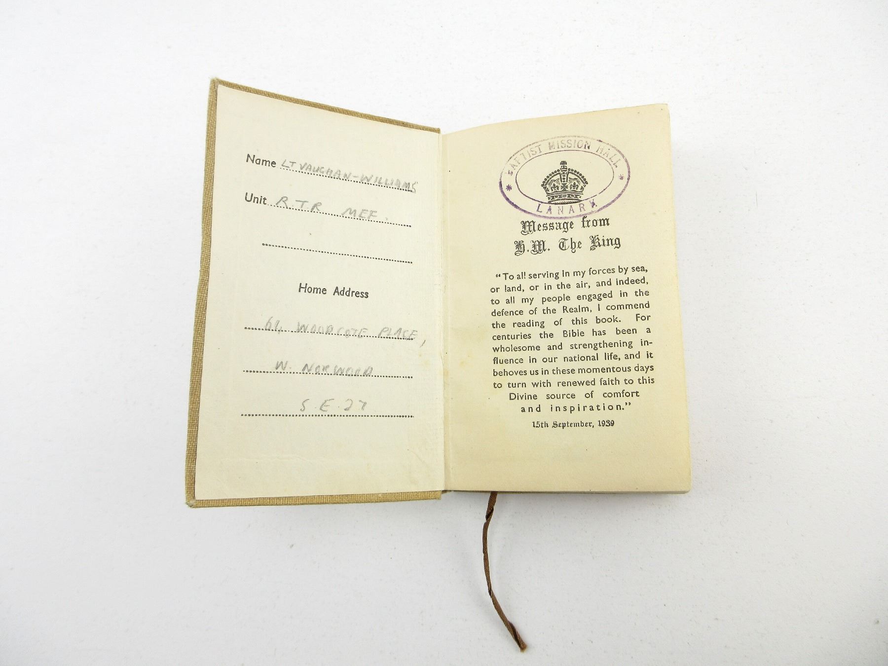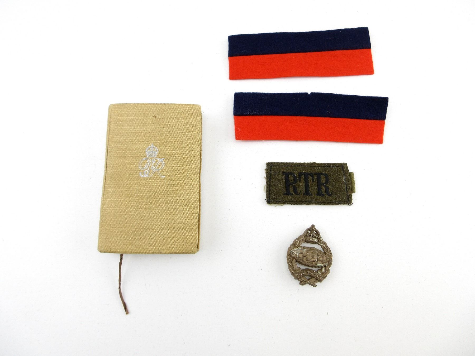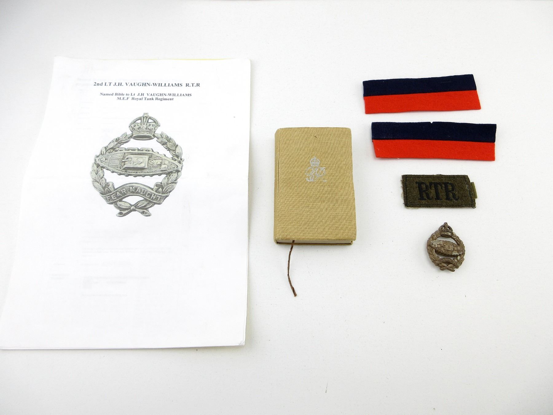 NAMED TO: 2ND LT J.H. VAUGHN-WILLIAMS R.T.R., LOT INCLUDES; (1) NEW TESTAMENT BIBLE NAMED TO: "LT VAUGHN-WILLIAMS, RTR MEF", DATED: "1939", (1) ROYAL TANK REGIMENT PLASTIC CAP BADGE, MARKED: "STANLEY & SONS, WALSALL", PLASTIC CAP BADGES WERE FIRST INTRODUCED INTO THE BRITISH ARMY IN 1941 AS A RESULT OF METAL SHORTAGES, (1) RTR GREEN WOOL BADGE, (2) BLUE / RED DIVISION BADGES & (4) INFORMATION SHEETS / RECORD DETAILS OF LT. J.H. VAUGHN-WILLIAMS AND HIS SERVICE. SEE PHOTOS.