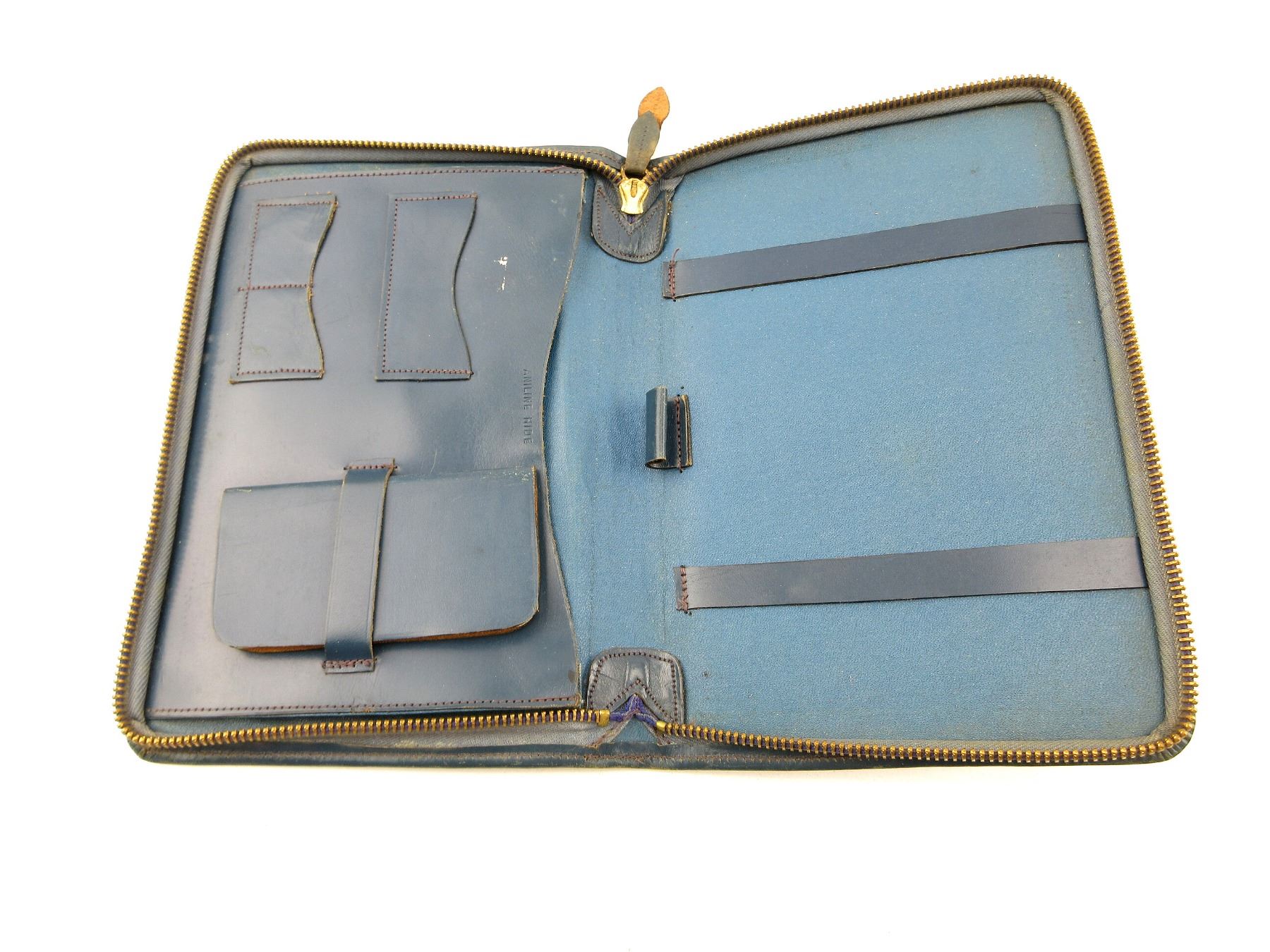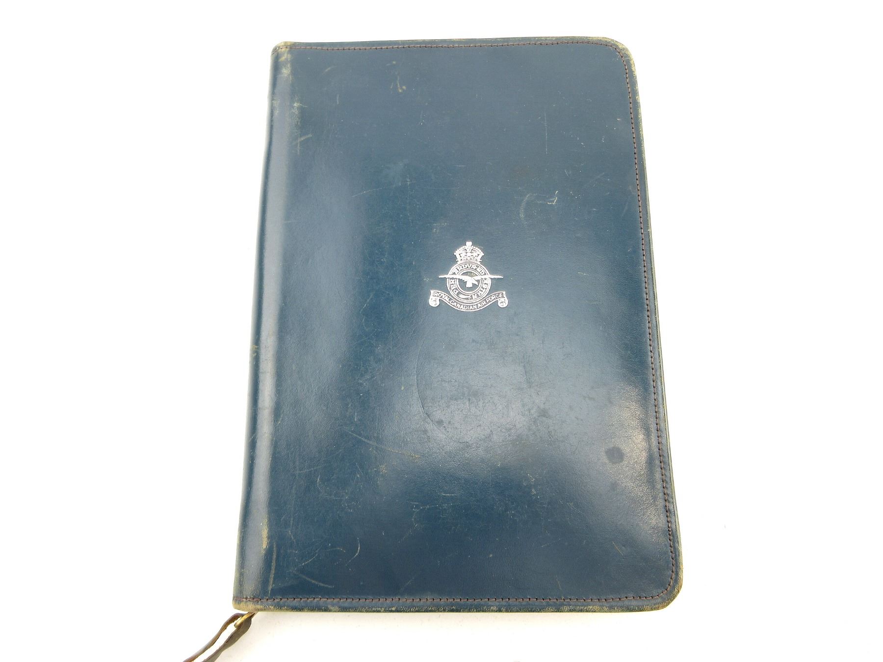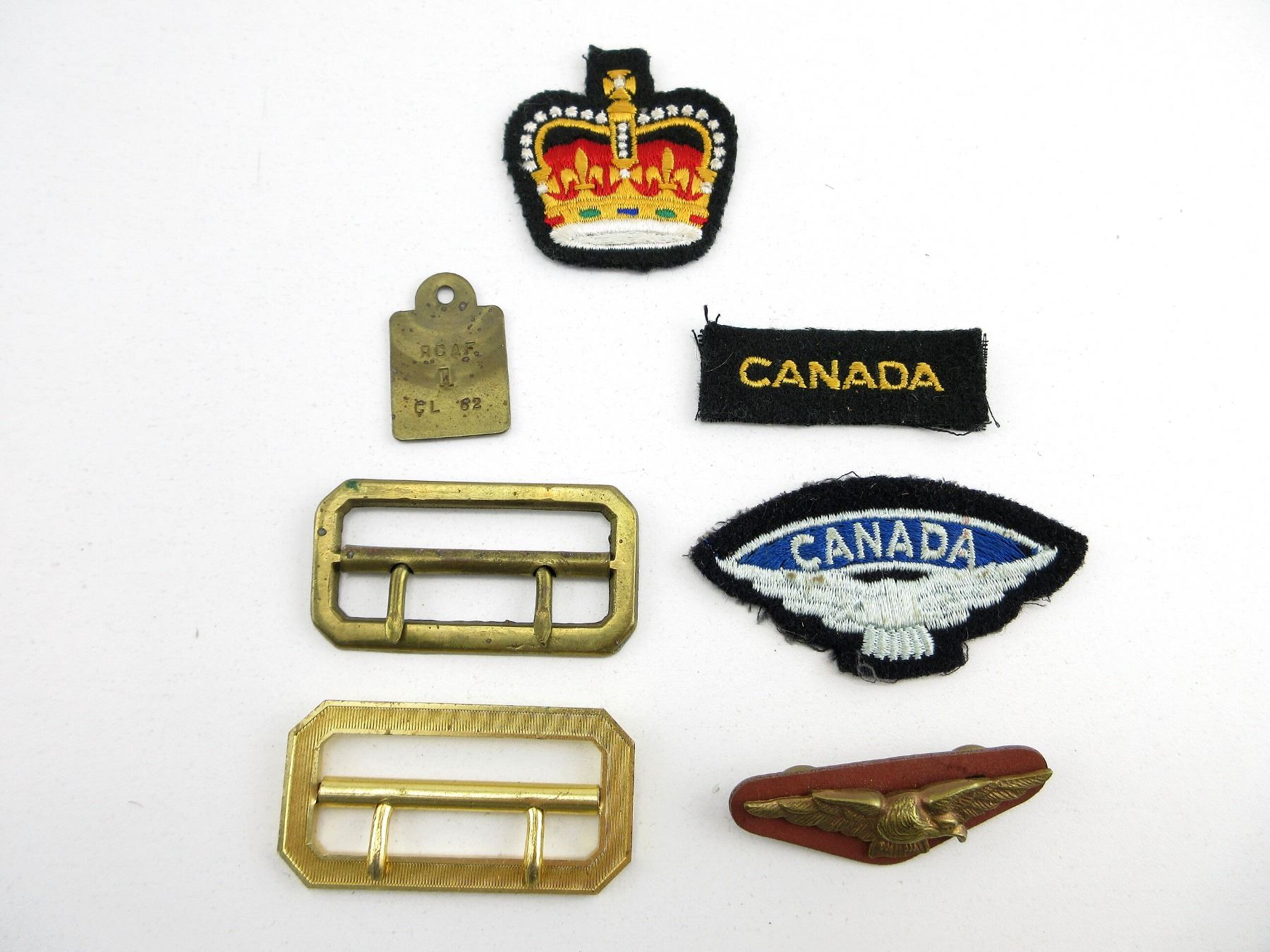 APPROX. (33) PIECES, KING'S & QUEEN'S CROWNS, INCLUDES; RCAF WOOL BADGE, CANADA BADGE, RCAF BRASS EAGLE BADGE, BRASS BELT BUCKLES, VARIOUS BRASS RCAF BUTTONS, QUEEN'S CROWN BADGE, BLUE NOTE CASE MARKED: KING'S CROWN OVER "ROYAL CANADIAN AIR FORCE" WITH EAGLE, ZIPPERED (WORKS), APPROX. 8 5/8" X 6". SEE PHOTOS.