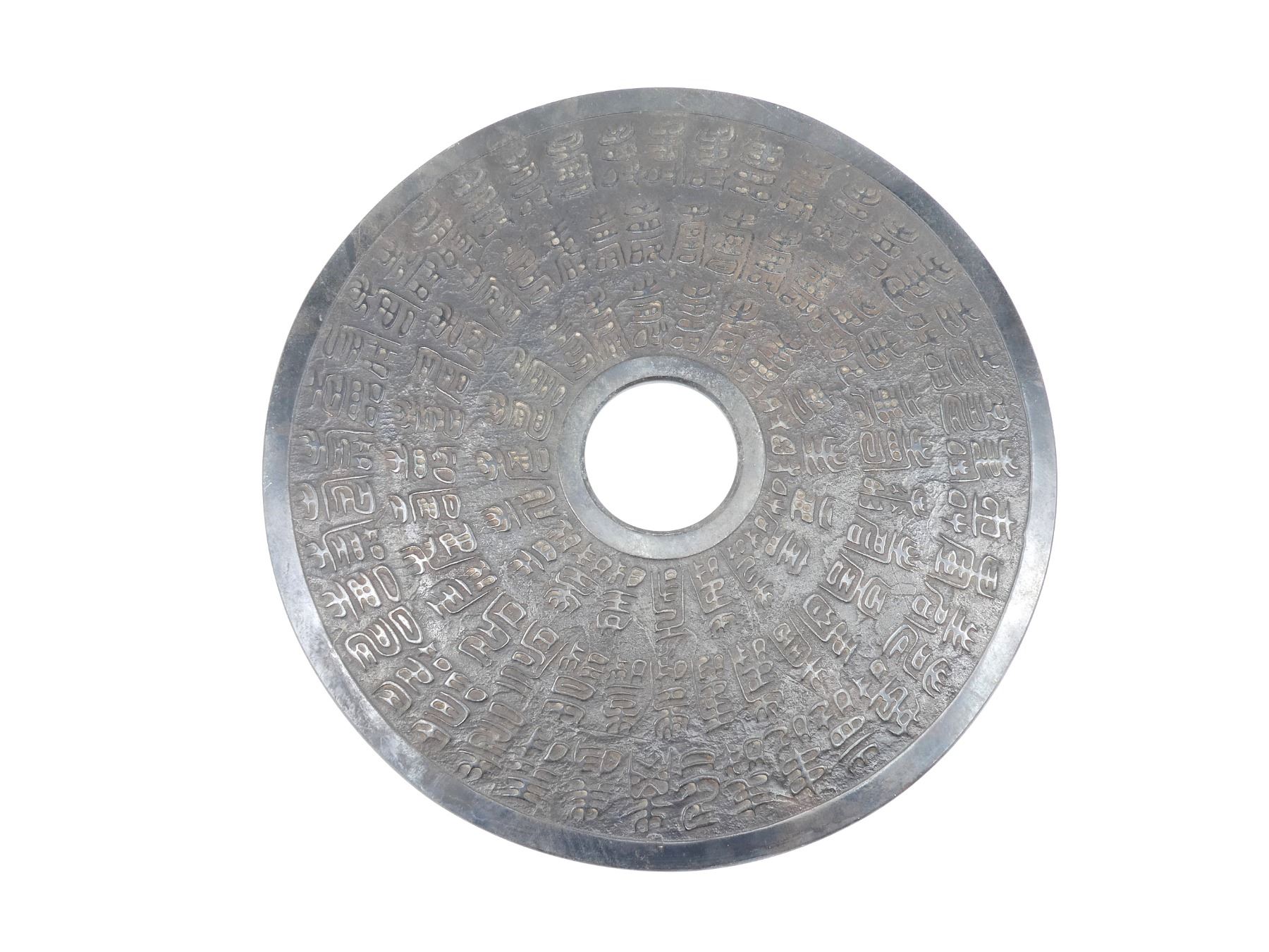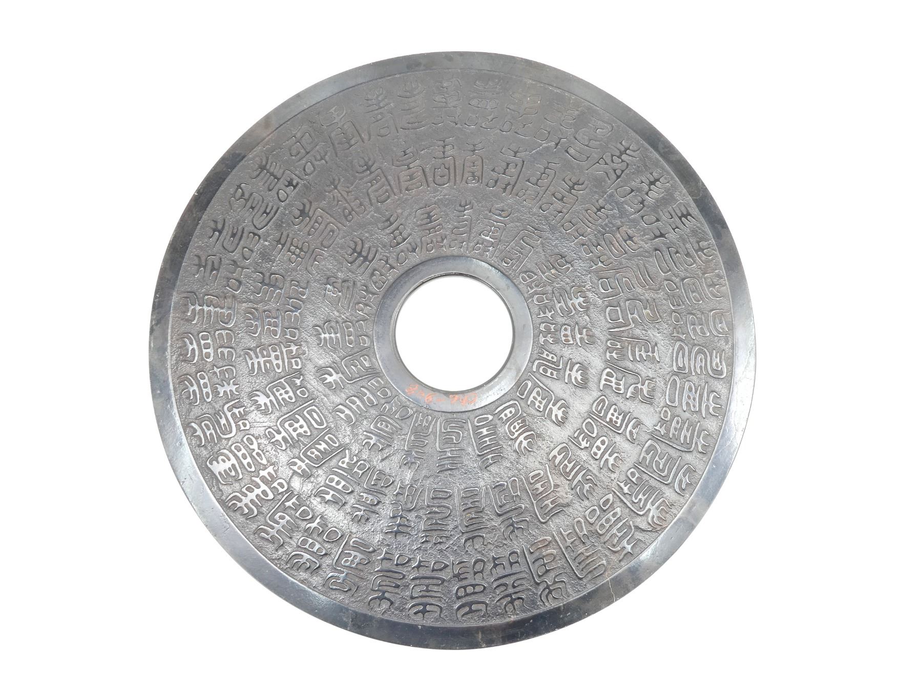 (1) JADE ORNAMENT, CONSIGNOR STATES: "19TH CENTURY", VARIOUS CHINESE CHARACTERS ON EITHER SIDE, APPROX. 23.5" DIA. SEE PHOTOS. *ADDITIONAL CHARGES MAY APPLY* *NO GUARANTEE ON SHIPPING DAMAGES*