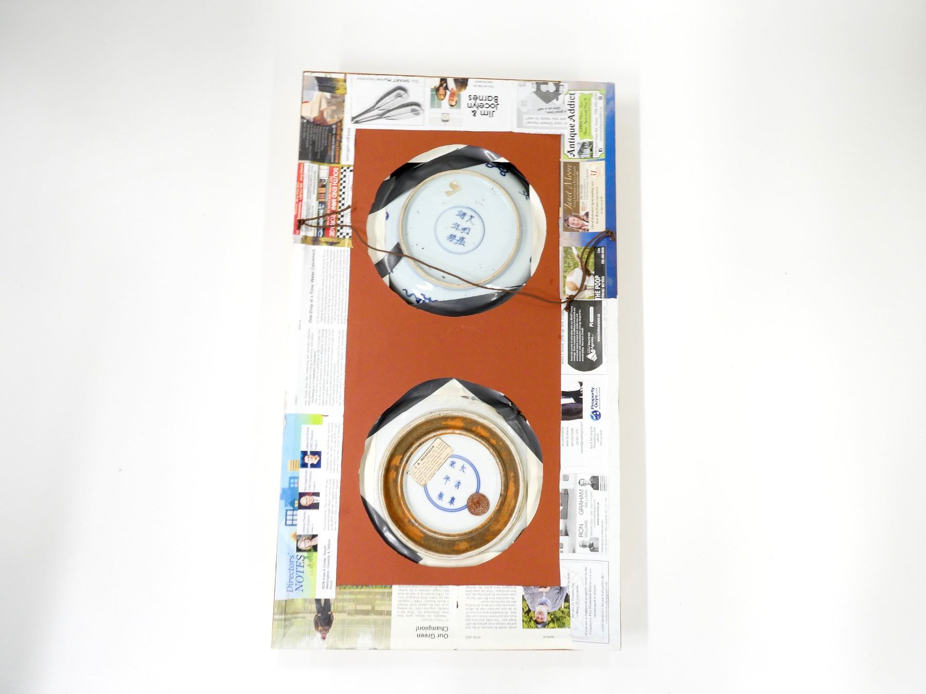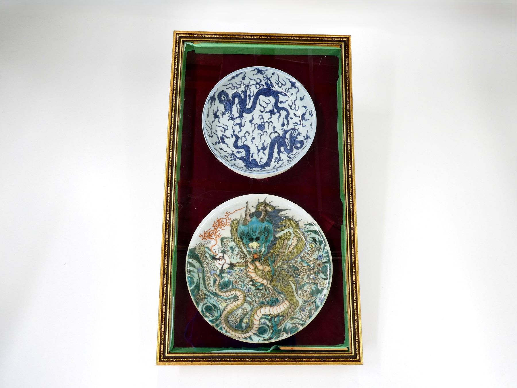 (1) SET OF TWO IMPERIAL DRAGON PLATES, UNDER GLASS, CONSIGNOR STATES: "TWO EARLY CHINESE MINISTRY OF WAR ISSUED IMPERIAL DRAGON PLATES", VARIOUS CHINESE CHARACTERS ON BOTTOMS OF PLATES, PLATES APPROX. 11.25" & 9.25" DIAMETERS, FRAME APPROX. 26 3/8" X 15" X 2.5". SEE PHOTOS. *NO GUARANTEE ON GLASS FOR SHIPPING*