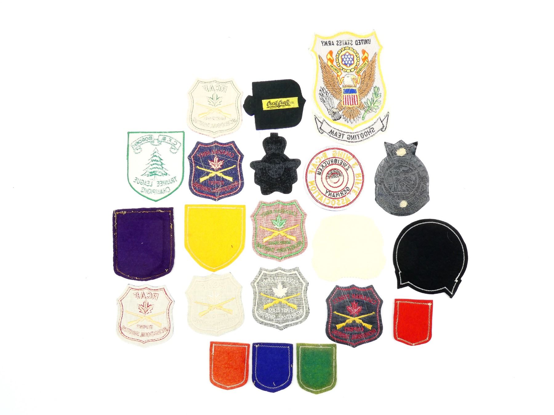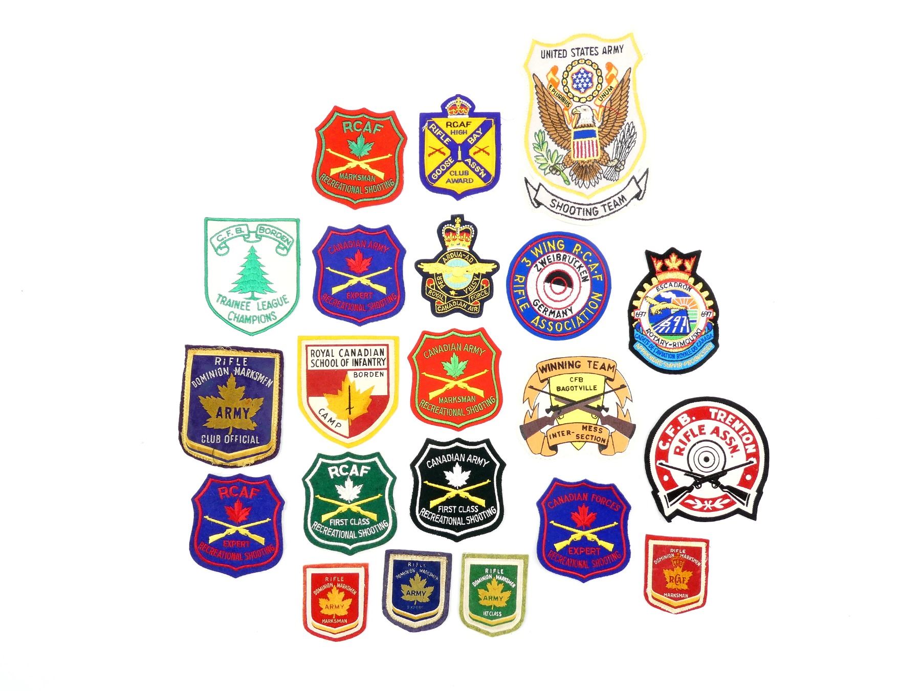 APPROX. (21) BADGES, INCLUDES; U.S. ARMY SHOOTING TEAM, RCAF MARKSMAN RECREATIONAL SHOOTING, RCAF EXPERT RECREATIONAL SHOOTING, RCAF HIGH RIFLE BAY GOOSE ASS'N CLUB AWARD, C.F.B. BORDEN TRAINEE LEAGUE CHAMPIONS, C.F.B. TRENTON RIFLE ASSOCIATION, ETC. SEE PHOTOS.