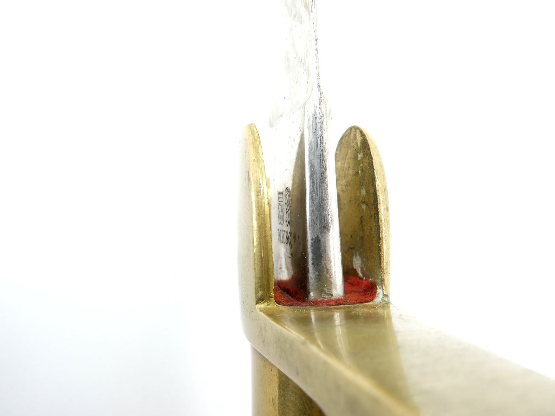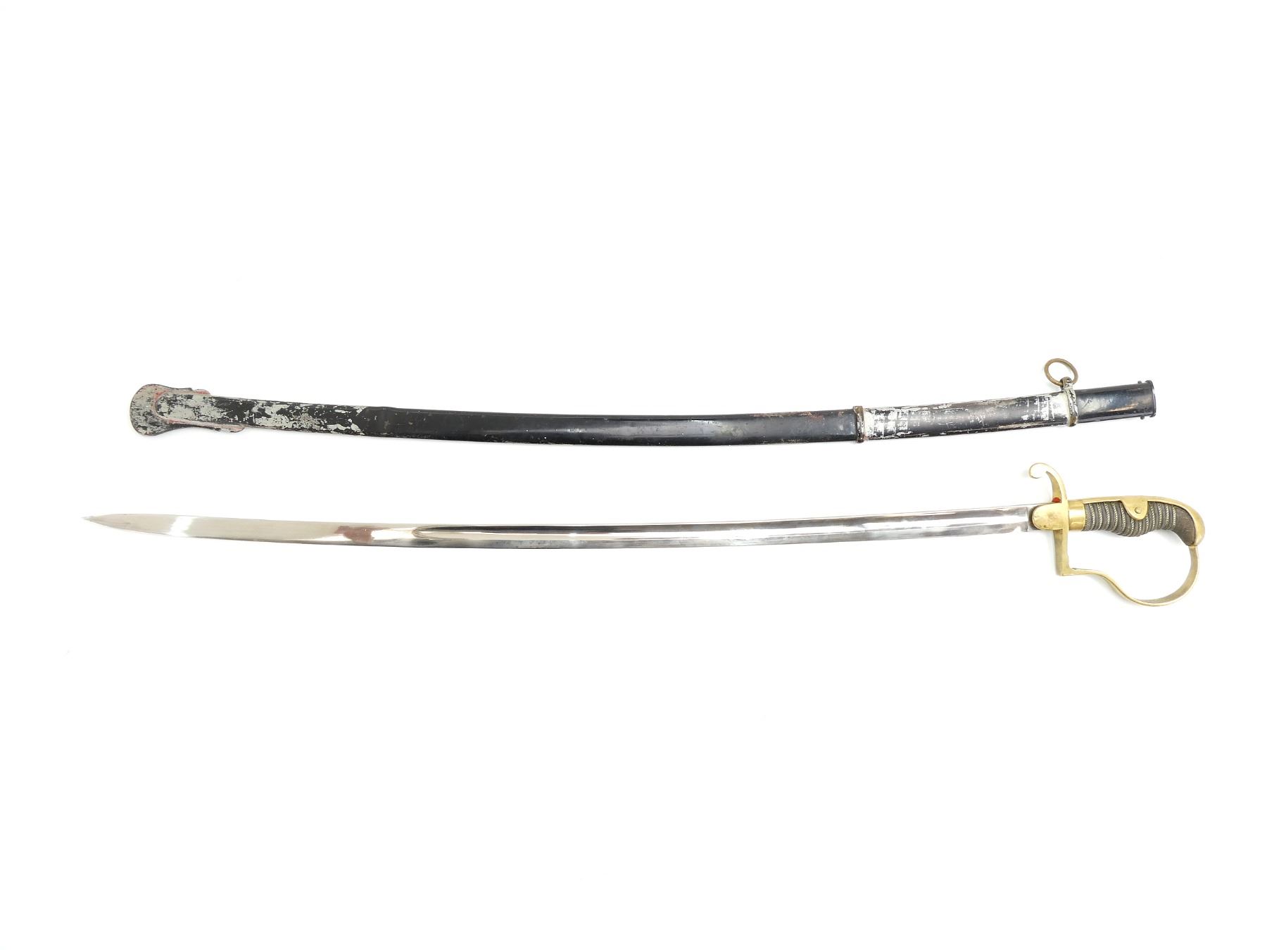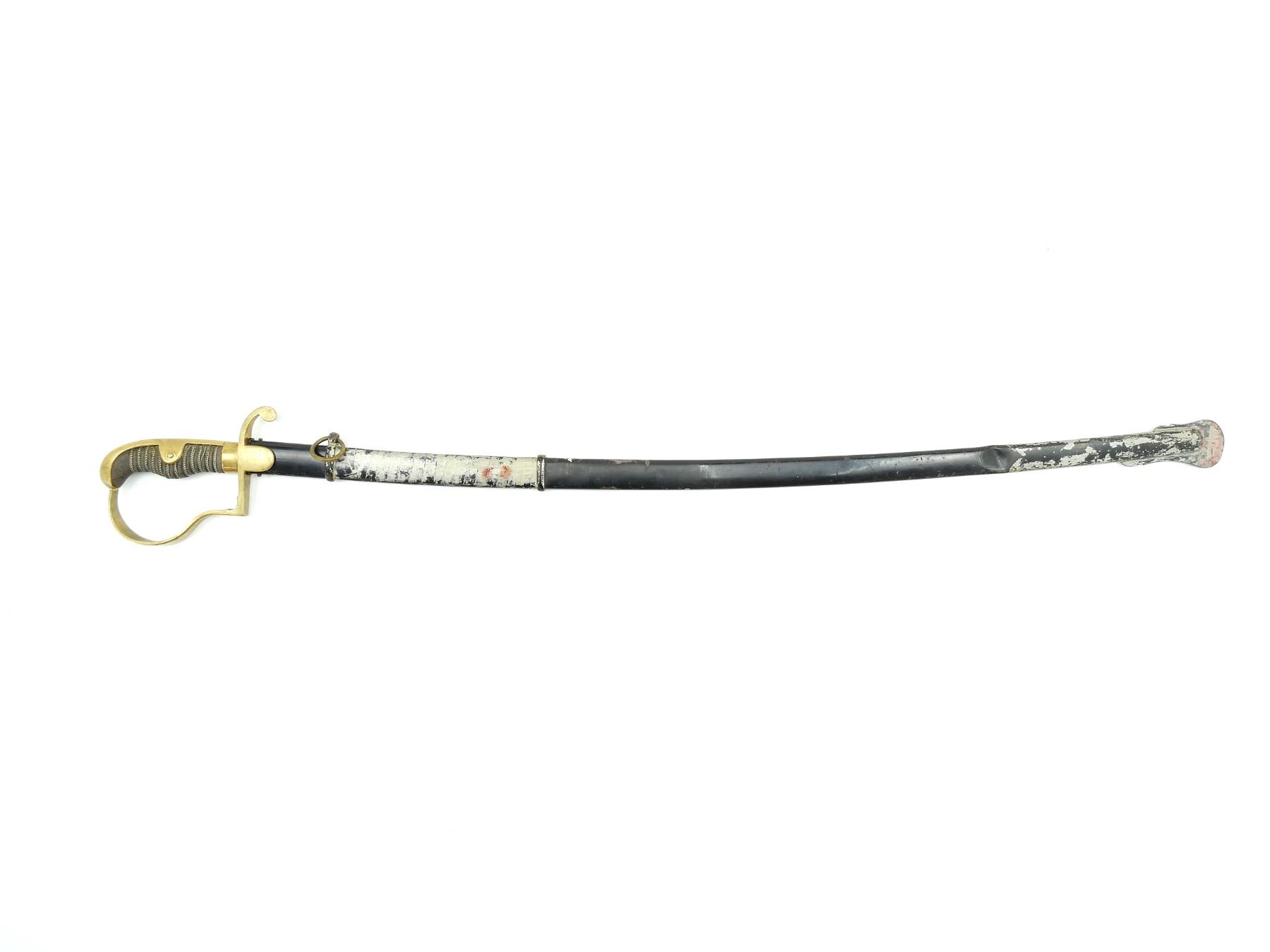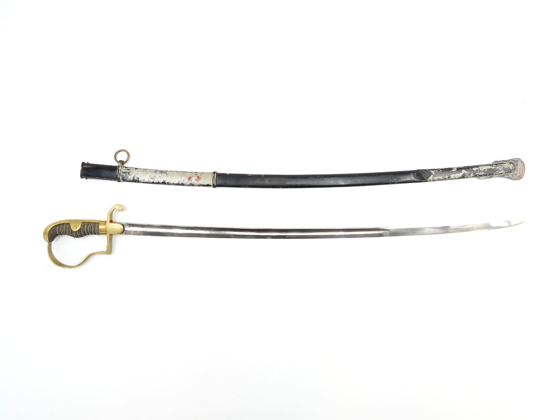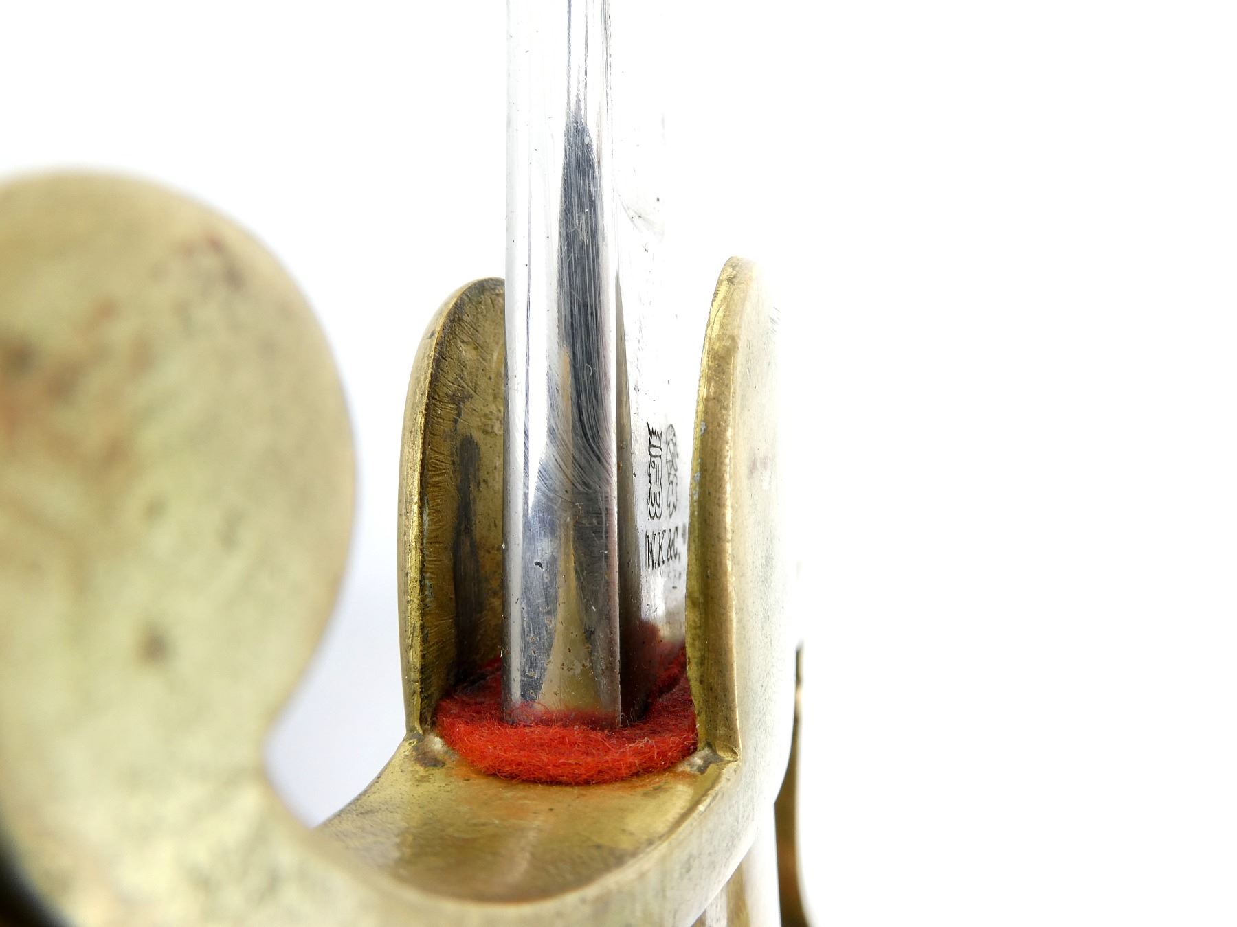 (1) SLIGHTLY CURVED 2/3RD'S FULLERED BLADE, MARKED: KING'S HEAD / KNIGHT'S HEAD OVER "WK&C", RED WOOL WASHER / BUFFER PAD, BRASS CROSS-PIECE, BLACK TRIPLE WIRE WRAPPED GRIP, ALL WIRE IS TWISTED, BRASS D-SHAPED HILT, DOVE HEAD SHAPED BRASS POMMEL, NO VISIBLE MARKINGS, BLACK PAINTED STEEL SCABBARD WITH ONE HANGER LOOP, NO VISIBLE MARKINGS, BLADE APPROX. 31 7/8" & OAL APPROX. 37". SEE PHOTOS.