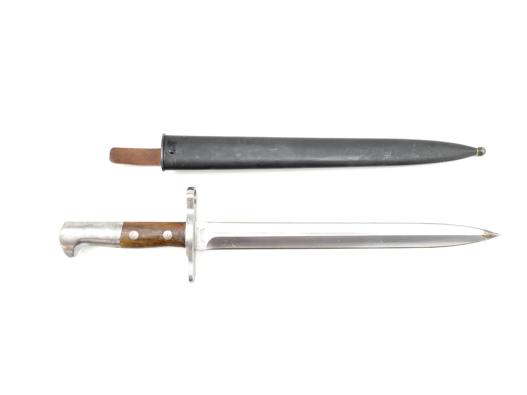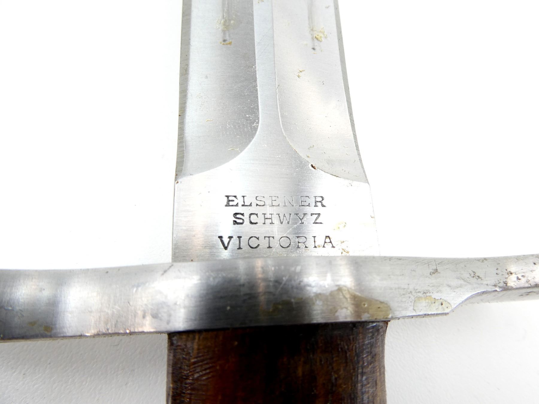 (1) FITS 7.5MM M1911 CARBINES & M1931 SHORT (K31) RIFLES, RICASSO MARKED: "ELSENER, SCHWYZ, VICTORIA", CROSS-PIECE MARKED WITH SWISS CROSS & PROOF MARK, 2-PIECE WOOD GRIP, METAL POMMEL, NO VISIBLE MARKINGS, STEEL SCABBARD WITH LEATHER TAB, THROAT MARKED: "P", UNDER LEATHER TAB MARKED: "P", BALL-TIP HAS SWISS CROSS, BLADE APPROX. 11 7/8" & OAL APPROX. 17". SEE PHOTOS.