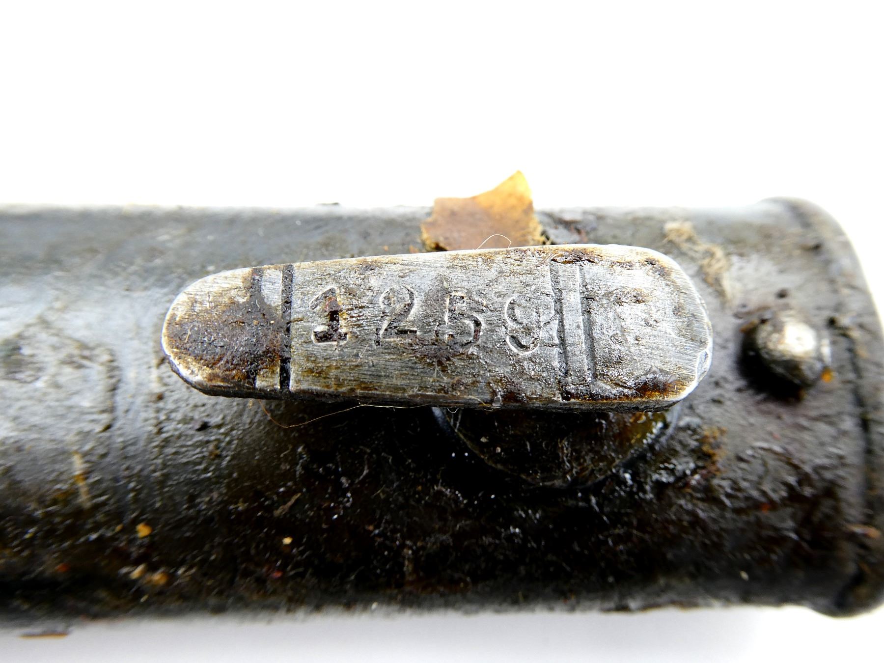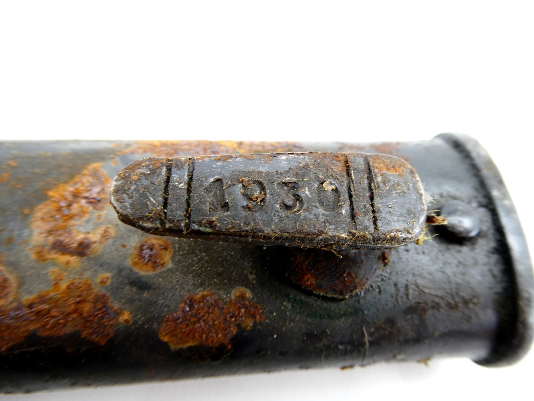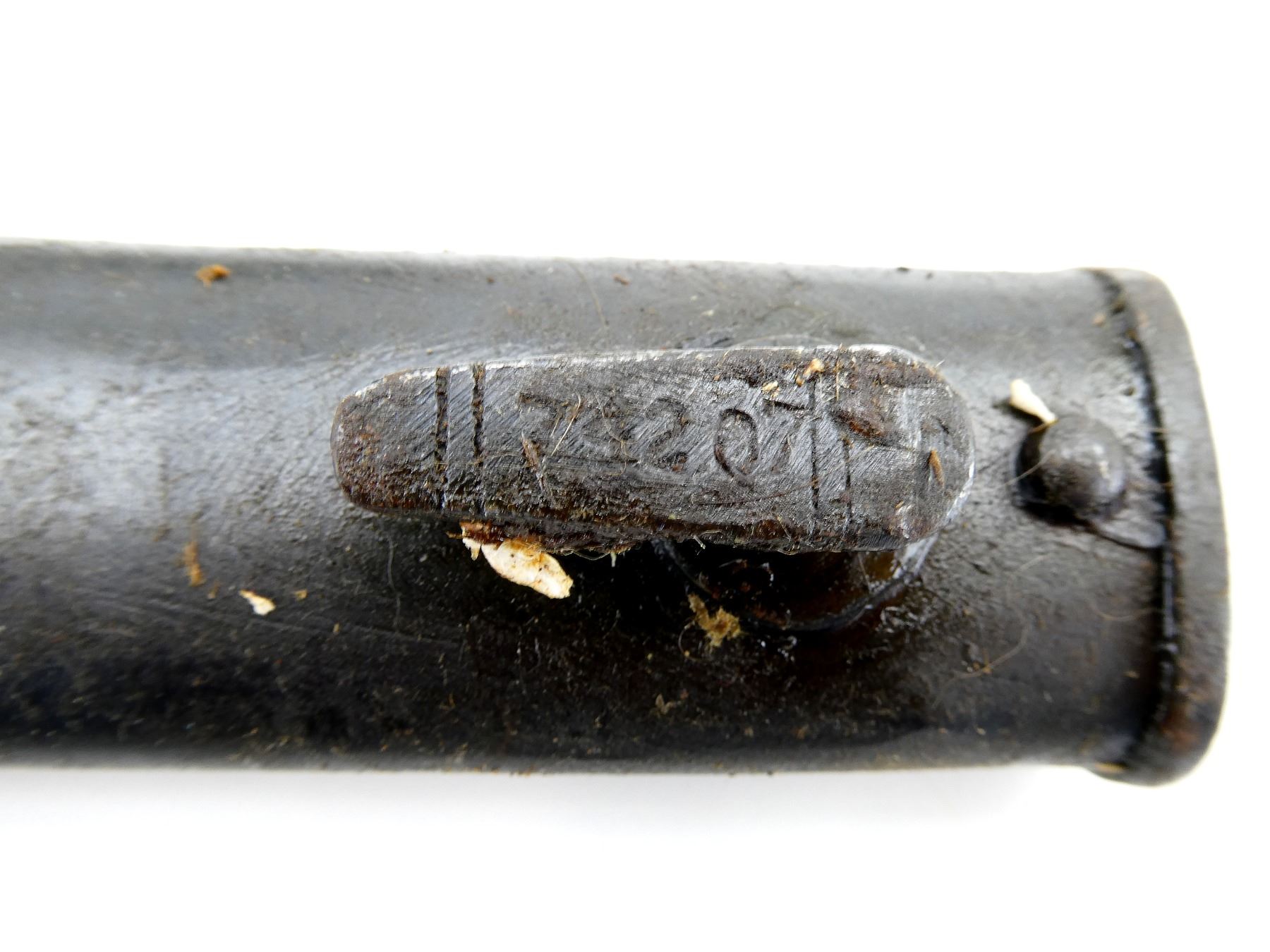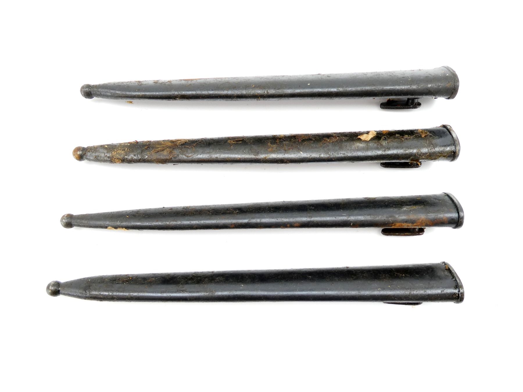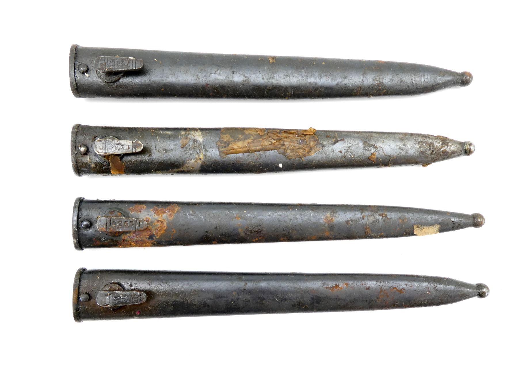 LOT INCLUDES; (4) STEEL SCABBARDS (NO BAYONETS), STUDS MARKED: "1259", "74207", "1930", "3382", TWO WITH PROOF MARK UNDER THROAT, ALL SHOW AGE / WEAR / TEAR, OALS APPROX. 10 3/8 TO 10 5/8". SEE PHOTOS. *COVERED IN GREASE*
