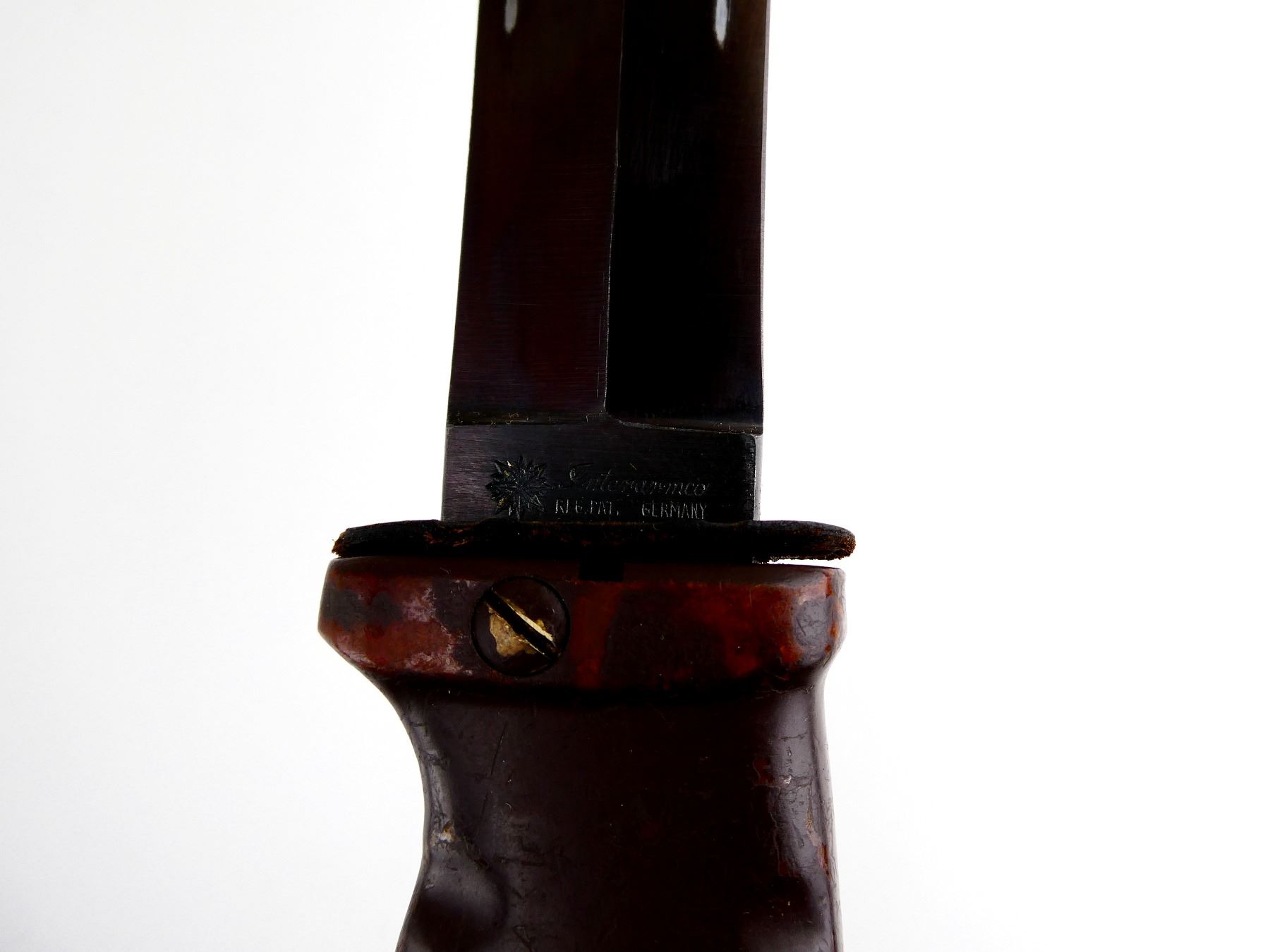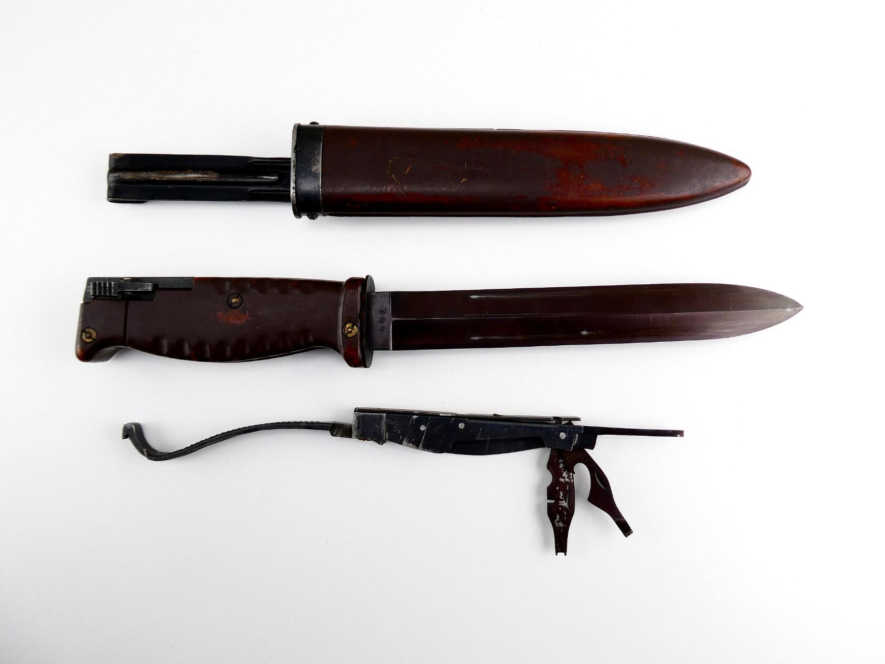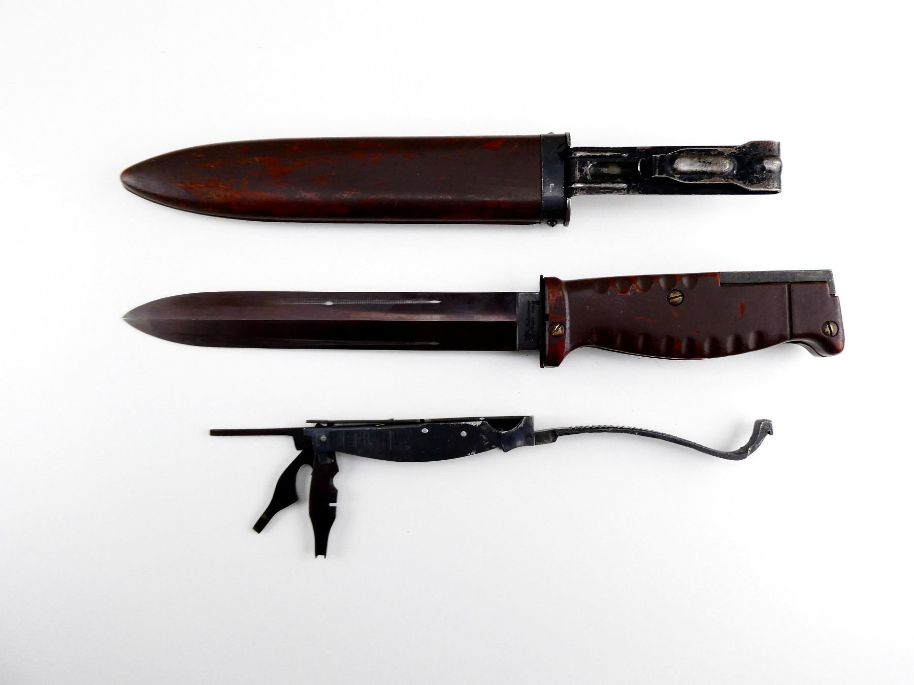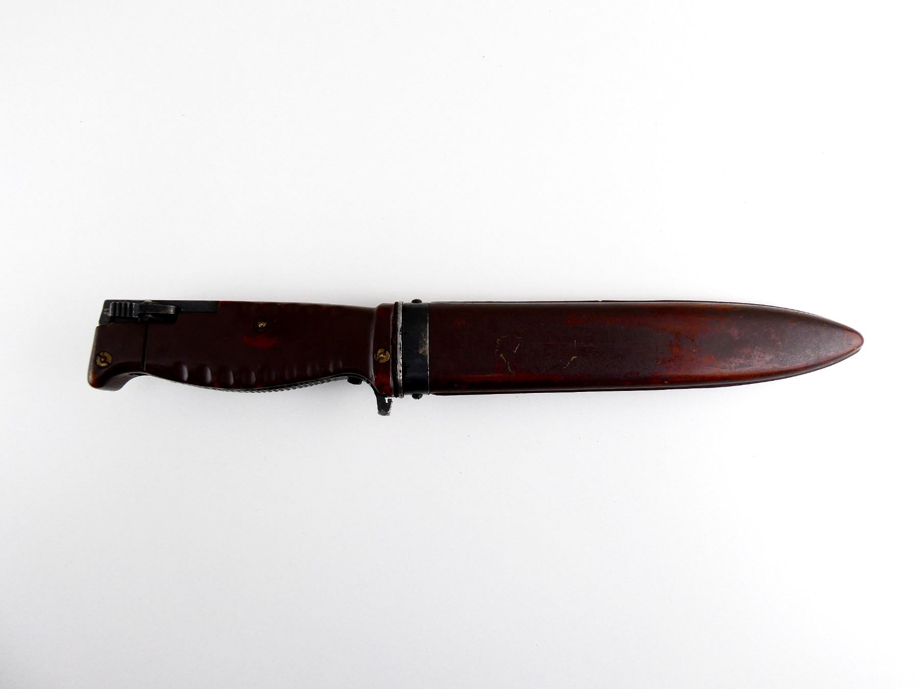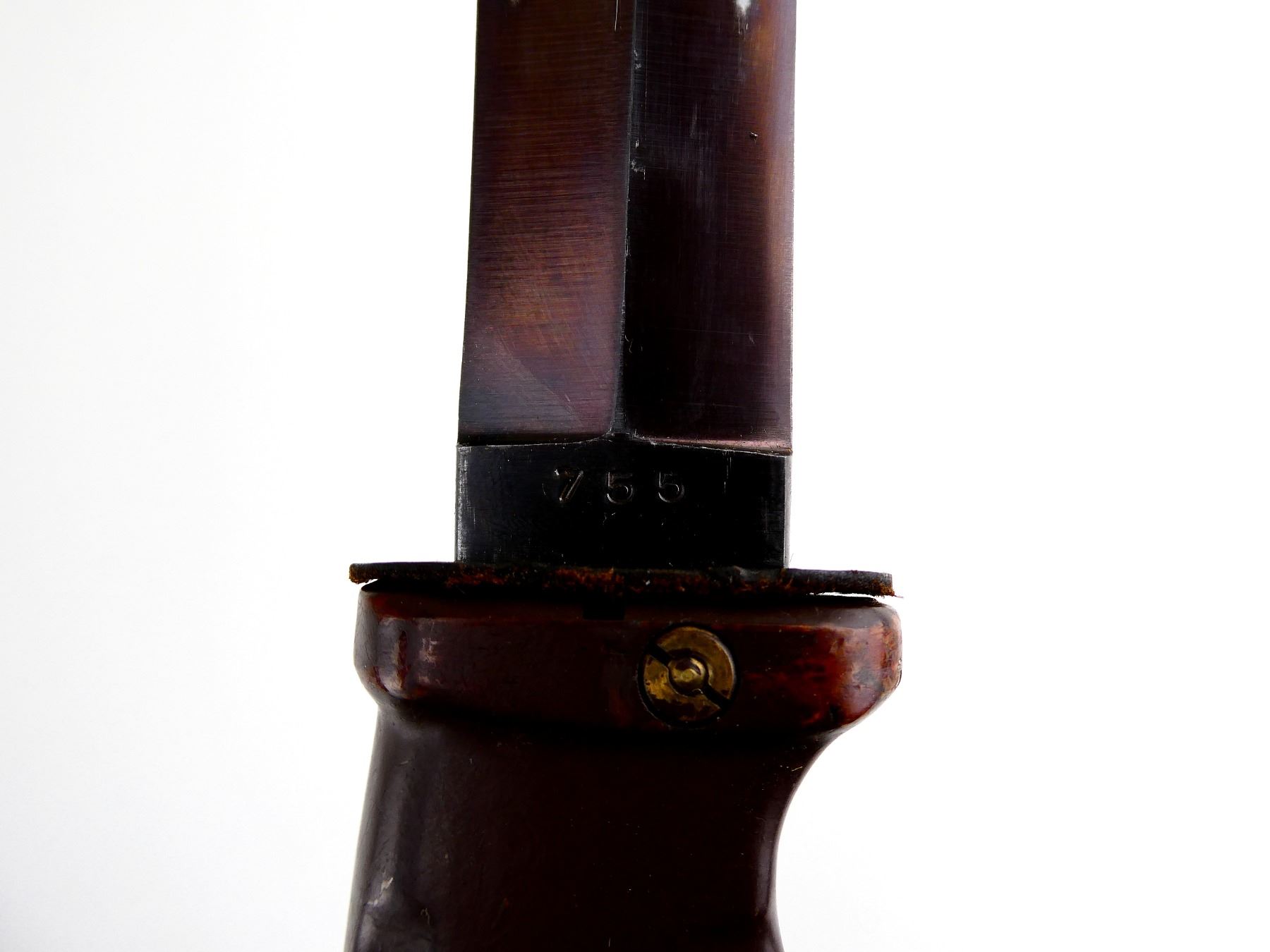 (1) FITS 7.62N SEMI-AUTO RIFLES, DOUBLE-EDGE BLADE, RICASSO MARKED: "INTERARM CO. (SAMUEL CUMMIN'S COMPANY - APPROX. 2508 MANUFACTURED), REG. PAT. GERMANY", OTHER-SIDE MARKED: "755", 2-PIECE GROOVED BROWN POLYMER GRIP, INCLUDES TOOL KIT / CORKSCREW IN HANDLE, ALL INTACT, BROWN POLYMER SCABBARD WITH STEEL BELT HOOK, NO VISIBLE MARKINGS, BLADE APPROX. 7 7/8" & OAL APPROX. 13". SEE PHOTOS.