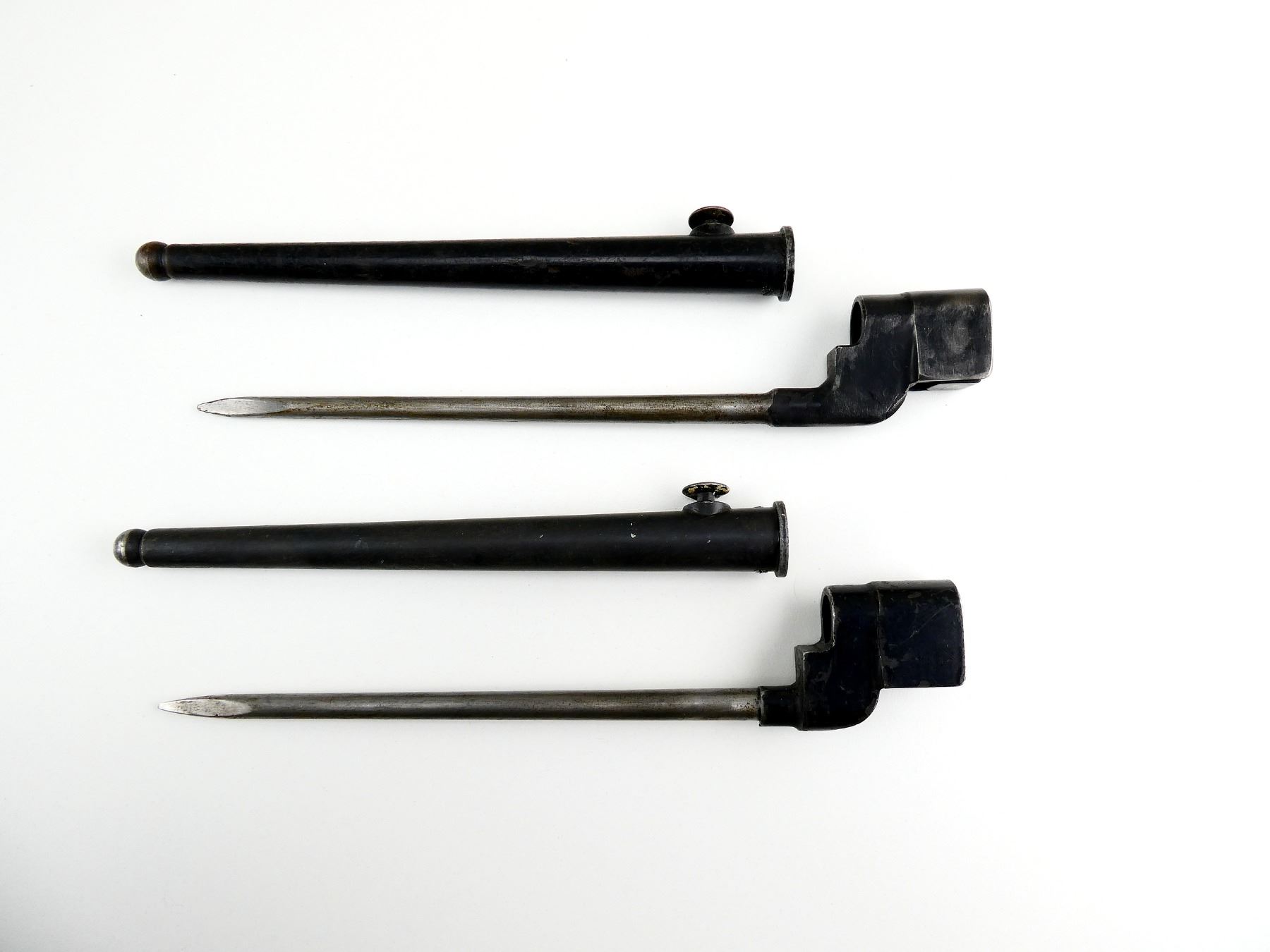 LOT INCLUDES; (1) NO.4 MKII SPIKE BAYONET, FITS LEE ENFIELD NO.4 MKI & MKII SERIES RIFLES, SOCKET MARKED WITH BROAD ARROW, RELEASE BUTTON MARKED: "N67", METAL MK. I SCABBARD, NO VISIBLE MARKINGS, BLADE APPROX. 8", OAL APPROX. 10" & (1) NO.4 MKII* SPIKE BAYONET, FITS LEE ENFIELD NO.4 MKI & MKII SERIES RIFLES, SOCKET FAINTLY MARKED: "??4 MK II*, PSK" & "52", METAL MK. I SCABBARD, NO VISIBLE MARKINGS, THROAT IS LOOSE, BLADE APPROX. 8" & OAL APPROX. 9 7/8". SEE PHOTOS.