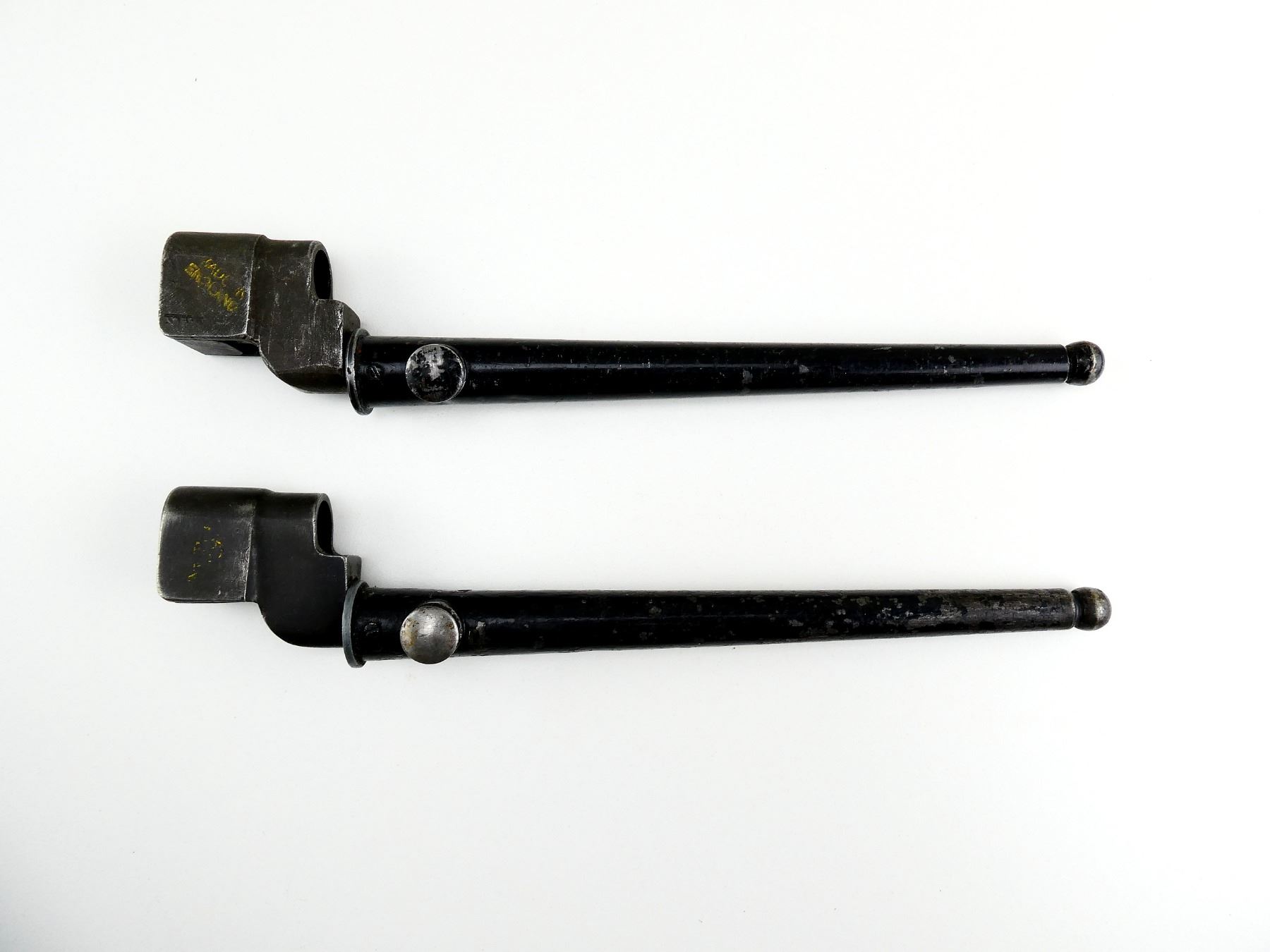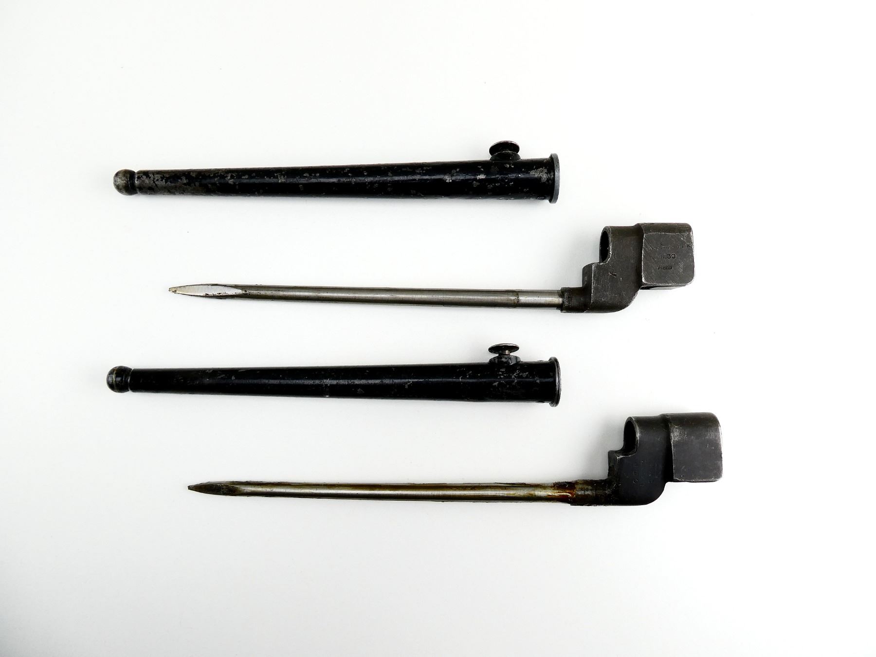LOT INCLUDES; (1) NO.4 MKII SPIKE BAYONET, FITS LEE ENFIELD NO.4 MKI & MKII SERIES RIFLES, SOCKET FAINTLY MARKED: "G" CROWN "R" OVER "NO4 MKII" OVER "S?" & "N67", METAL MK. I SCABBARD, THROAT MARKED: "NO.4 MK1", BLADE APPROX. 8", OAL APPROX. 9 7/8" & (1) NO.4 MKII* SPIKE BAYONET, FITS LEE ENFIELD NO.4 MKI & MKII SERIES RIFLES, SOCKET FAINTLY MARKED: "NO4 MK II*, N 30", "A&B" & "MADE IN ENGLAND", METAL MK. I SCABBARD, THROAT MARKED WITH BROAD ARROW, BLADE APPROX. 8" & OAL APPROX. 9 7/8". SEE PHOTOS.